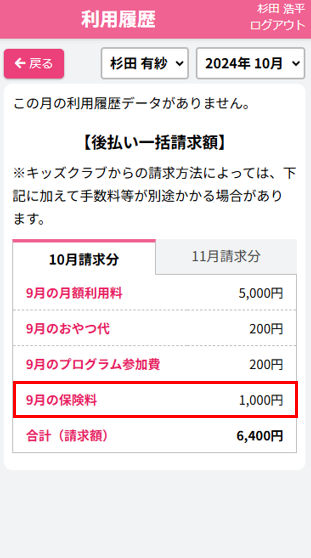 また保護者画面の利用履歴画面の後払い一括請求額に、内訳に入力した内容が料金として表示されるようになります。