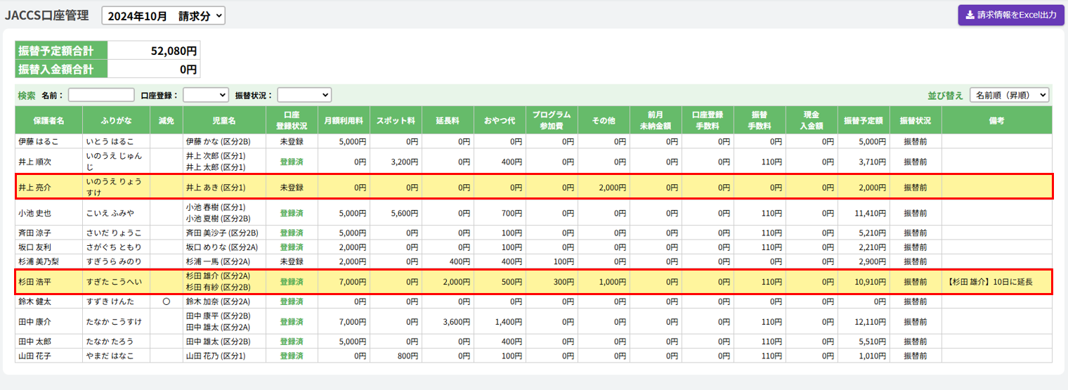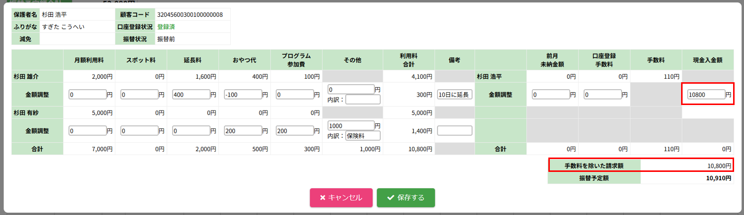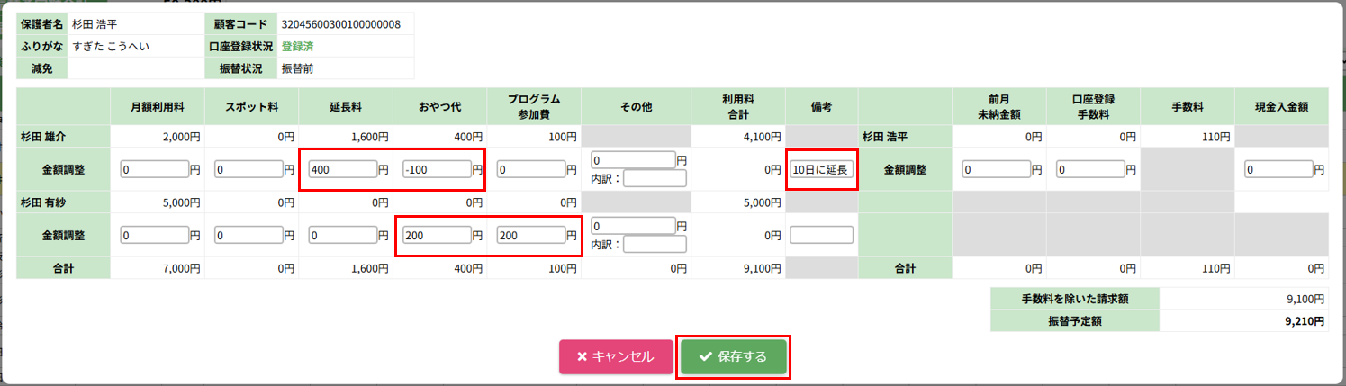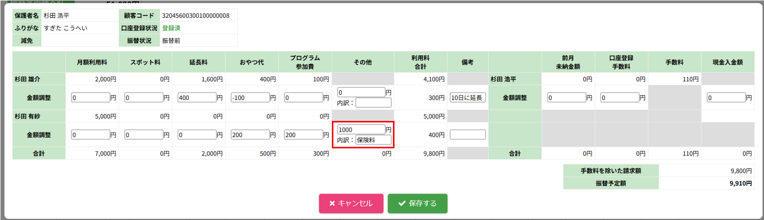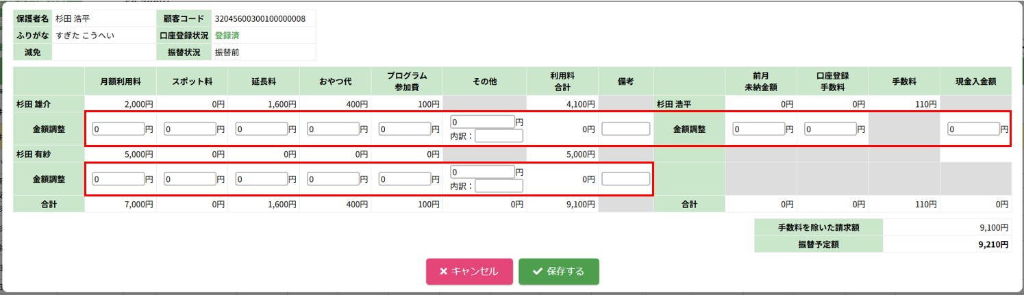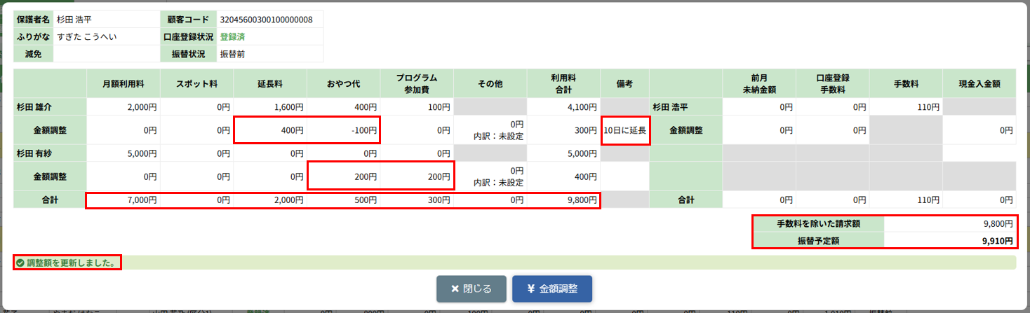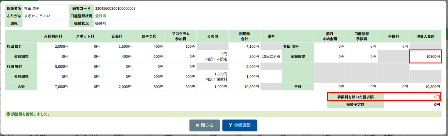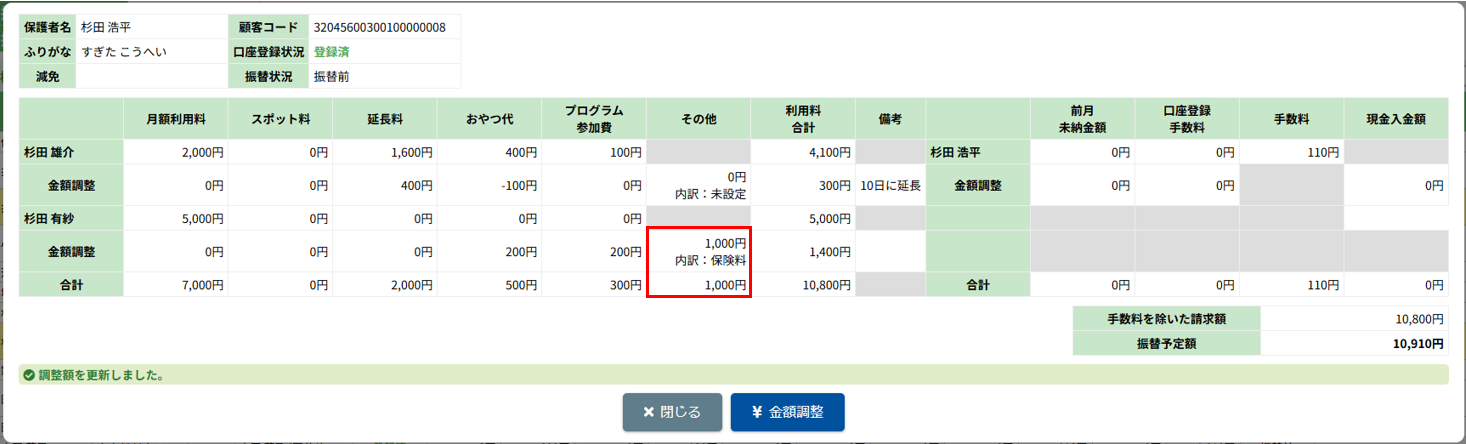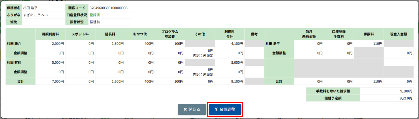 保護者をクリックし、下部にある「金額調整」ボタンを押すことで、金額調整が行えるようになります。