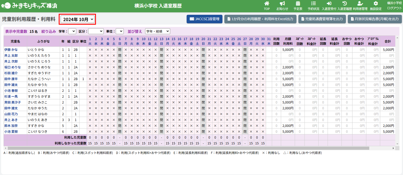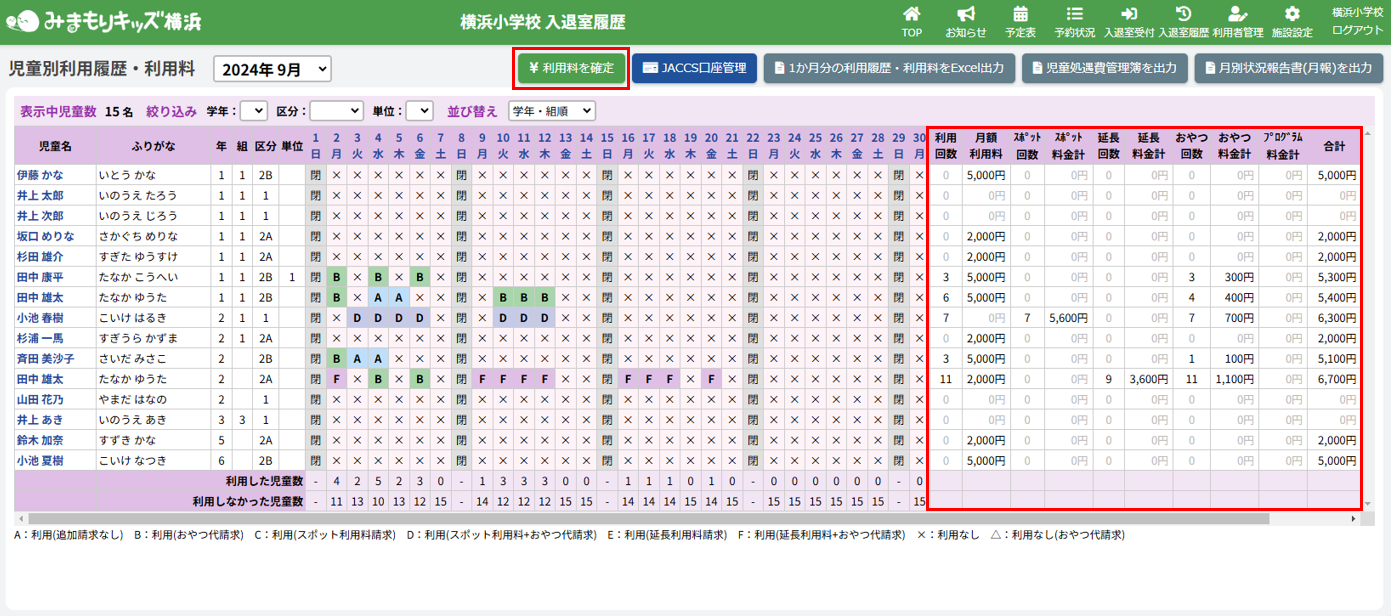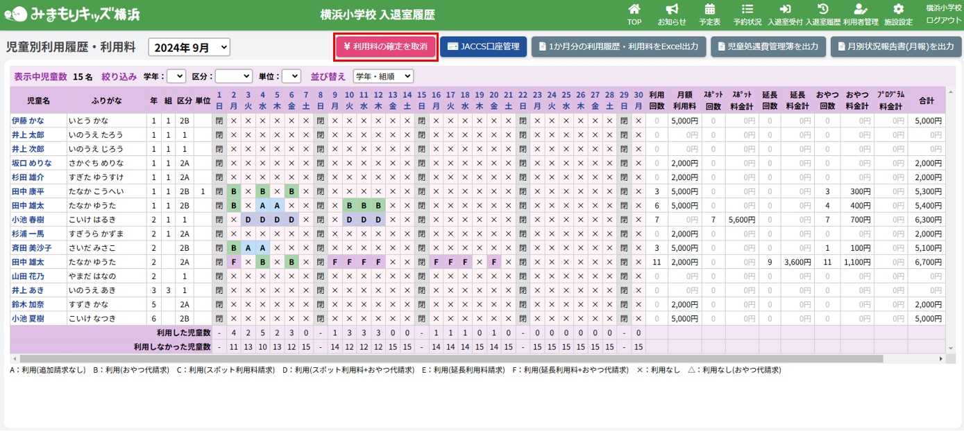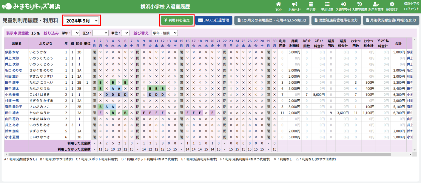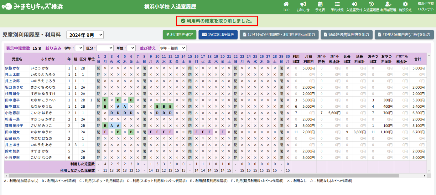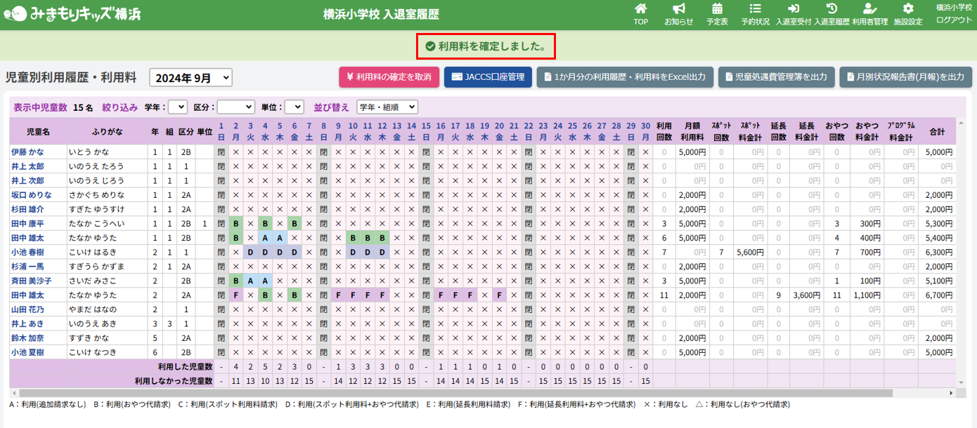 HOME > 口座振替機能 > 利用料を確定する 利用料を確定する 「利用料を確定する」とは… 月ごとに発生する利用料金を確定させるための機能です。 利用料金を確定させることで、口座振替の内訳確認や振替予定額合計を確認することができます。 1.入退室履歴画面を開く 入退室履歴画面を開いてください。 2.確定したい月を選択する 利用料の確定を行いたい月を選択してください。月の利用が終わっている月のみ「利用料を確定」ボタンが表示されます。 利用が終わっていない月には「利用料を確定」ボタンは表示されません 3.利用料を確定する 利用料金の確認を行い、問題がなければ「利用料金の確定」を押すことで利用料の確定が行われます。 「利用料を確定」ボタンを押し、確定が成功すると以下のメッセージが表示されます。 これで利用料の確定は完了です。 料金確定後は利用履歴の変更は行えないようになります。 確定後に変更を行いたい場合は、下記の利用料の確定の取り消しをご確認ください。 「利用料の確定の取り消し」について… 利用料の確定後に利用履歴に関する修正をしたい場合は、「利用料の確定を取り消す」ボタンを押すことで取消を行うことができます。 取消が完了すると、メッセージが表示されます。 これで利用履歴の変更を行うことができます。利用履歴を変更後に利用料を確定したい場合は再度「利用料を確定」ボタンを押してください。 ≪ 口座振替機能について 口座振替情報を確認する ≫