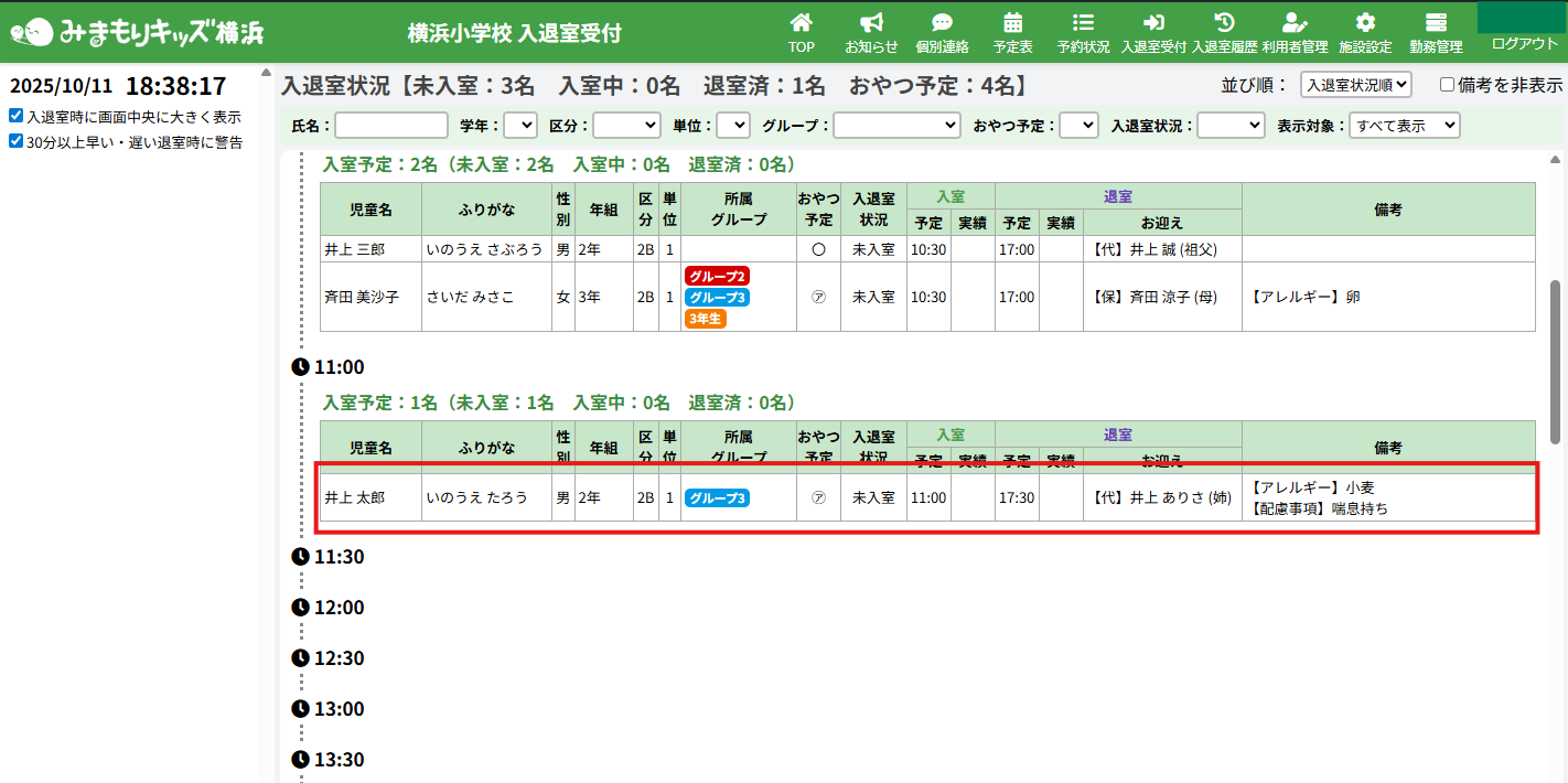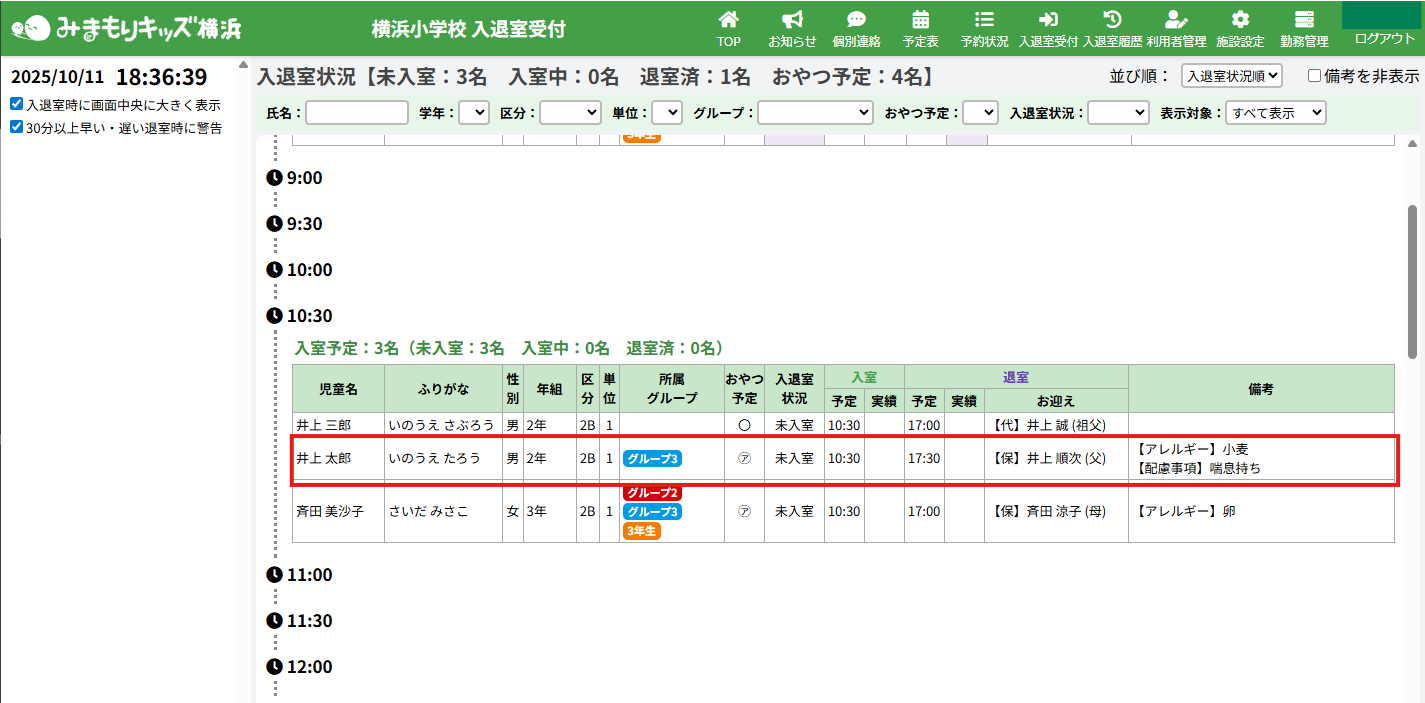 1.入退室の予定時刻・お迎え予定を変更したい児童をクリックし、詳細を開いてください。