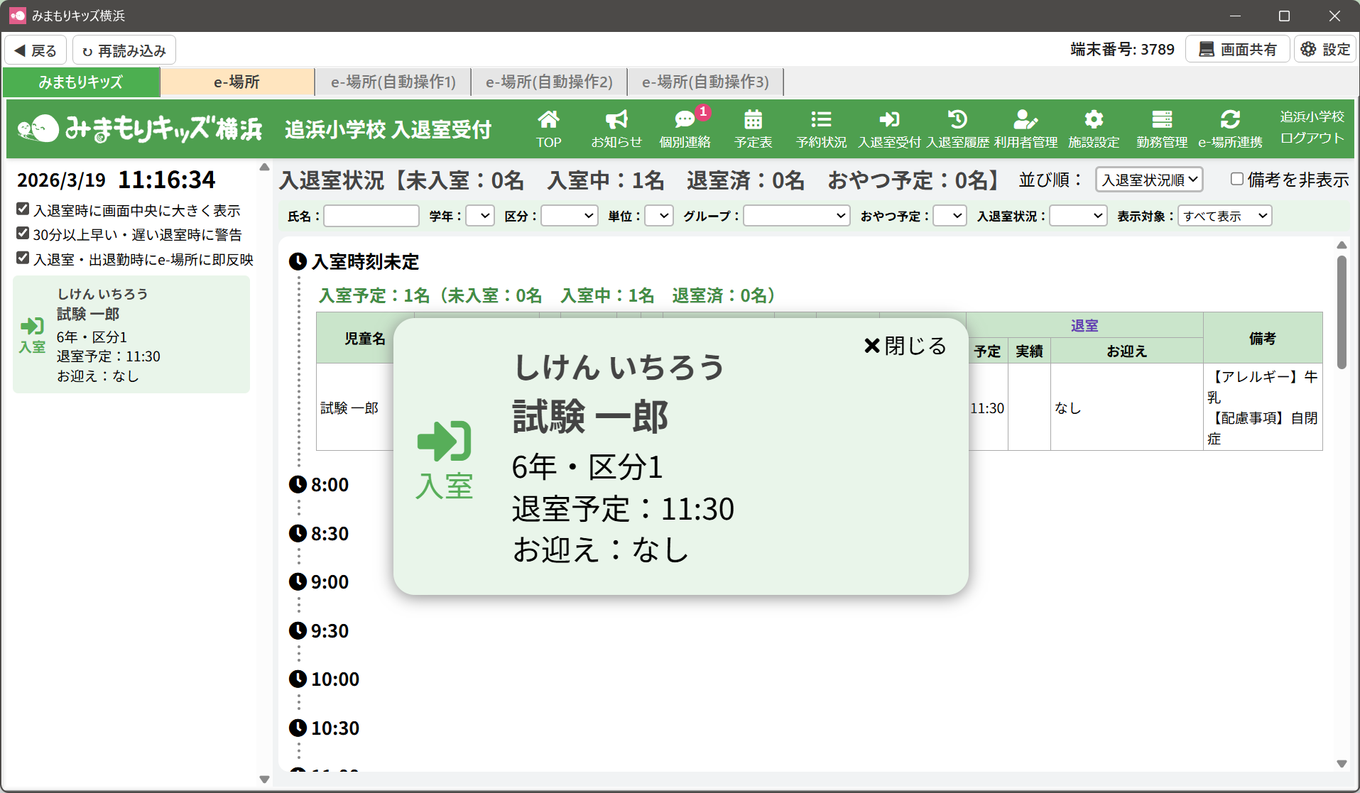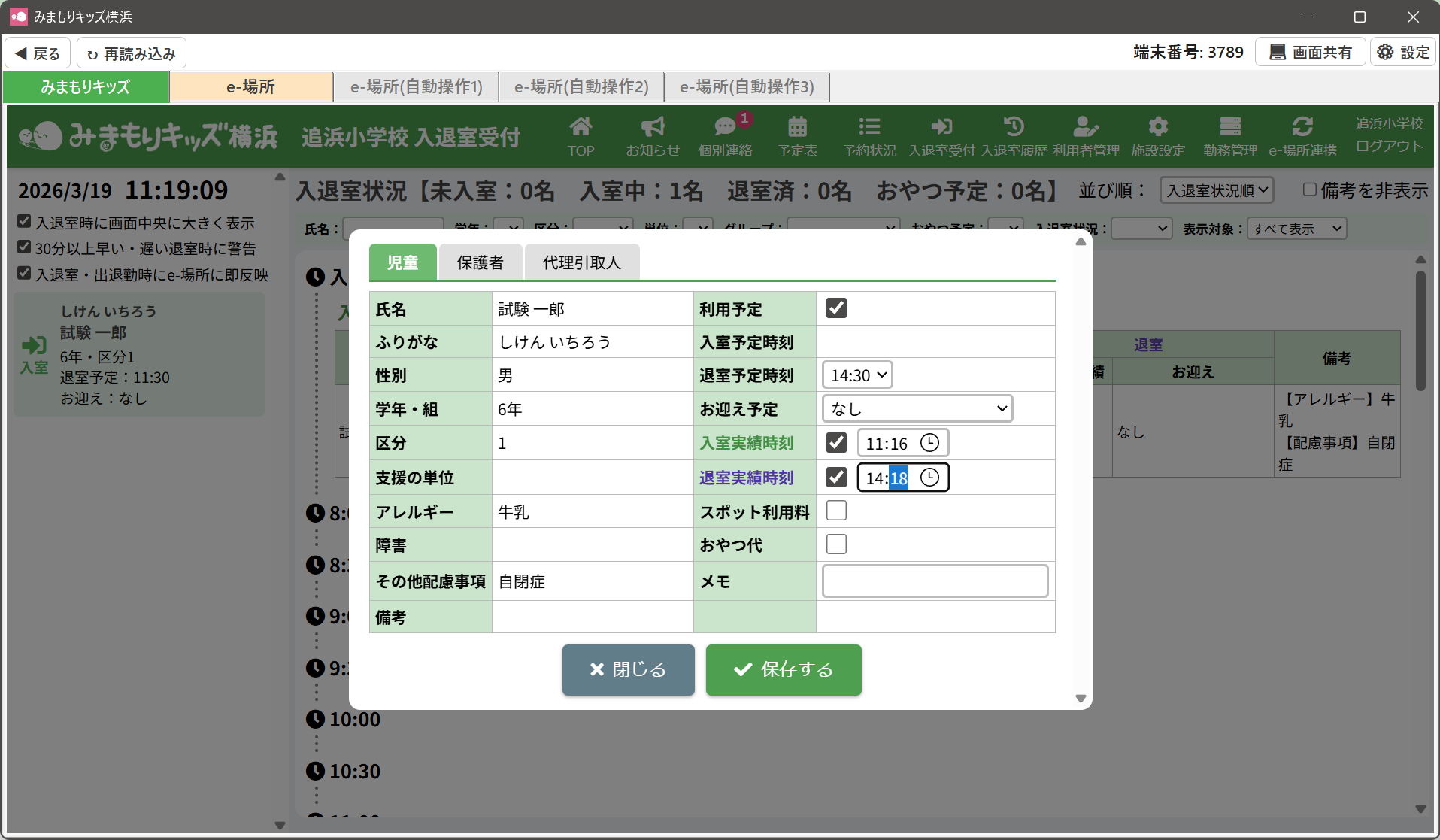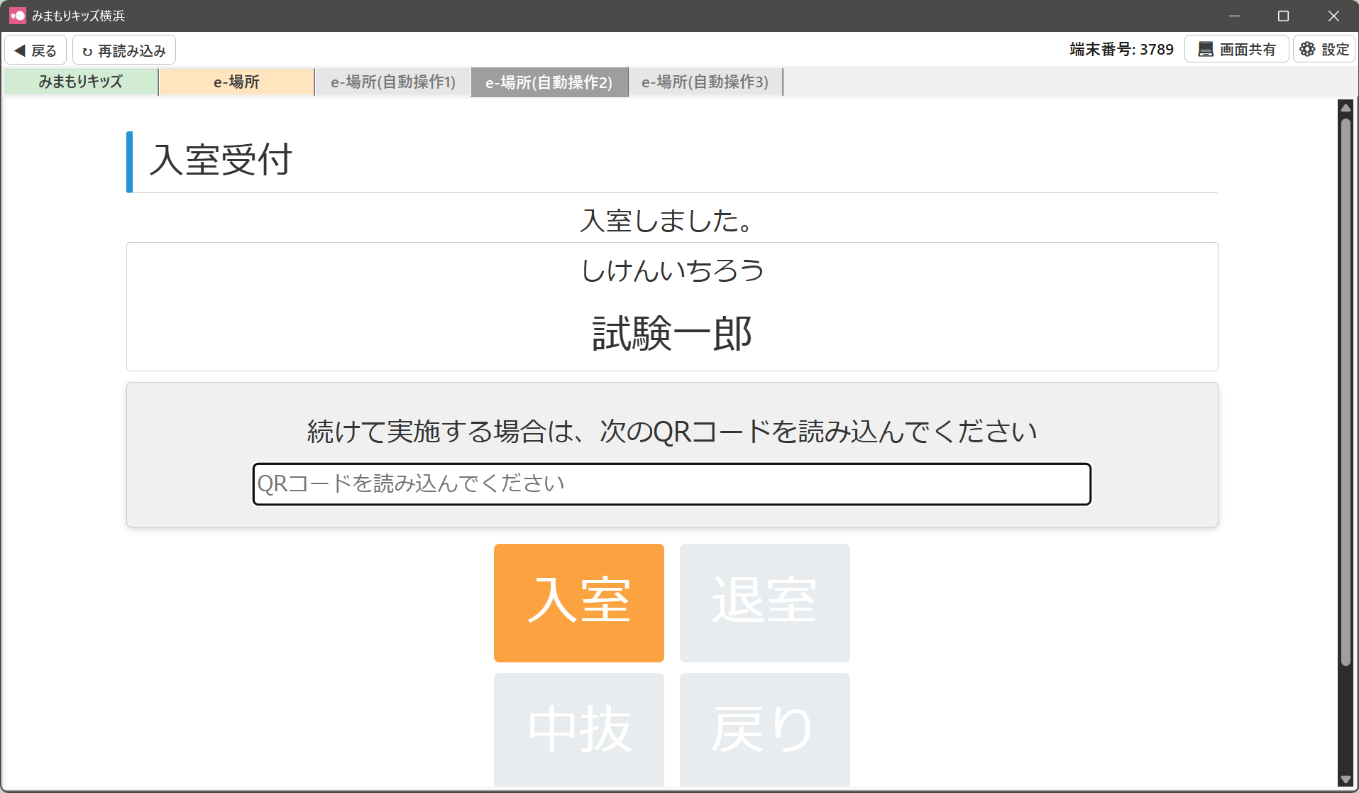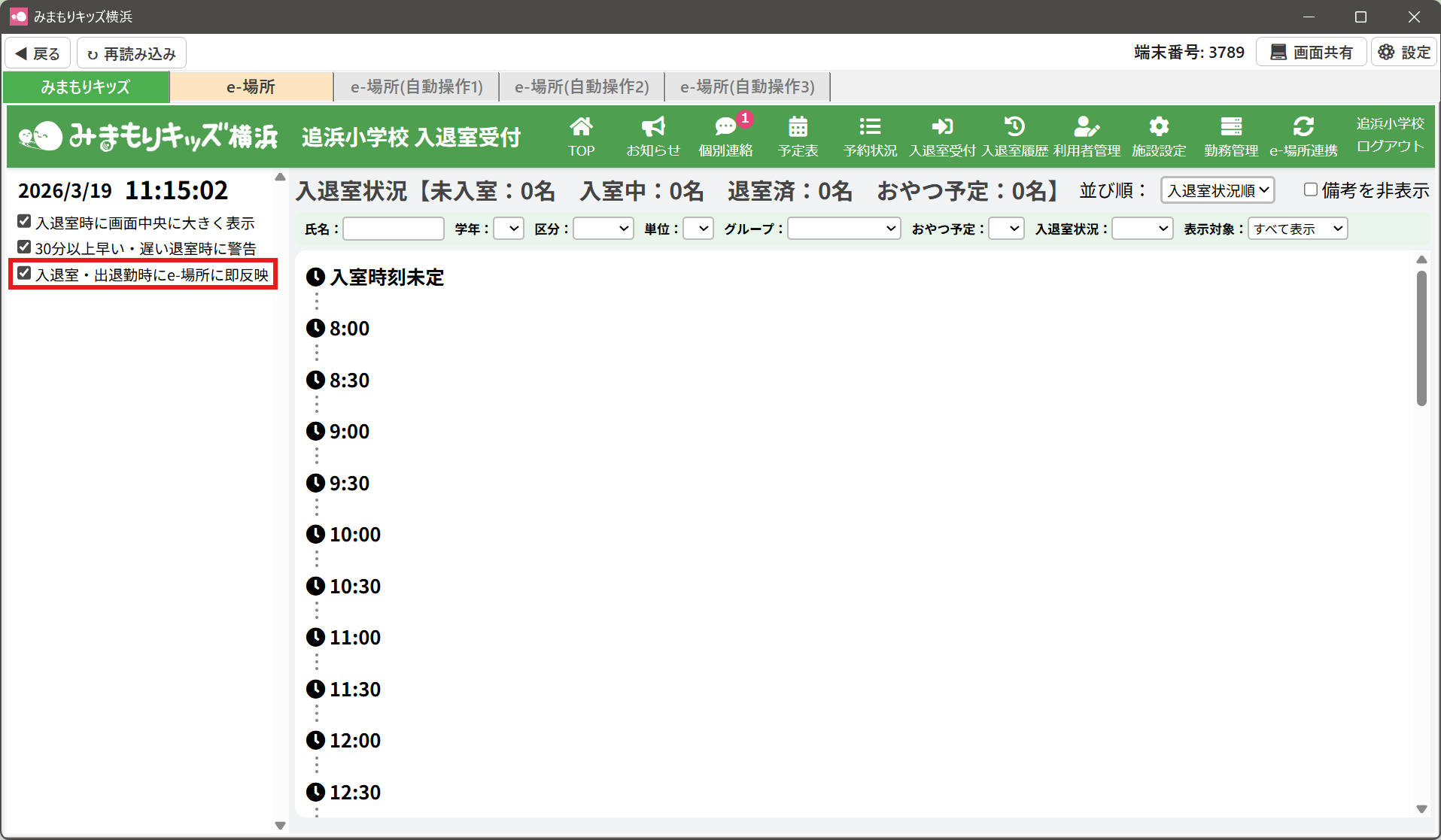 HOME > 放課後e-場所システム連携 > 入退室受付画面で入退室・出退勤のデータを放課後e-場所システムe-場所システムに連携する 入退室受付画面で入退室・出退勤のデータを放課後e-場所システムe-場所システムに連携する ①画面左側にある「入退室・出退勤時にe-場所に即反映」にチェックを入れます。 ②通常通りみまもりキッズのQRコード(名札カード)を読み込ませると、自動的にe-場所システムへ入退室・出退勤情報が連携されます。 ▼裏で自動的にe-場所システムのQRコードの送信を行います ③児童名をクリックして、手動で入退室時刻を修正した場合も、自動的にe-場所システムへ入退室・出退勤情報が連携されます。