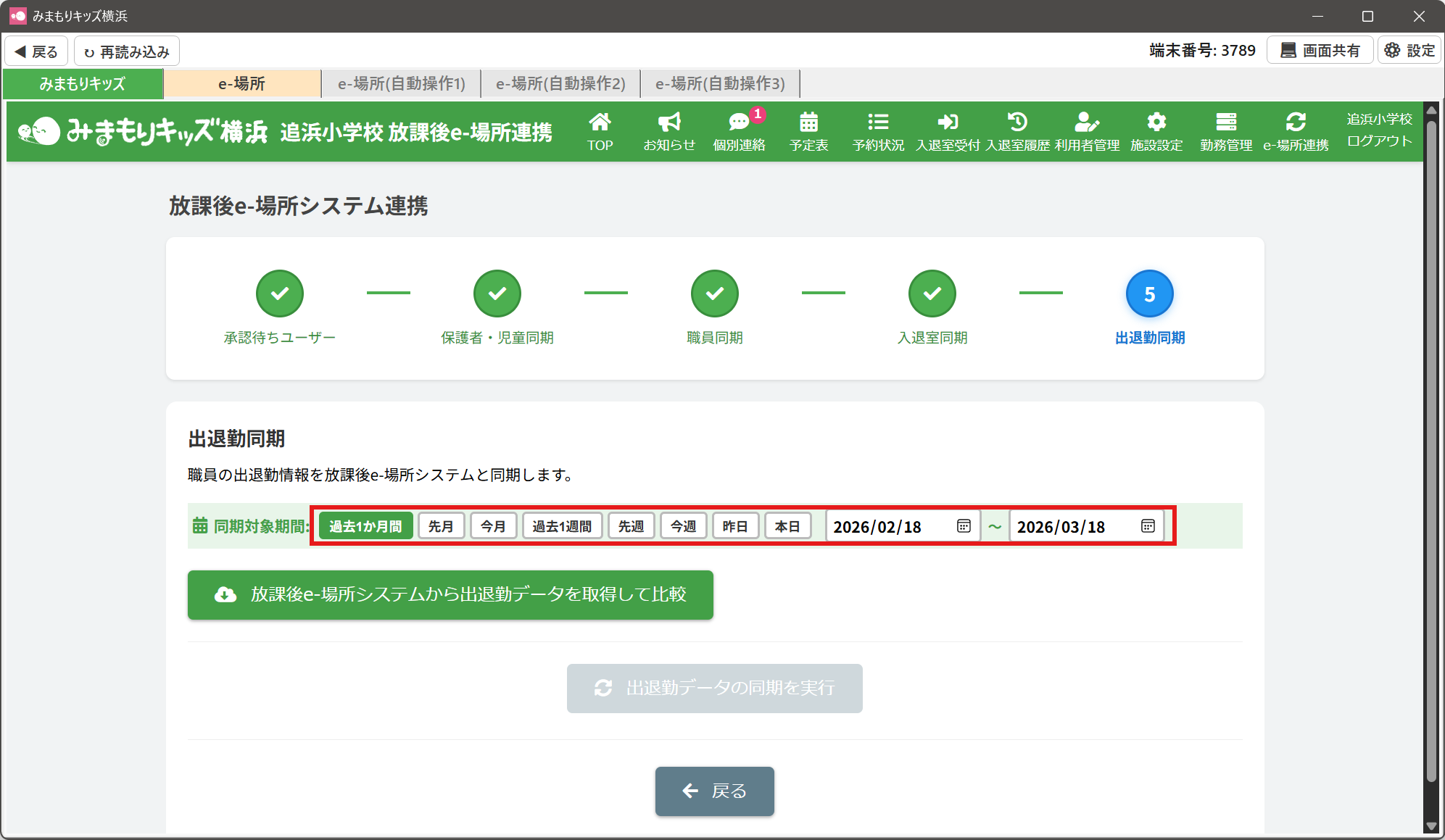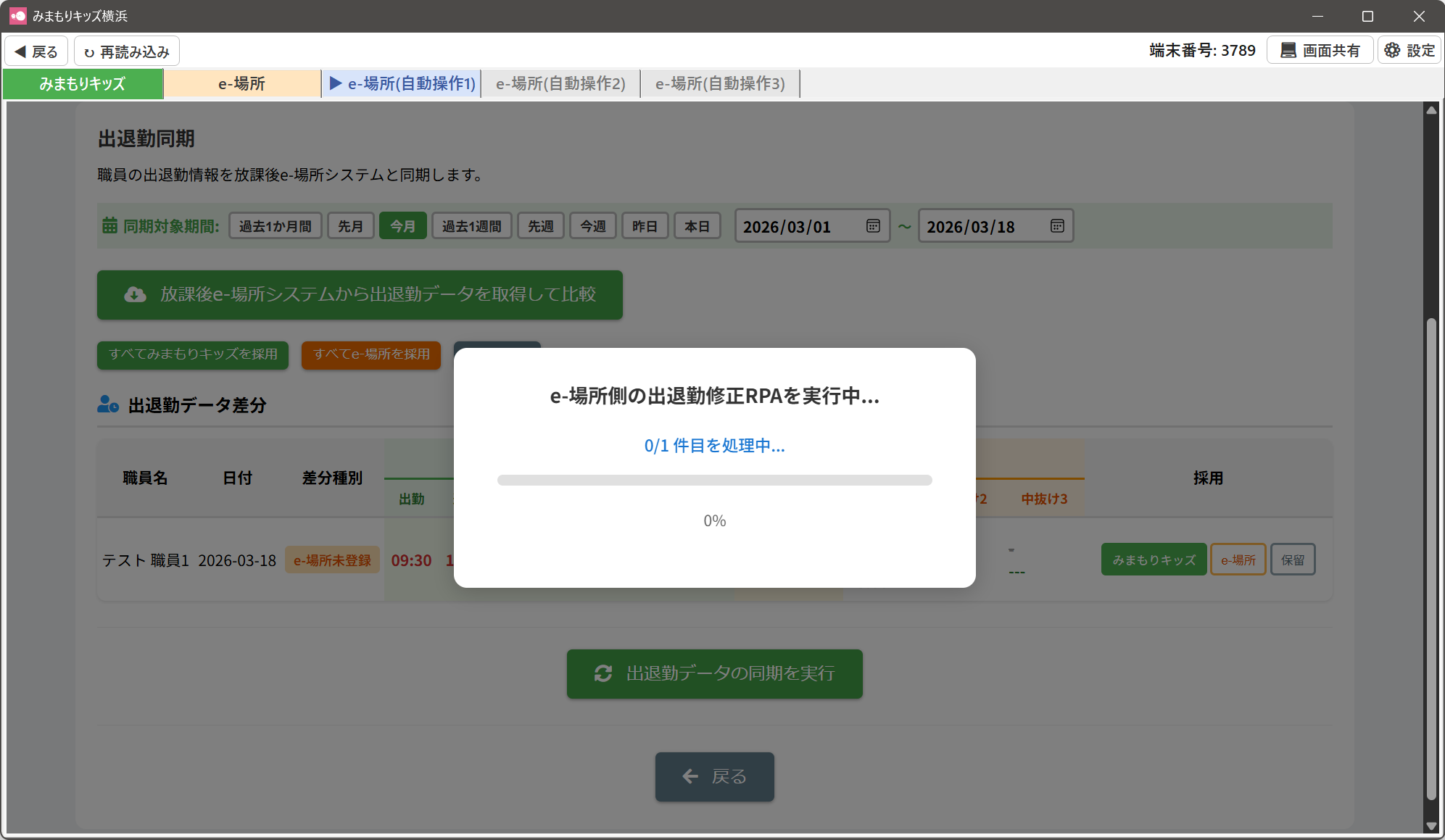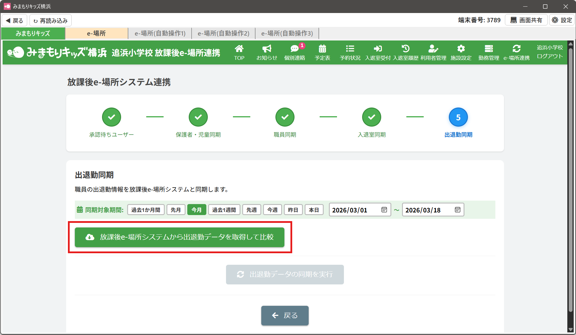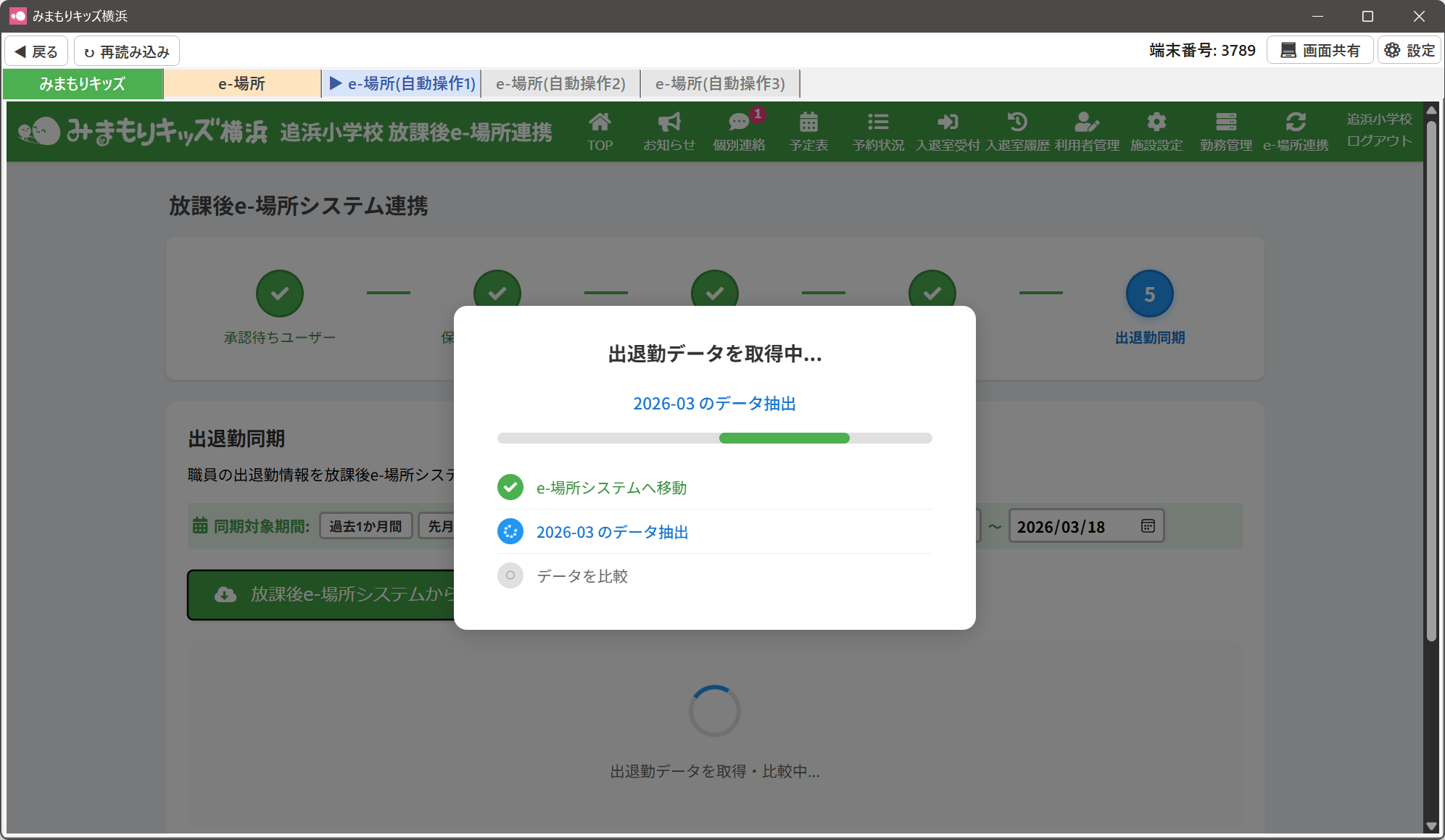 ③みまもりキッズと放課後e-場所システムの職員の出退勤データの比較が行われますので、完了までお待ちください。