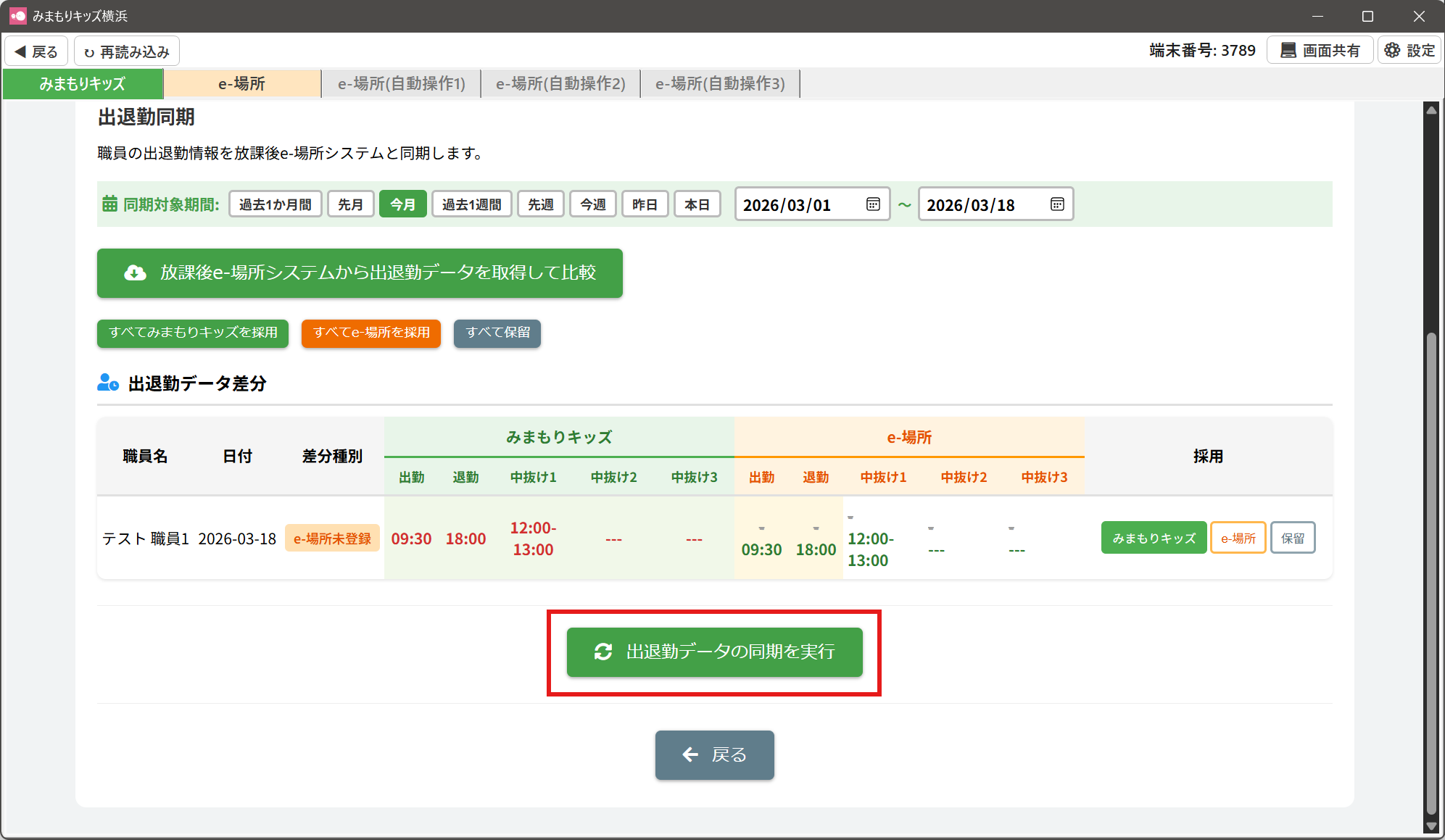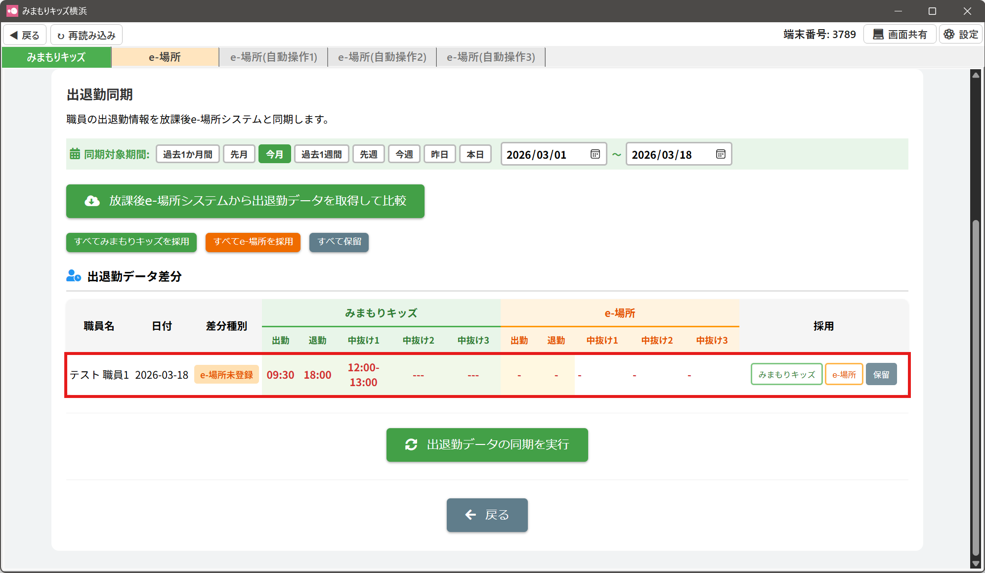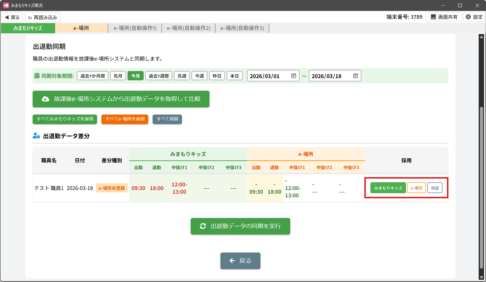 みまもりキッズ:みまもりキッズの出退勤データを採用し、e-場所システムの出退勤データを上書きします。