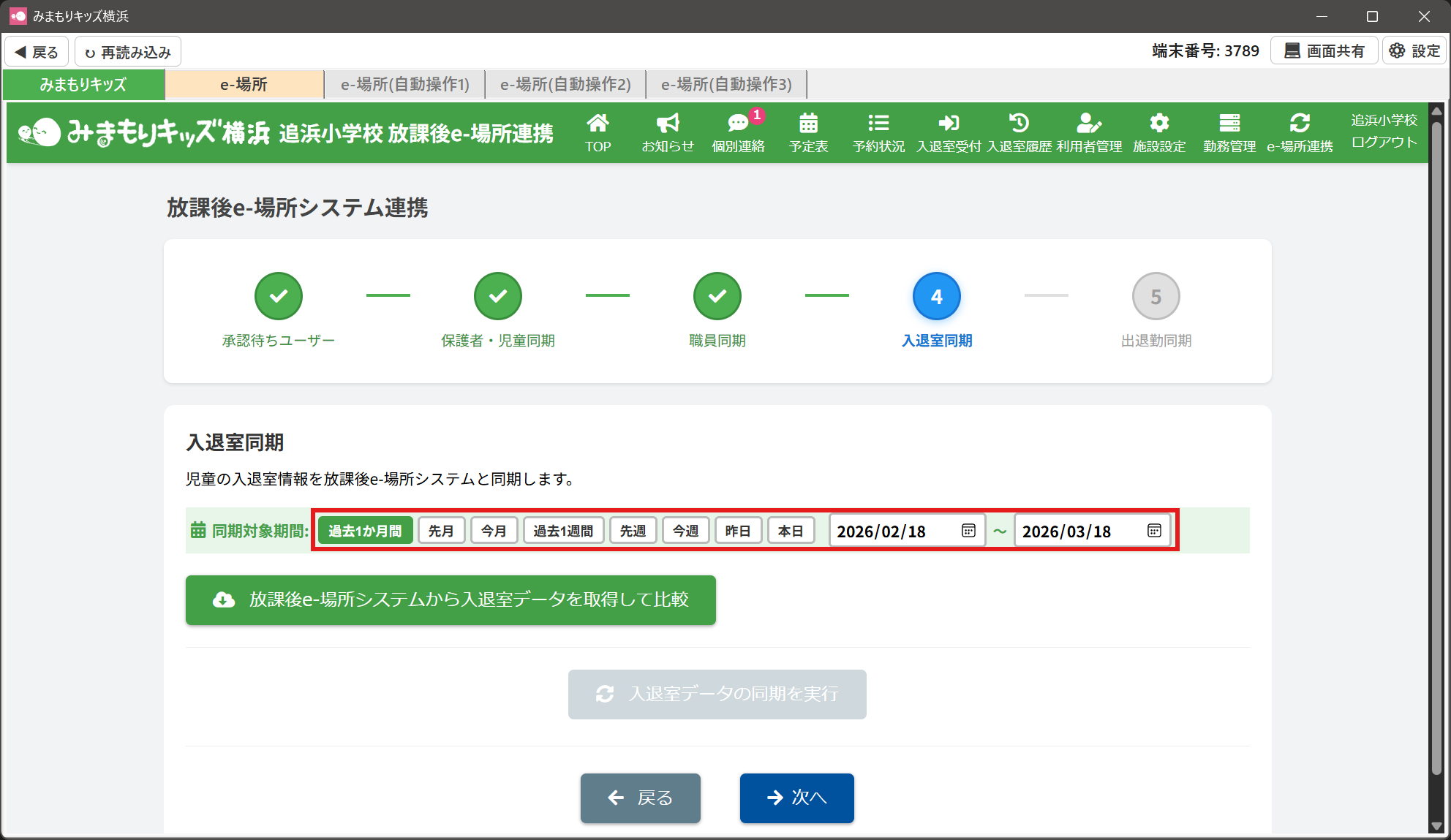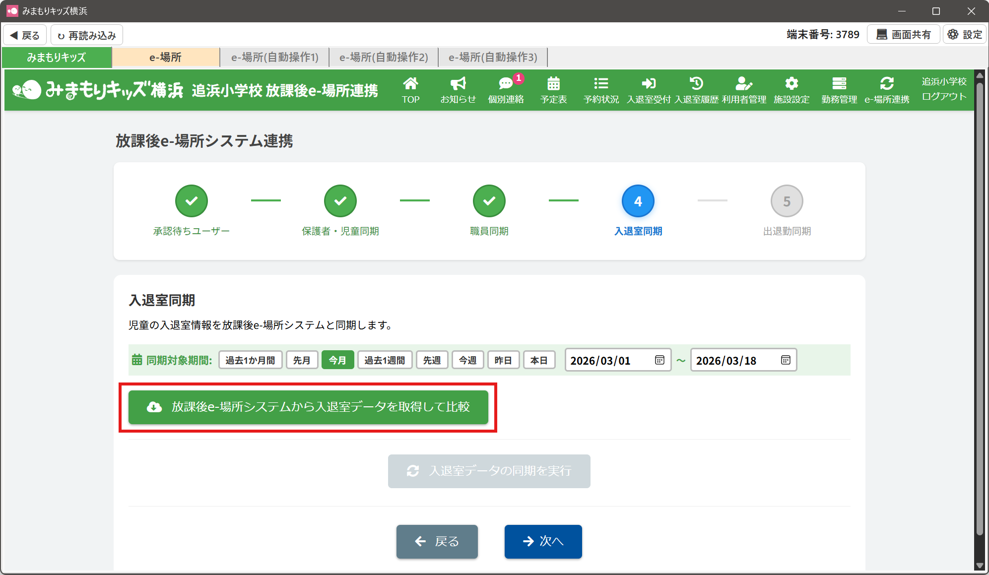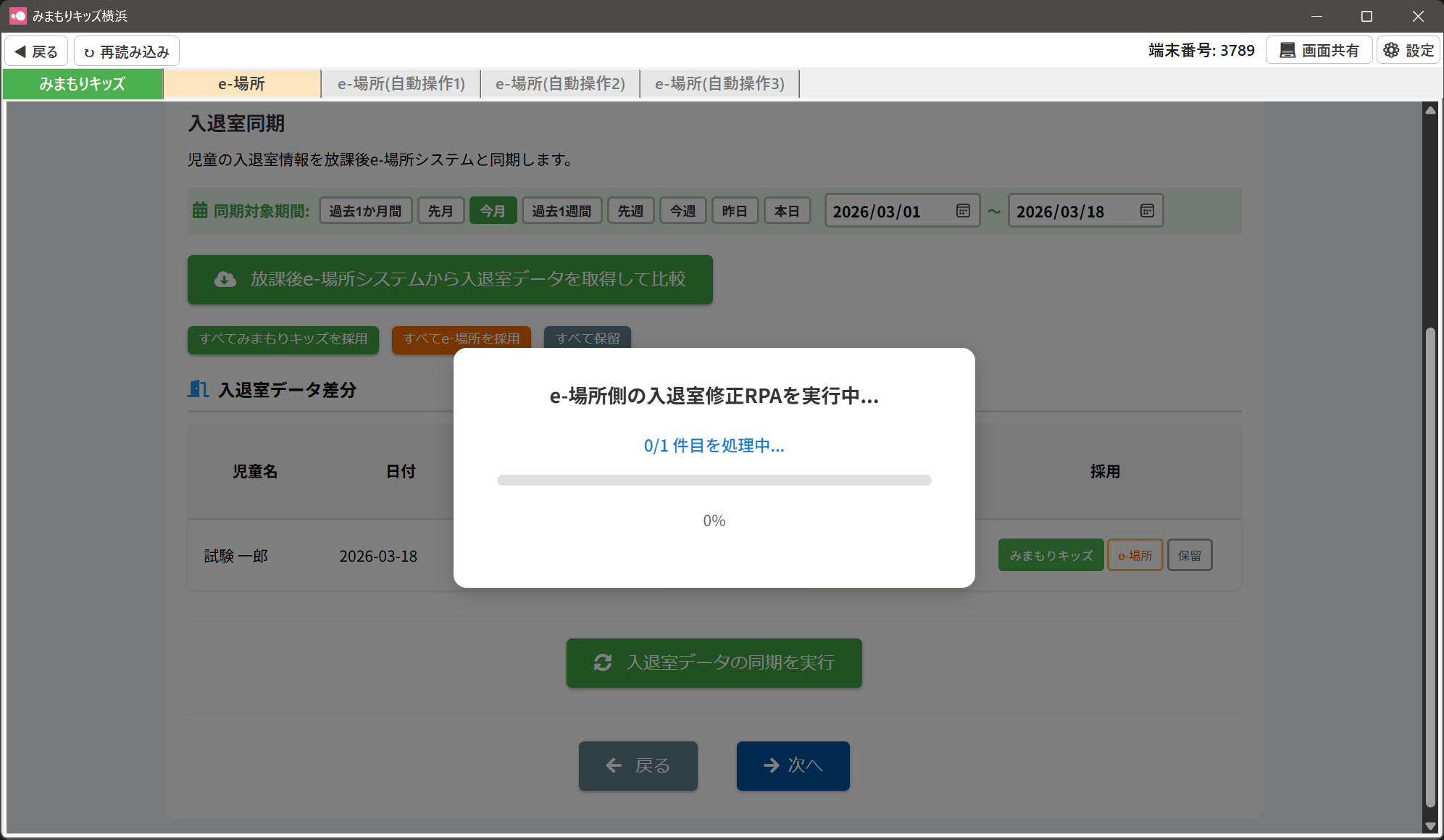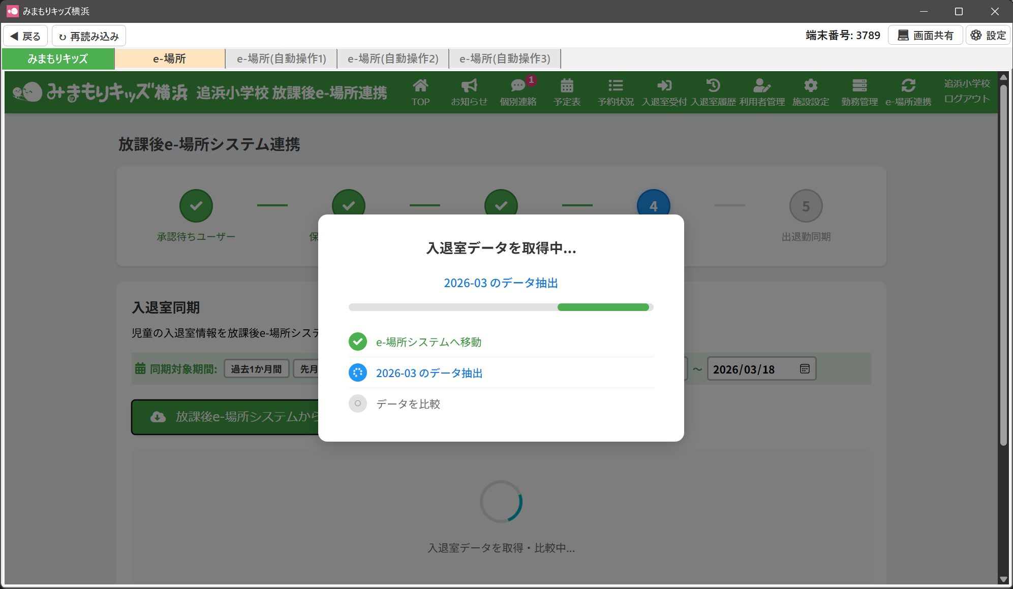 ③みまもりキッズと放課後e-場所システムの児童の入退室データの比較が行われますので、完了までお待ちください。