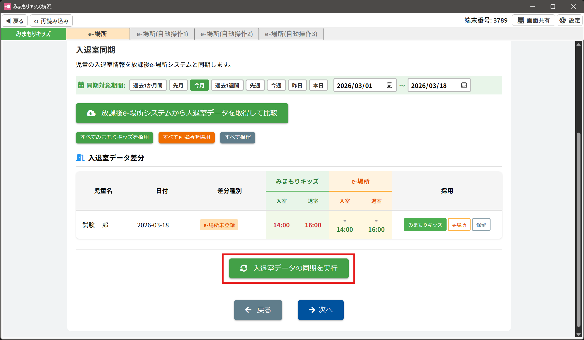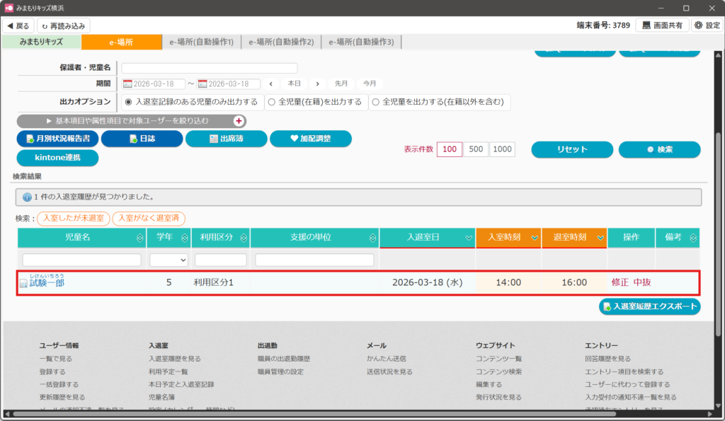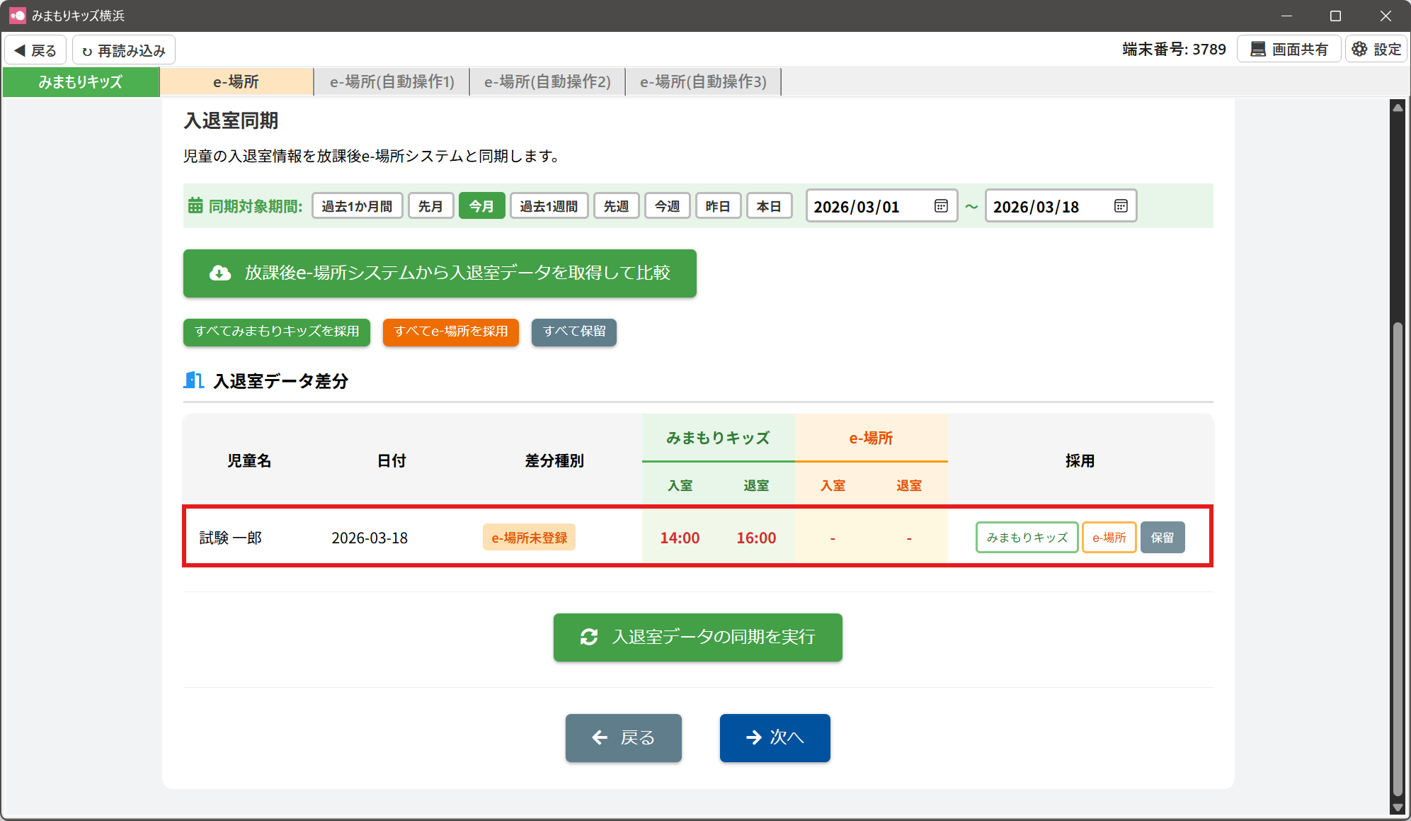 e-場所:e-場所システムの入退室データを採用し、みまもりキッズの入退室データを上書きします。