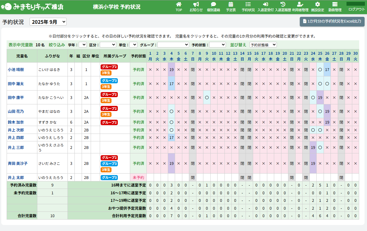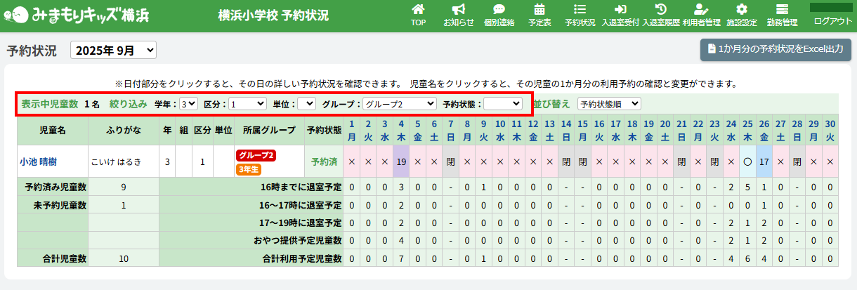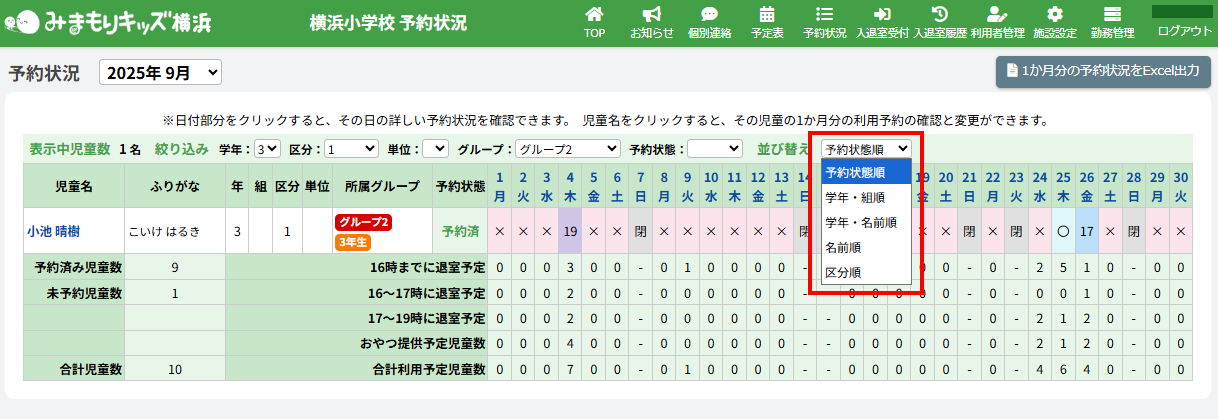HOME > 予約状況 > 予約状況を確認する 予約状況を確認する 「予約状況」とは…児童の利用予約のことです。画面上部の【予約状況】をクリックすると当月の予約状況一覧を表示します。 1か月分の予約状況、日付別の予約状況、児童別の予約状況を確認することができます。 確認したい月を選択する 予約状況の確認を行いたい月を選択し、予約状況を確認してください。表記について詳しくは下記の表をご確認ください。 〇 16時までに退室予定の児童を指します。 × その日は利用予定がない児童を指します。 17 16~17時までに退室予定の児童を指します。 19 17~19時までに退室予定の児童を指します。 閉 施設が閉所していることを指します。 <絞り込み機能> 一覧の中から特定の児童を探すための絞り込み機能があります。 絞り込み機能は2項目以上を組み合わせて使うこともできます。 (例:3学年+区分1+グループ2…3学年かつ区分1のグループ2に所属している児童のみが表示されます。) <並び替え機能> 一覧の中から特定の児童を探しやすく整理するための機能です。 指定した並び替えの順番はページを移動しても維持されます。並び替えの詳細については下記の表をご確認ください。 予約状態順 予約状態が予約済の児童と未予約の児童を並び替えて表示します。 学年・組順 学年・組が若い順に並び替えて表示します。 学年・名前順 学年が若い順、名前順に並び替えて表示します。 名前順 名前順に並び替えて表示します。 区分順 区分1、区分2A、区分2Bの順に並び替えて表示します。 児童別予約状況を確認、更新する ≫