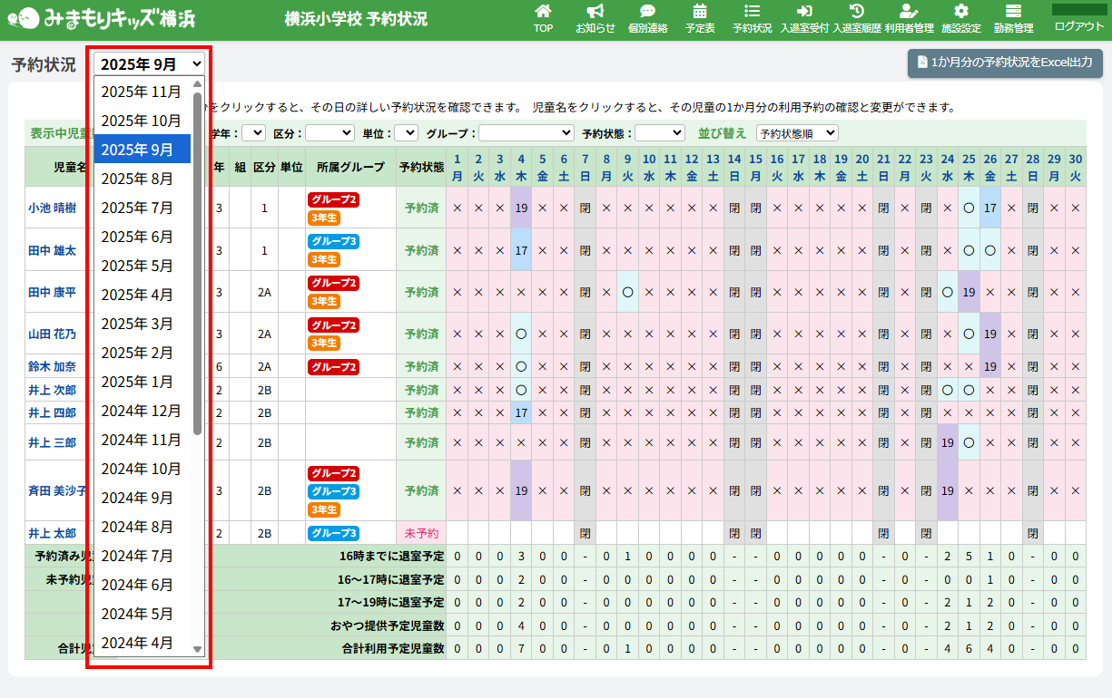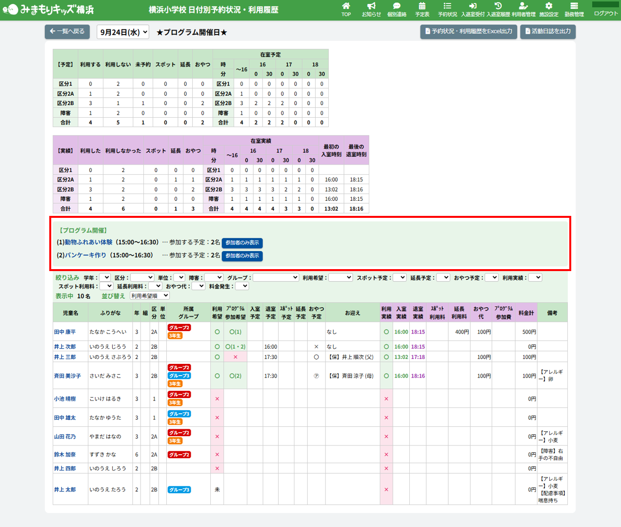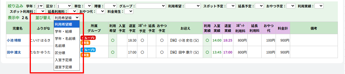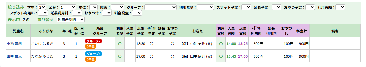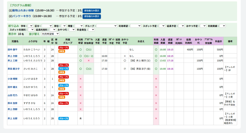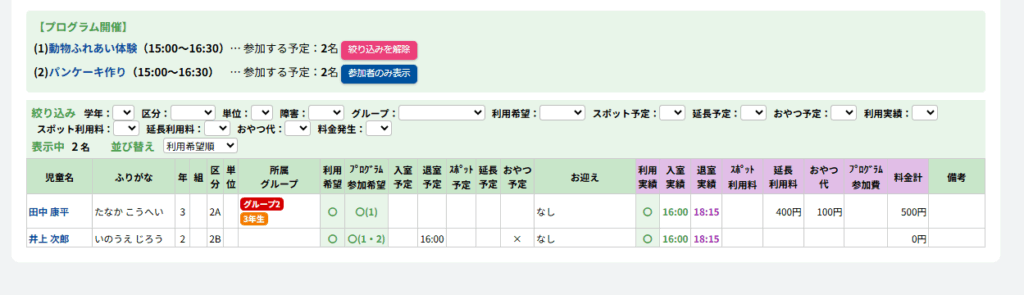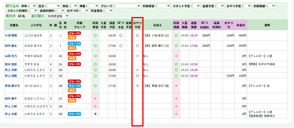 HOME > 予約状況 > 日付別予約状況を確認する 日付別予約状況を確認する 1.日付別予約状況を確認したい月を選択する 予約状況を確認したい月を選択してください。 2.日付別予約確認ページを開く 予約状況の一覧から、予約状況を確認したい日付をクリックしてください。 3.予約の確認を行う その日の利用予約を確認することができます。 <おやつ予定欄の表示について> おやつの提供予定状態を確認する欄です。おやつ予定のステータスについては下記の表をご確認ください。 空欄 当日のおやつ提供予定がない。 〇 当日のおやつ提供予定がある。 ㋐ 当日のおやつ提供予定がある、何かしらのアレルギーを持つ児童である。 ✕ 通年でおやつ提供予定がない。(利用者管理画面でおやつをなしに設定している) <時間帯ごとの在室人数の確認> 日付別予約状況・利用履歴画面の上部に時間帯ごとの在室人数が表示されています。上の表が在室予定で、その下の2つ目の表が在室実績を表示しています。在室実績には最初に入室・退室した時刻も表示されています。 <絞り込み機能> 一覧の中から特定の児童を探すための絞り込み機能があります。 絞り込み機能は2項目以上を組み合わせて使うこともできます。(例:3学年+区分1…3学年かつ区分1の児童のみが表示されます。) <並び替え機能> 一覧の中から特定の児童を探しやすく整理するための機能です。 指定した並び替えの順番はページを移動しても維持されます。並び替えの詳細については下記の表をご確認ください。 利用希望順 利用希望の有(〇)・無(×)で児童を並び替えて表示します。 学年・組順 学年・組が若い順に並び替えて表示します。 学年・名前順 学年が若い順かつ名前順に並び替えて表示します 名前順 名前順に並び替えて表示します。 区分順 区分1、区分2A、区分2Bの順に並び替えて表示します。 入室予定順 入室予定の時間が早い順に並び替えて表示します。 退室予定順 退室予定の時間が早い順に並び替えて表示します。 <プログラム開催日の場合> プログラムが開催される日には、プログラム内容とプログラム参加希望欄が追加されます。プログラムの参加人数と参加する児童を確認することができます。 <プログラム参加者での絞り込み> プログラムに参加する児童のみを表示することができます。 プログラム名の横に表示されている「参加者のみ表示」というボタンを押すことによって絞り込むことができます。 絞り込み後、「絞り込みを解除」というボタンを押すことによって絞り込みを解除することができます。 ≪ 児童別予約状況を確認、更新する 日付別予約状況・利用履歴を出力する ≫