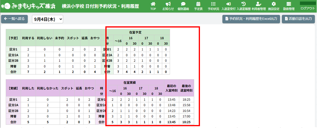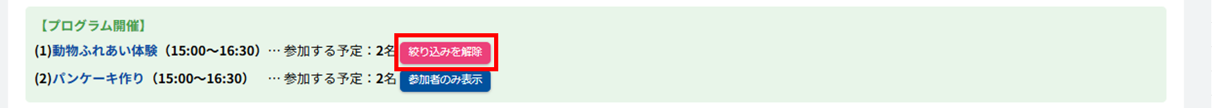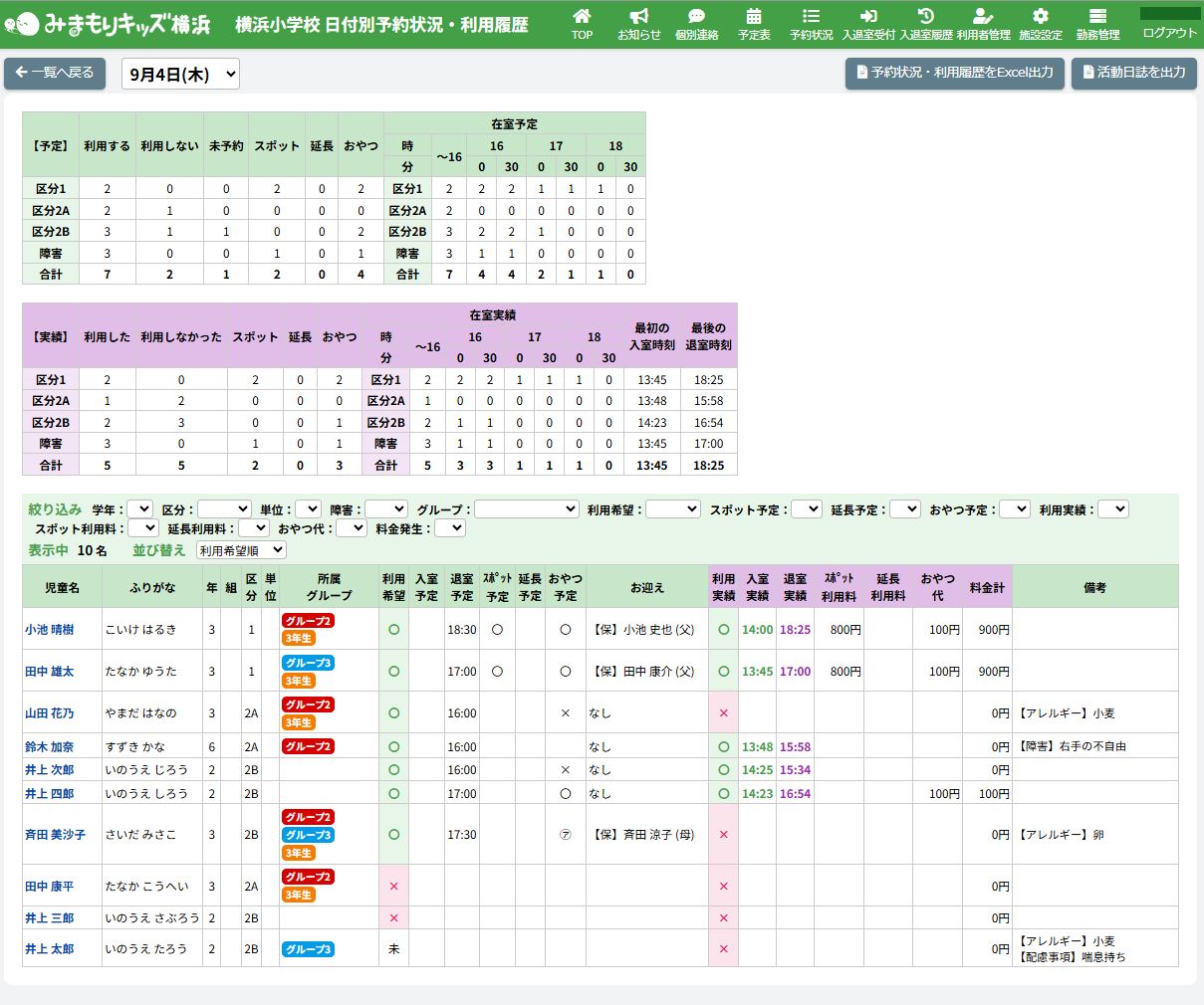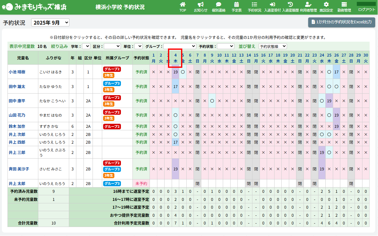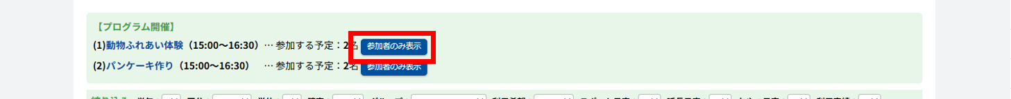 HOME > 予約状況 > 日付別予約状況を確認する 日付別予約状況を確認する 1.日付別予約状況を確認したい月を選択する 予約状況を確認したい月を選択してください。 2.日付別予約確認ページを開く 予約状況の一覧から、予約状況を確認したい日付をクリックしてください。 3.予約の確認を行う その日の利用予約を確認することができます。 <おやつ予定欄の表示について> おやつの提供予定状態を確認する欄です。おやつ予定のステータスについては下記の表をご確認ください。 空欄 当日のおやつ提供予定がない。 〇 当日のおやつ提供予定がある。 ㋐ 当日のおやつ提供予定がある、何かしらのアレルギーを持つ児童である。 ✕ 通年でおやつ提供予定がない。(利用者管理画面でおやつをなしに設定している) <時間帯ごとの在室人数の確認> 日付別予約状況・利用履歴画面の上部に時間帯ごとの在室人数が表示されています。上の表が在室予定で、その下の2つ目の表が在室実績を表示しています。在室実績には最初に入室・退室した時刻も表示されています。 <絞り込み機能> 一覧の中から特定の児童を探すための絞り込み機能があります。 絞り込み機能は2項目以上を組み合わせて使うこともできます。(例:3学年+区分1…3学年かつ区分1の児童のみが表示されます。) <並び替え機能> 一覧の中から特定の児童を探しやすく整理するための機能です。 指定した並び替えの順番はページを移動しても維持されます。並び替えの詳細については下記の表をご確認ください。 利用希望順 利用希望の有(〇)・無(×)で児童を並び替えて表示します。 学年・組順 学年・組が若い順に並び替えて表示します。 学年・名前順 学年が若い順かつ名前順に並び替えて表示します 名前順 名前順に並び替えて表示します。 区分順 区分1、区分2A、区分2Bの順に並び替えて表示します。 入室予定順 入室予定の時間が早い順に並び替えて表示します。 退室予定順 退室予定の時間が早い順に並び替えて表示します。 <プログラム開催日の場合> プログラムが開催される日には、プログラム内容とプログラム参加希望欄が追加されます。プログラムの参加人数と参加する児童を確認することができます。 <プログラム参加者での絞り込み> プログラムに参加する児童のみを表示することができます。 プログラム名の横に表示されている「参加者のみ表示」というボタンを押すことによって絞り込むことができます。 絞り込み後、「絞り込みを解除」というボタンを押すことによって絞り込みを解除することができます。 ≪ 児童別予約状況を確認、更新する 日付別予約状況・利用履歴を出力する ≫