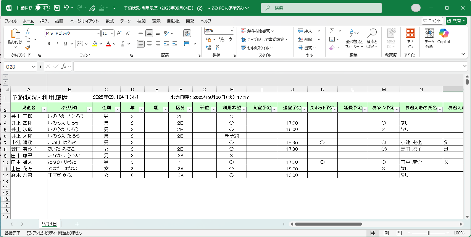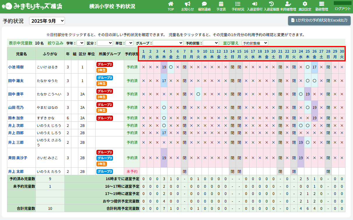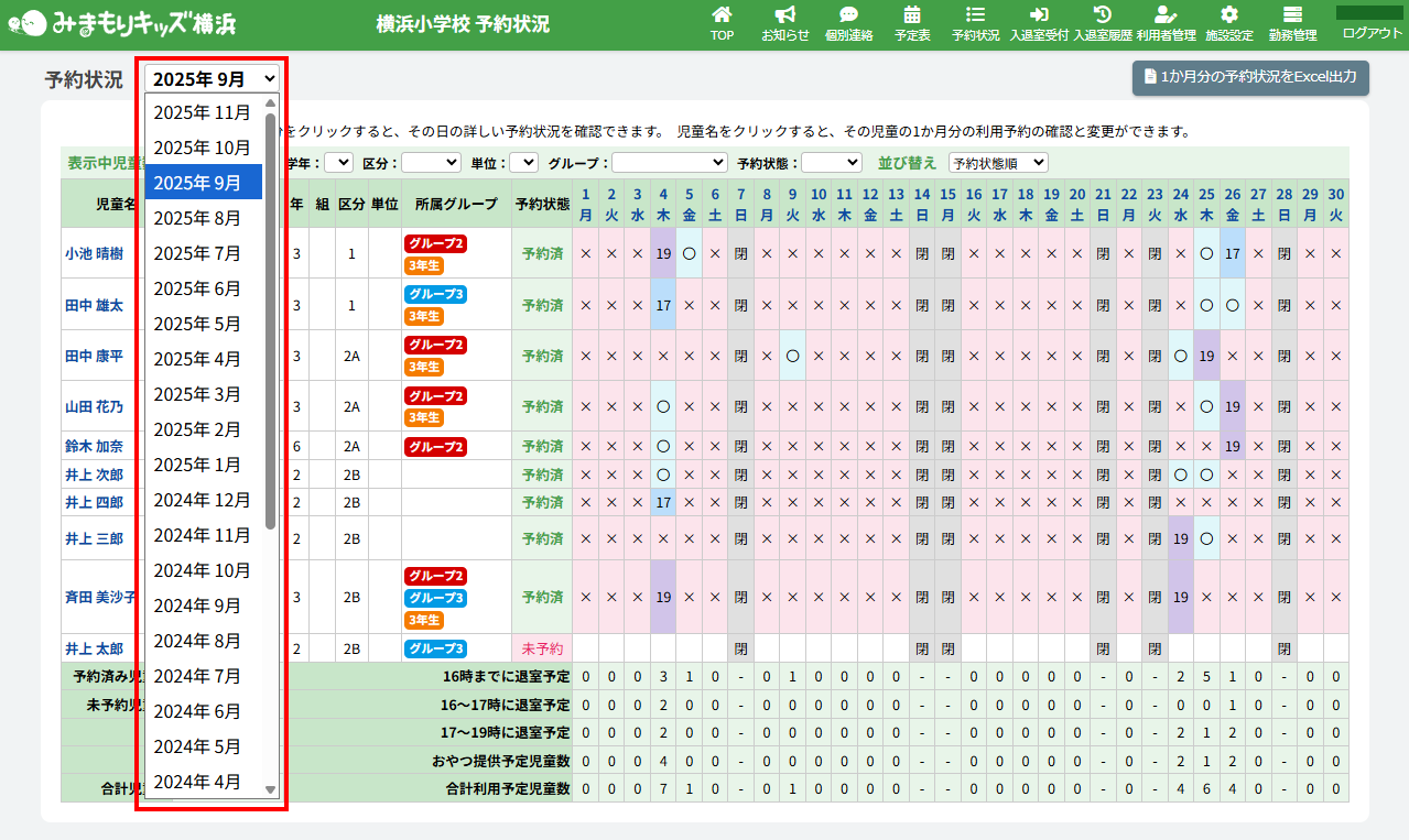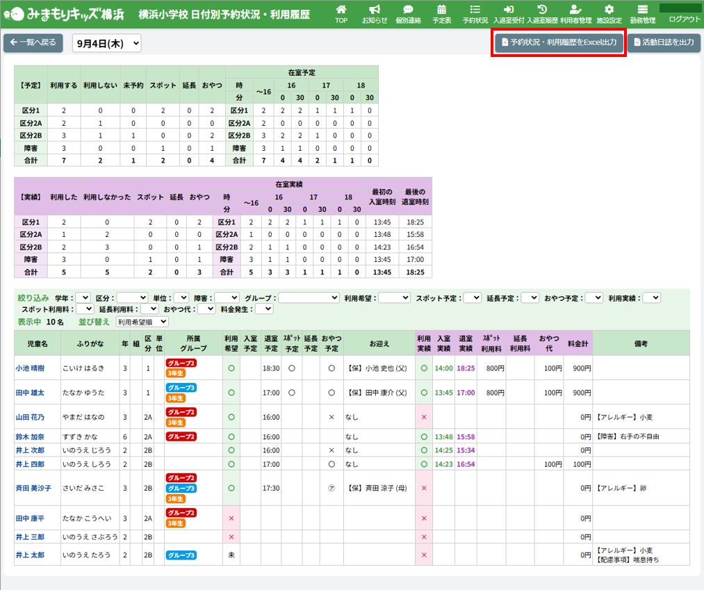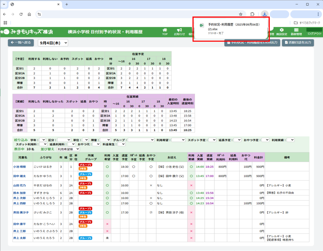 HOME > 予約状況 > 日付別予約状況・利用履歴を出力する 日付別予約状況・利用履歴を出力する 1.日付別予約状況・利用履歴を出力したい月を選択する 予約状況・利用履歴を出力したい月を選択してください。 2.日付別予約状況確認ページを開く 予約状況の一覧から、予約状況・利用履歴を出力したい日付をクリックしてください。 3.日付別予約状況・利用履歴の出力を実行する 画面右上の【予約状況・利用履歴をExcel出力】ボタンをクリックしてください。 4.出力されたExcelデータを開く 出力されたデータが自動でダウンロードされます。画面右上(Google Chromeの場合)のダウンロードファイルをクリックしてExcelデータを開いてください。 予約状況と利用履歴がまとまった表になり、出力されます。データの管理や印刷の際にお使いください。 ≪ 日付別予約状況を確認する 1カ月分の予約状況を出力する ≫