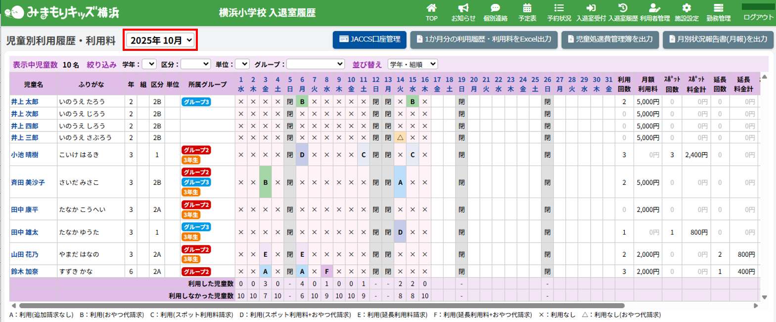 児童が施設を利用した実績のことです。画面上部の【入退室履歴】をクリックすると当月の入退室履歴一覧を表示します。