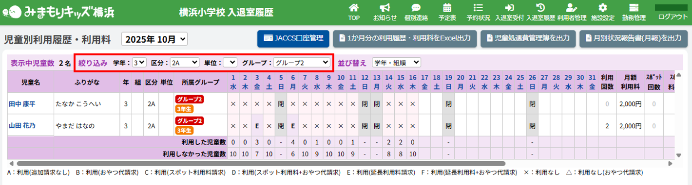 一覧の中から特定の児童を探すための絞り込み機能があります。