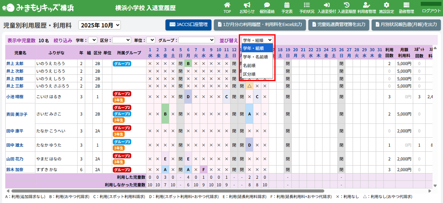 | 学年・名前順 | 学年が若い順、名前順に並び替えて表示します。 |