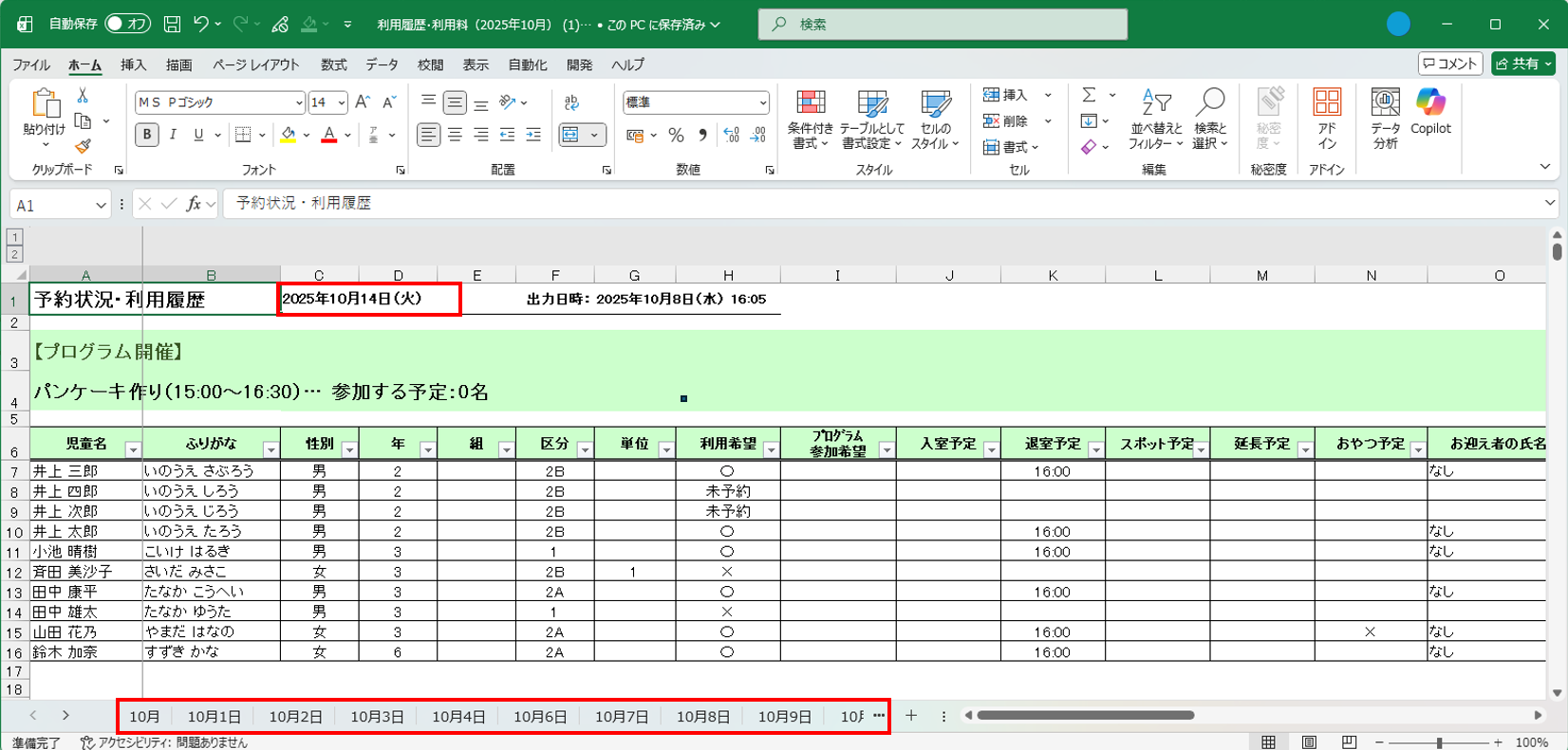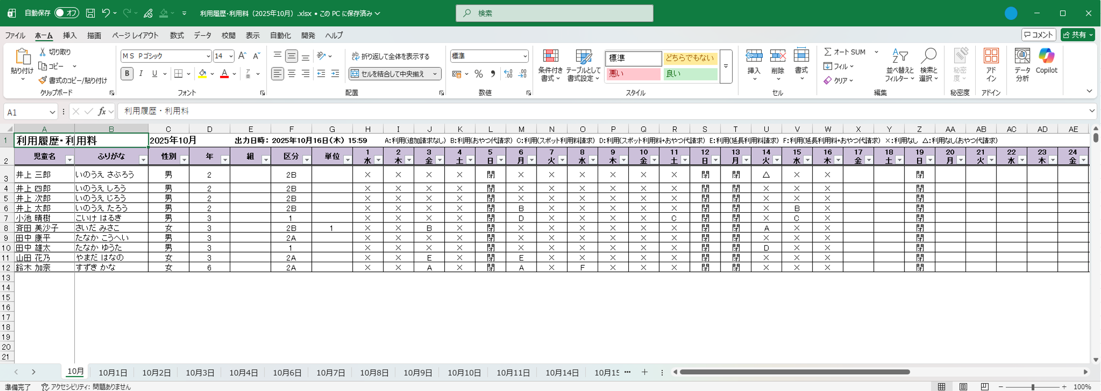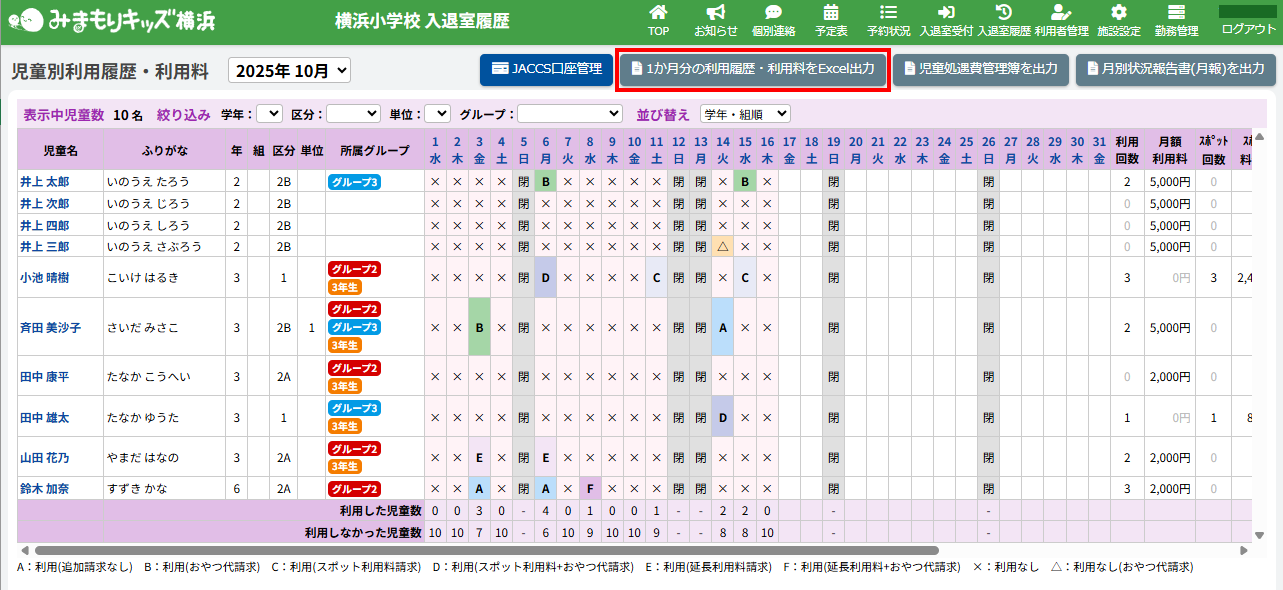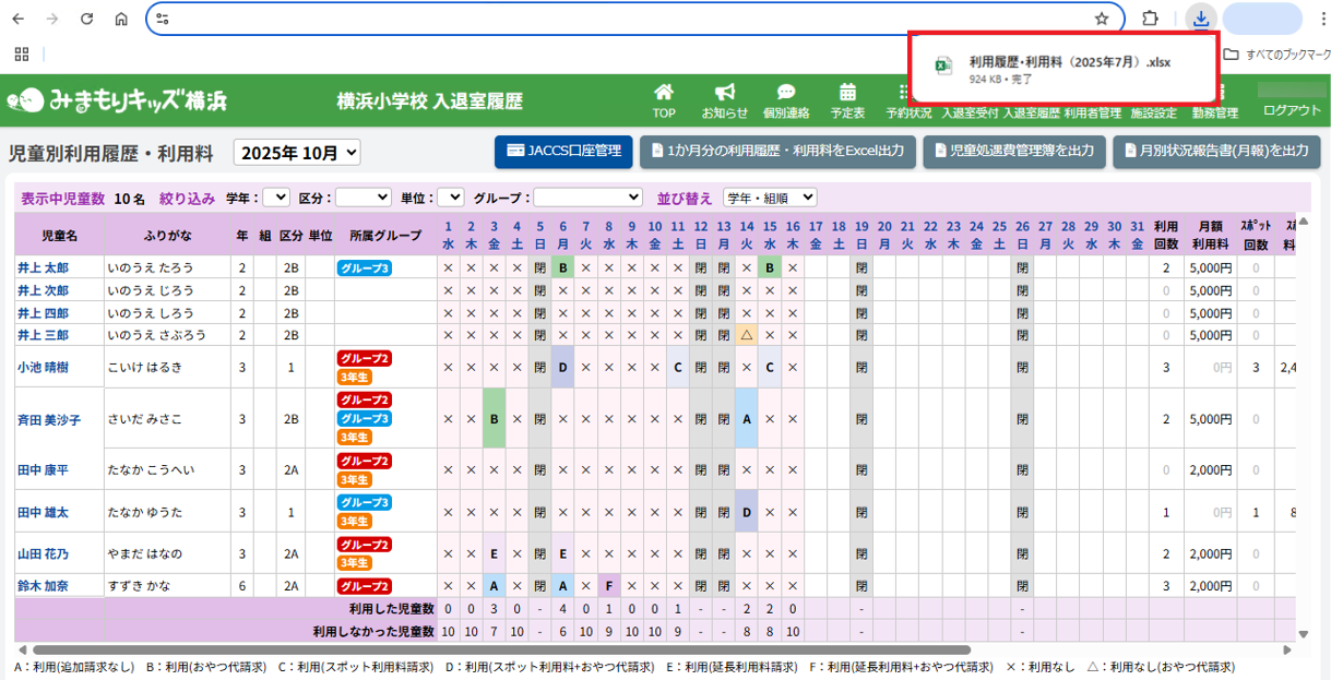 HOME > 入退室履歴 > 1か月分の利用履歴・利用料を出力する 1か月分の利用履歴・利用料を出力する 1.履歴を出力する月を選択する 入退室履歴一覧の中から、出力したい月を選択してください。 2.履歴の出力を実行する 画面右上の【1か月分の利用履歴・利用料をExcel出力】ボタンをクリックしてください。 3.出力の実行を続行する 画面上からアナウンスが表示されます。【OK】をクリックし、データが出力されるまでお待ちください。 4.出力されたExcelデータを開く 出力されたデータが自動でダウンロードされます。画面下部のダウンロードファイルをクリックしてExcelデータを開いてください。 1か月間の児童の利用履歴と利用料がまとまった表になり、出力されます。データの管理や印刷の際にお使いください。 Excel画面下部にあるシート名をクリックするとシートが切り替わります。日毎の利用履歴と利用料、プログラム開催情報も出力できます。 ≪ 活動日誌を出力する 月別状況報告書(月報)を出力する ≫
