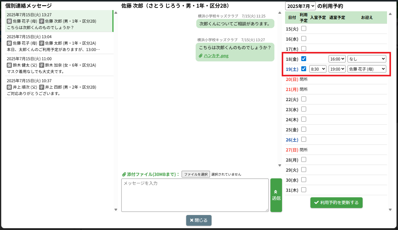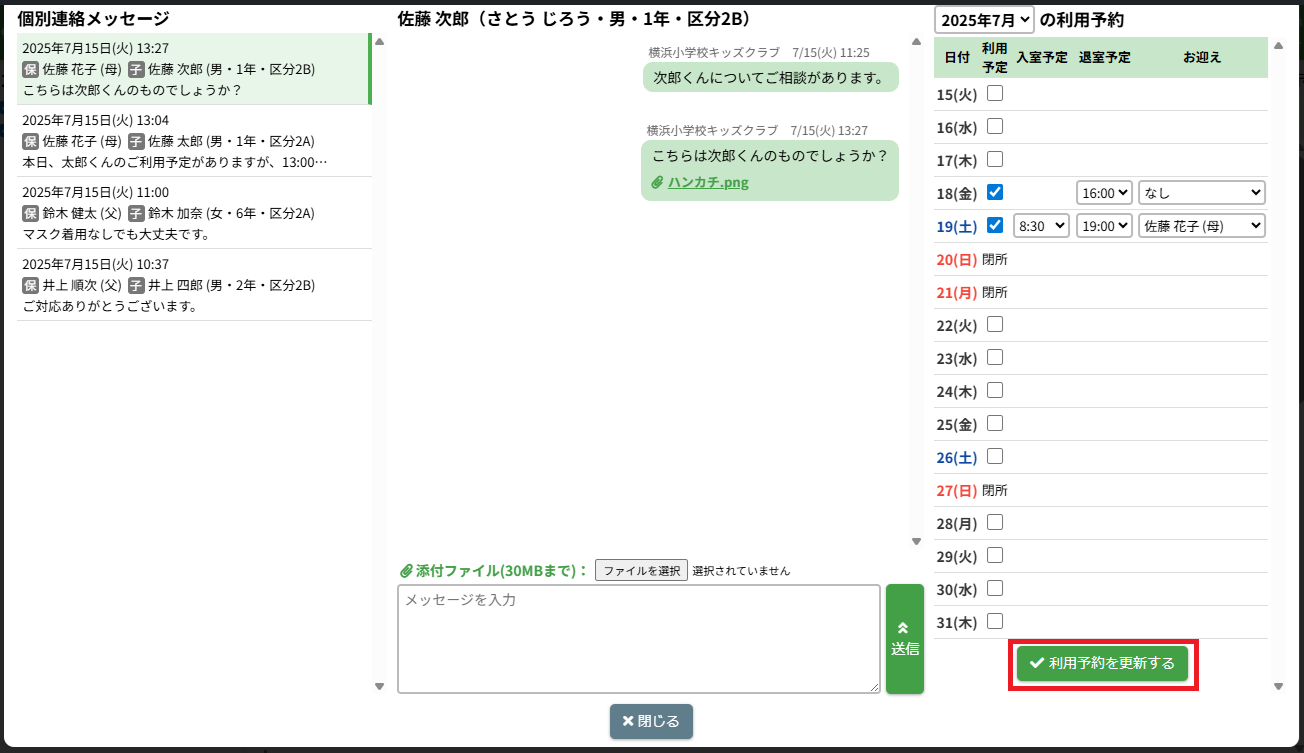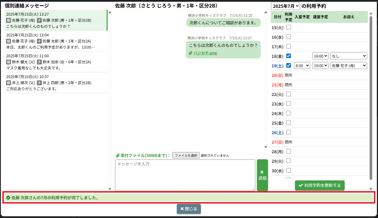 HOME > 個別連絡メッセージ > 児童の利用予約を変更 児童の利用予約を変更 1.現在の予約状況を表示 保護者が予約を入れていた際、個別連絡画面からも予約状況が確認できます。 内容を変更したい場合、【利用予定】、【退室予定】、【お迎え】を変更できます。 (土曜日と学校休業日に限り【入室予定】を変更できます) 2.利用予約の更新完了 変更を行い、【利用予約を更新する】をクリックすることで更新されます。 更新された際、下記のように表示されます。 ≪ メッセージの削除 メッセージの既読方法を設定する ≫