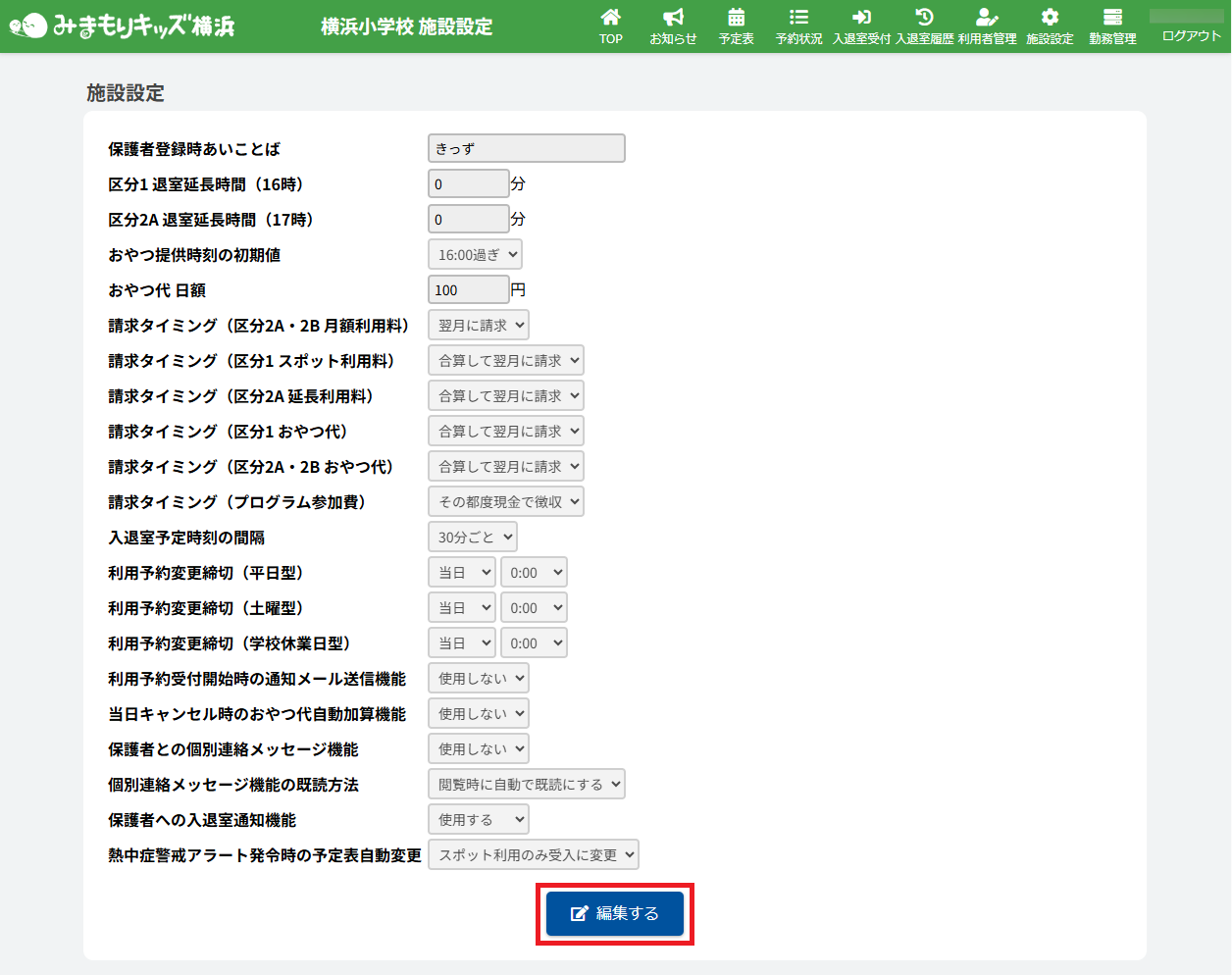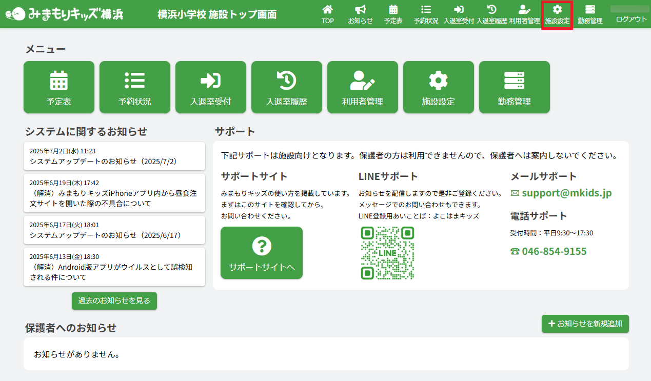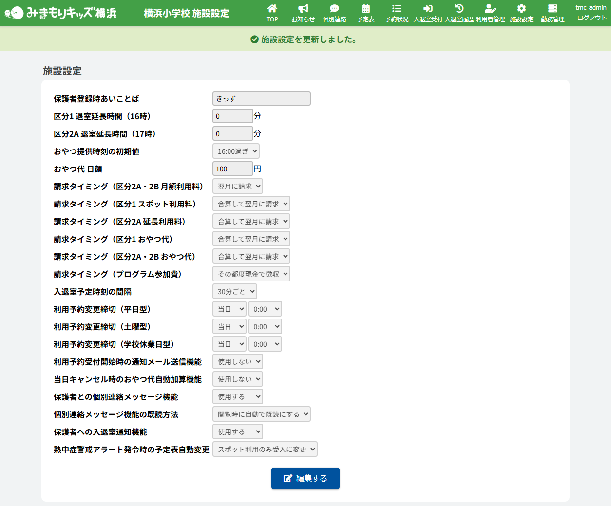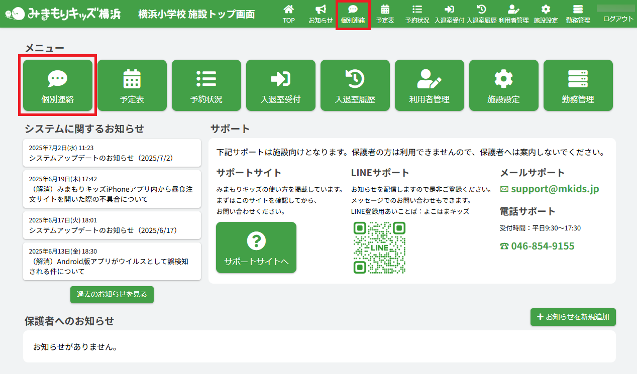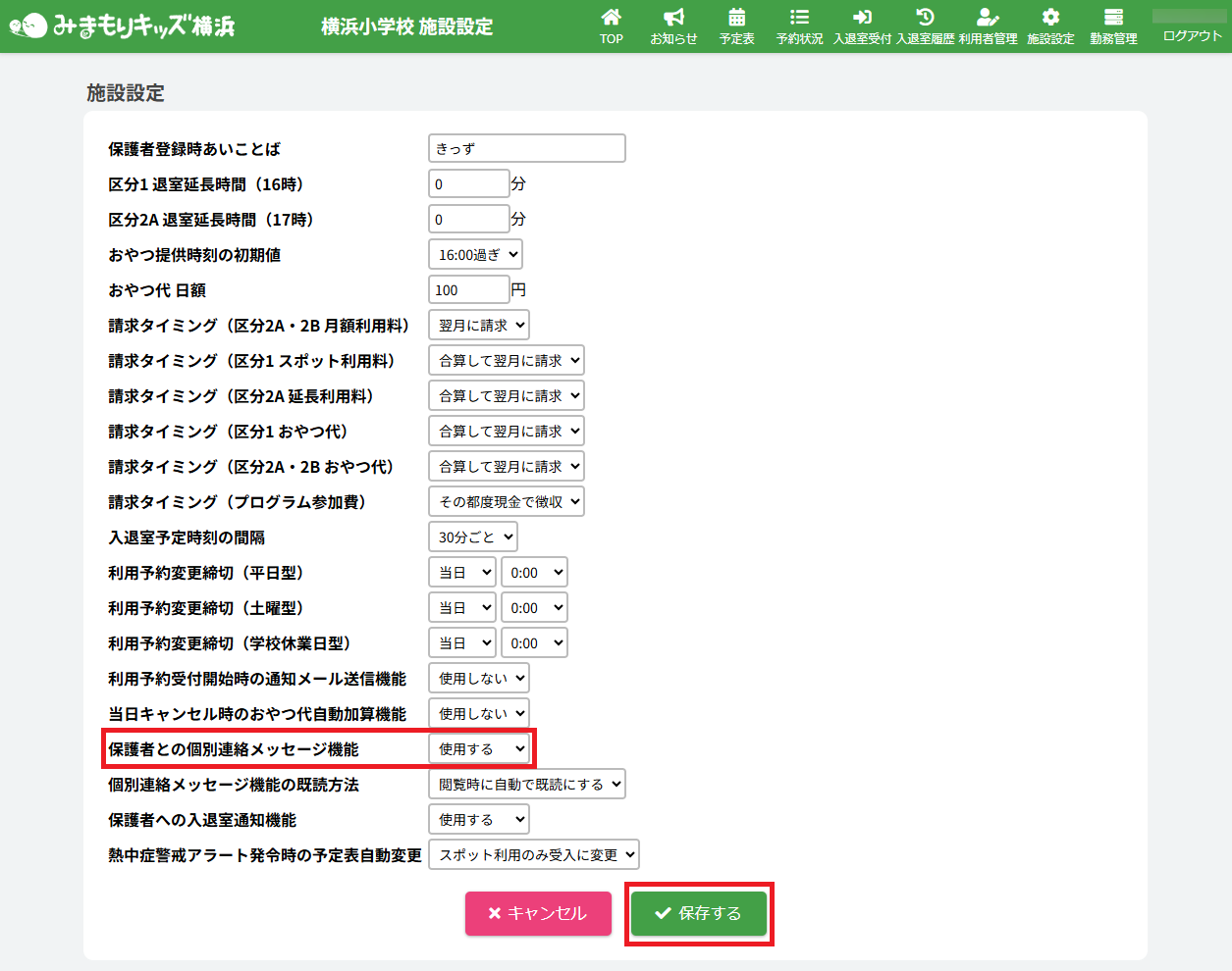 HOME > 個別連絡メッセージ > 個別連絡メッセージを使用可能にする 個別連絡メッセージを使用可能にする 「個別連絡メッセージ」とは… 施設と保護者間でメッセージ(チャット)形式で個別連絡を行うための機能です。 保護者からキャンセルや変更のメッセージを受け取ったり、施設側から保護者に対して連絡をしたりすることができます。 新着のメッセージがある場合は上部メニュー上やトップ画面に通知が表示されます。 どの画面からでも個別連絡メッセージを使用できます。 初期状態ではこの機能は「使用しない」になっており、表示されていません。 1.施設設定を開く 画面右上にある【施設設定】をクリックしてください。 2.施設設定を変更する 施設設定下部にある【編集する】ボタンをクリックしてください。 3.設定を変更して、保存する 保護者との個別連絡メッセージ機能の右にある項目をクリックして「使用する」に変更してください。 変更できたら【保存する】をクリックしてください。 4.施設設定の変更の完了 施設設定の変更完了です。 画面上部に「施設設定を更新しました。」というメッセージが表示されていることを確認してください。 5.使用可能になっていることを確認する 画面上部及び施設トップ画面に【個別連絡】が表示されていることを確認してください。 以降「個別連絡メッセージ」が使用可能です。 メッセージを確認する ≫