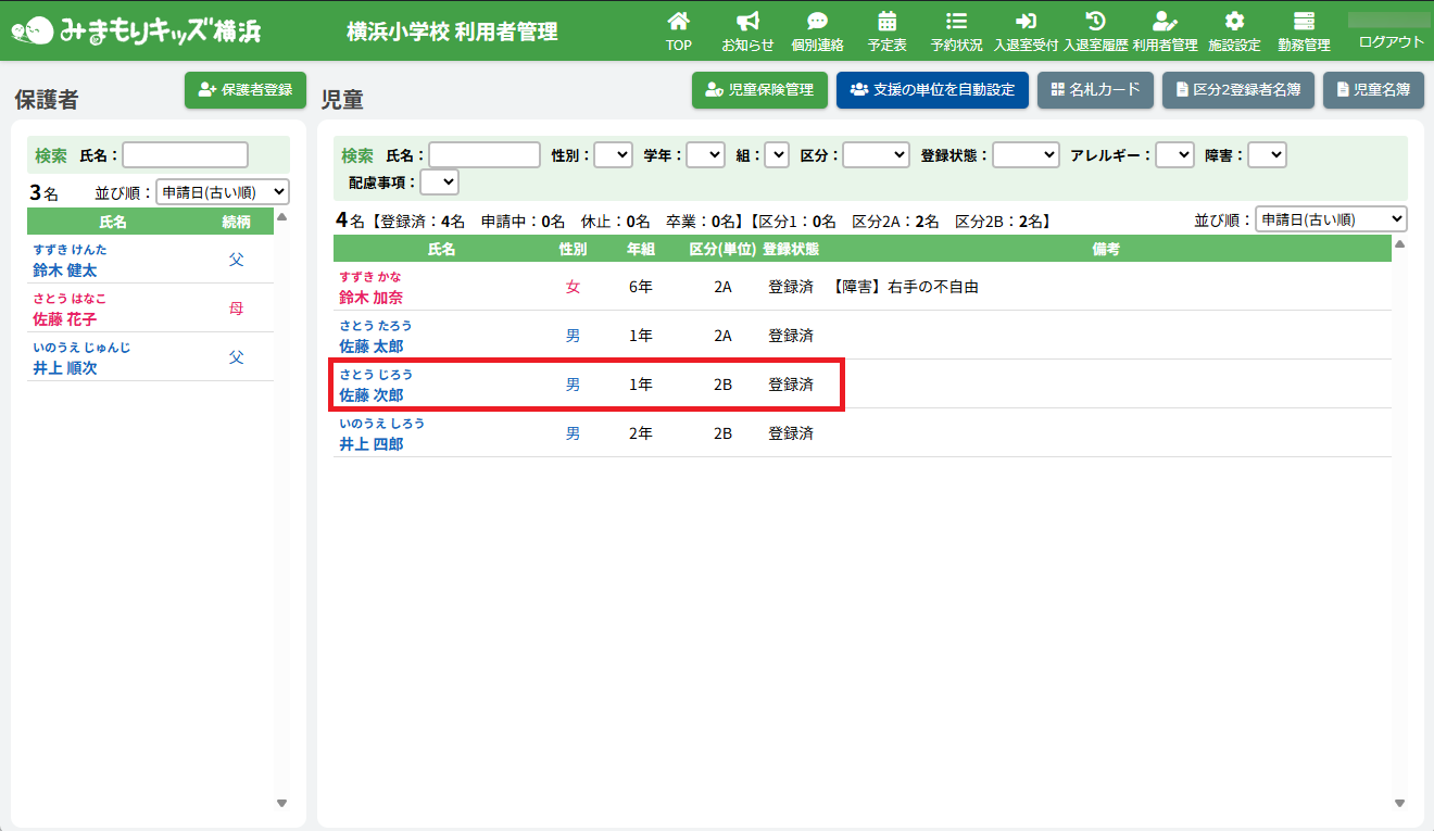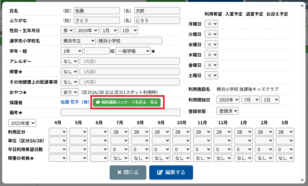 利用者管理から児童情報を表示して個別連絡メッセージを送る方法について説明致します。