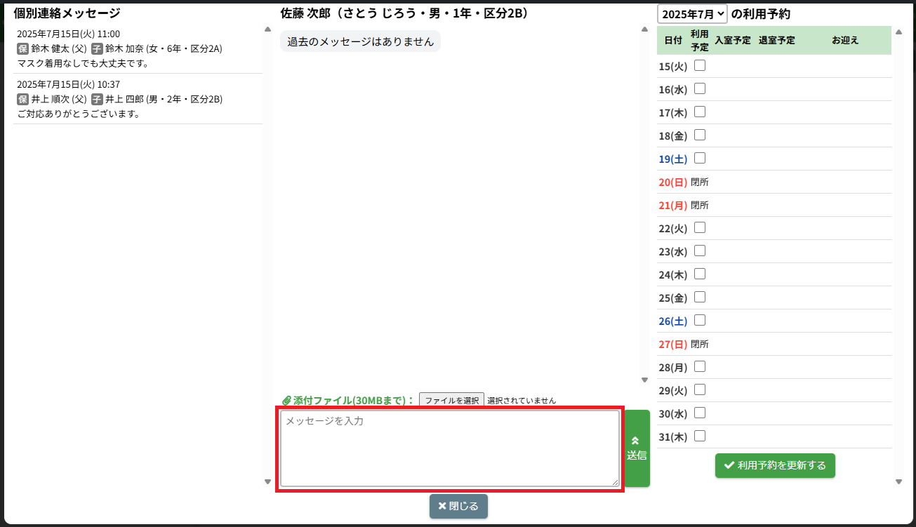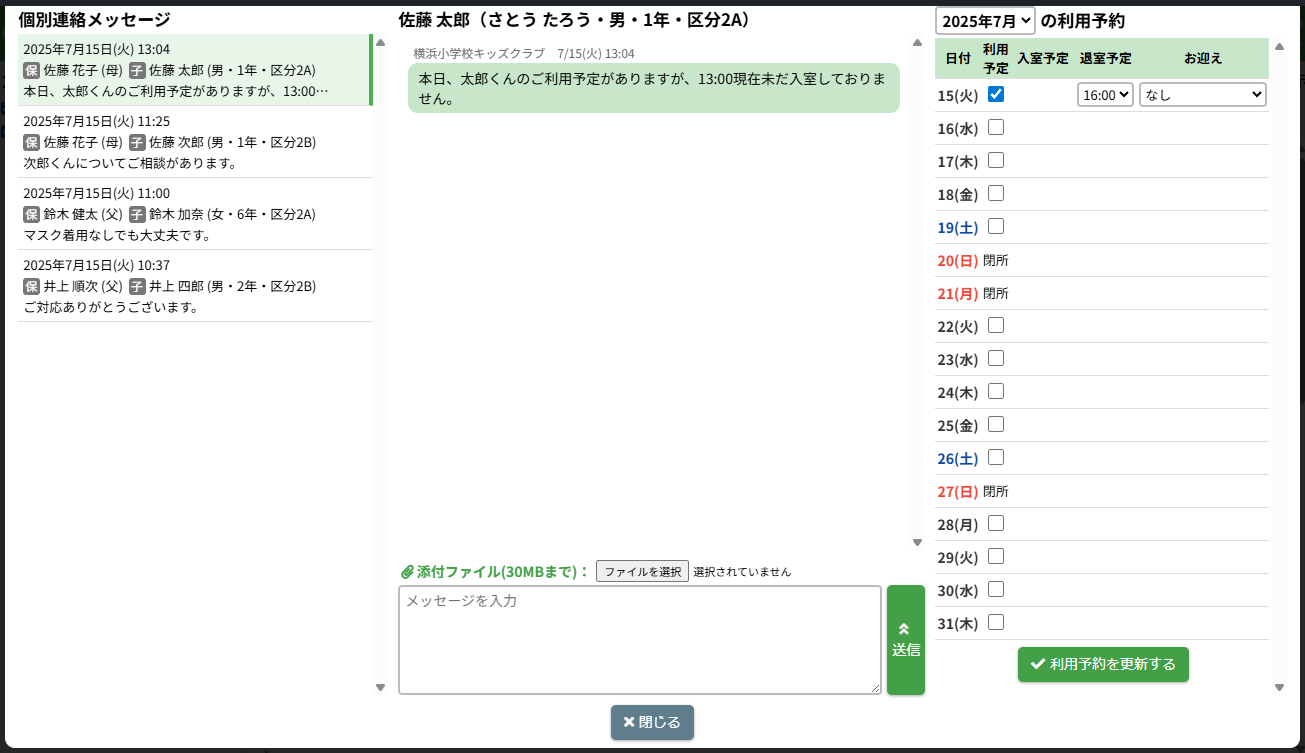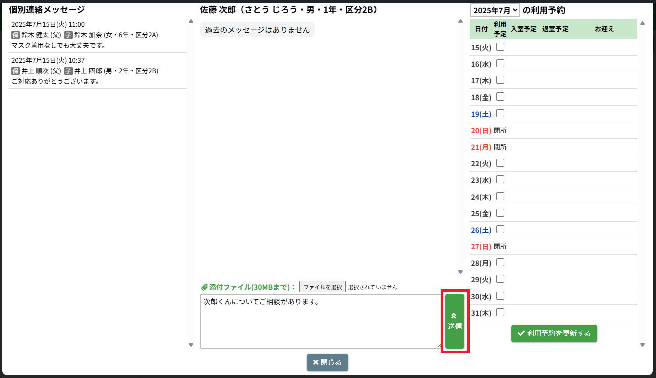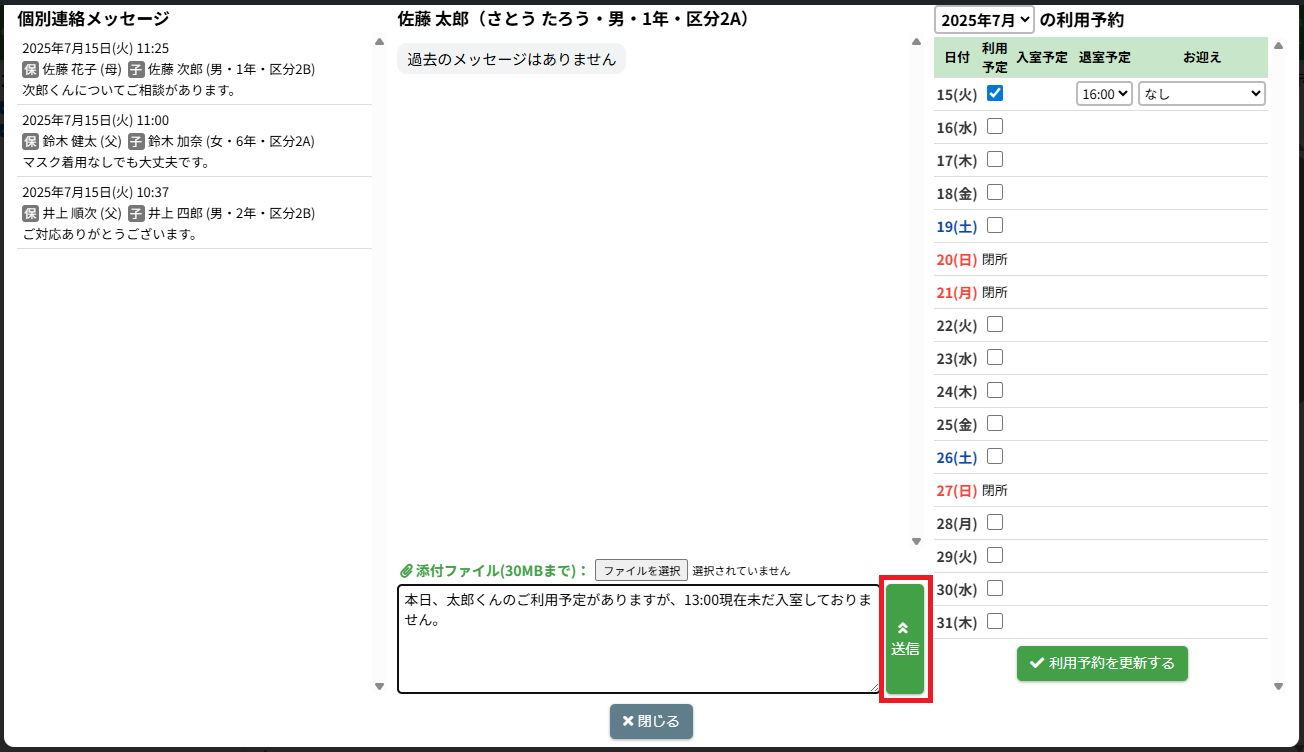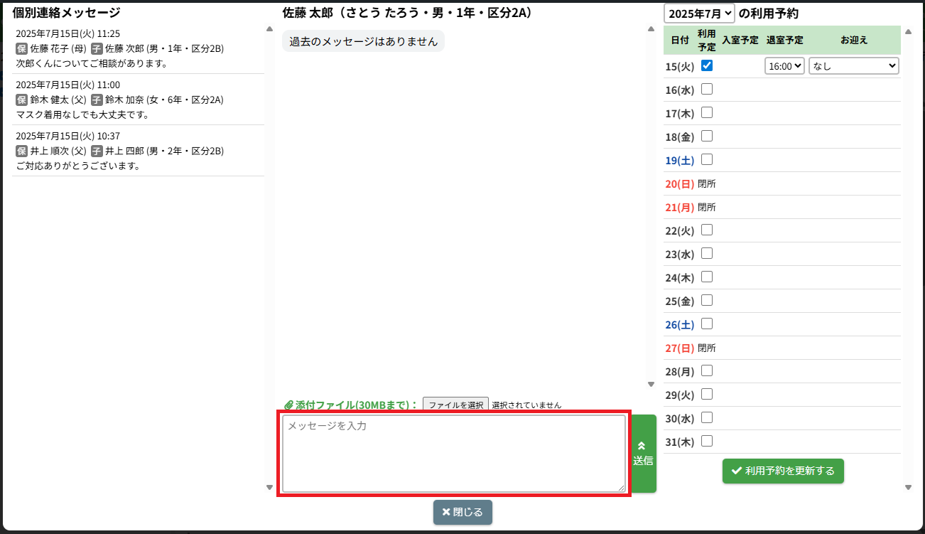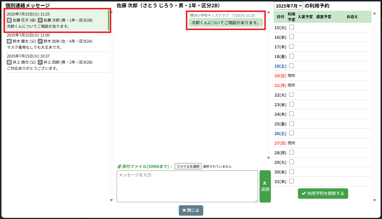 また、初めてメッセージが送信された場合、画面左側のメッセージスレッド一覧に対象児童が追加されます。