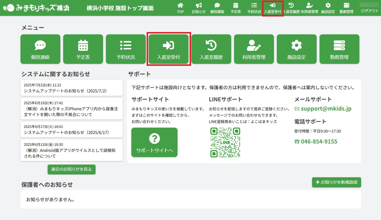 トップ画面及び画面上部の【入退室受付】ボタンをクリックしてください。