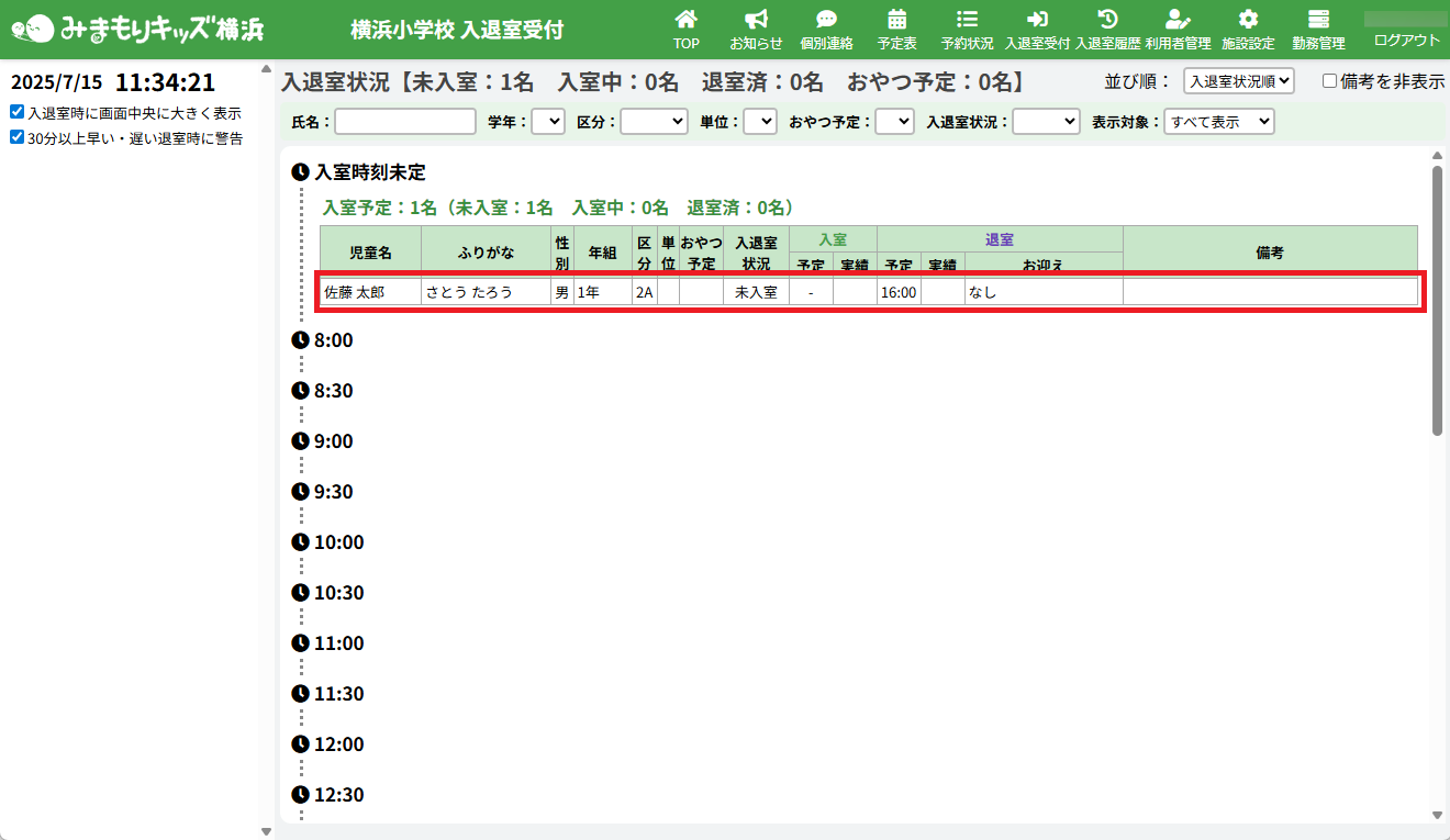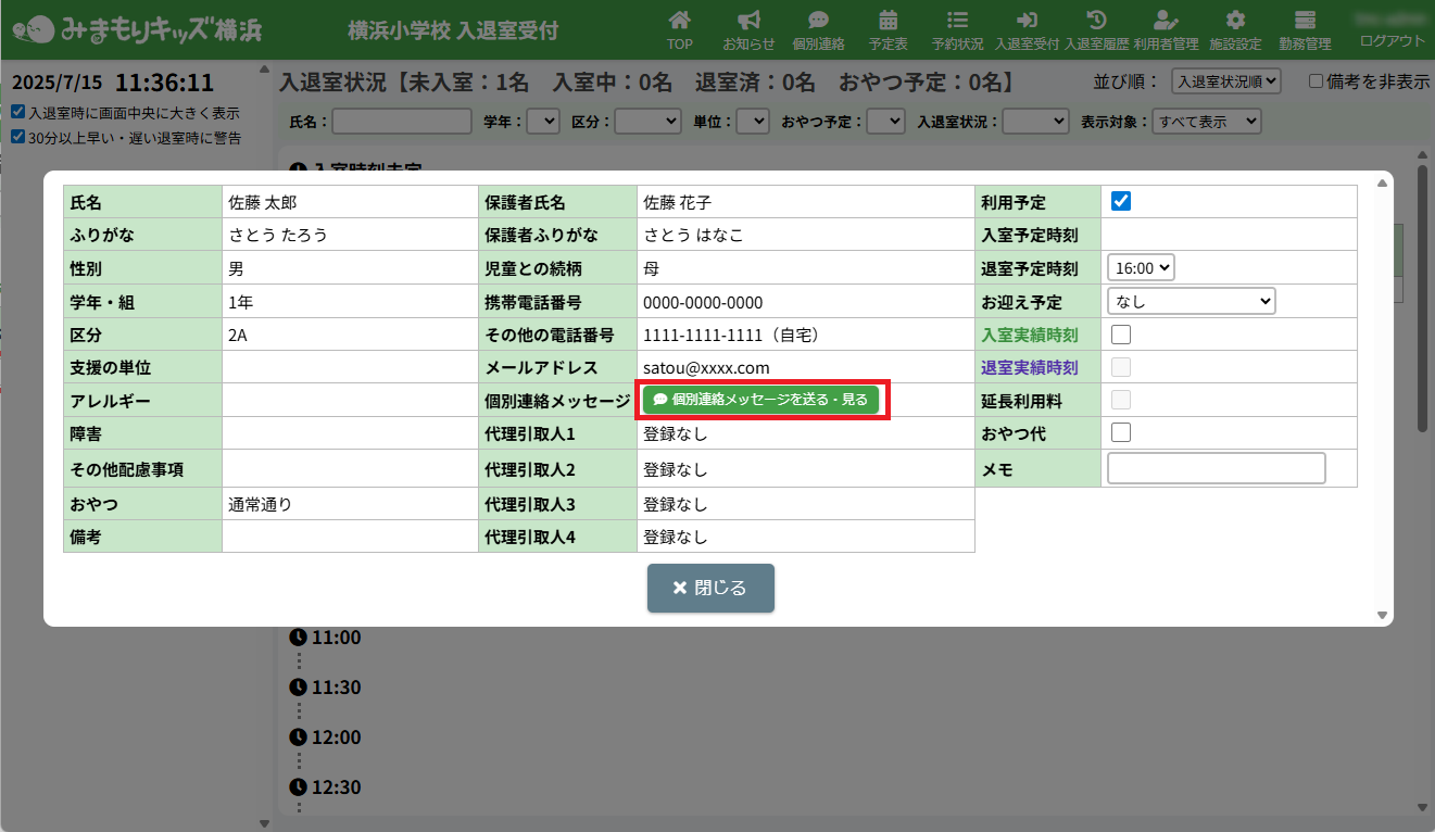 入退室受付から児童情報を表示して個別連絡メッセージを送る方法について説明致します。