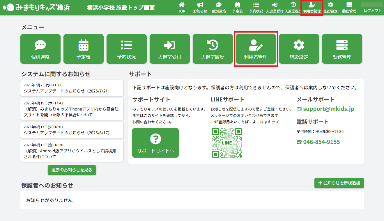 トップ画面及び画面上部の【利用者管理】ボタンをクリックしてください。