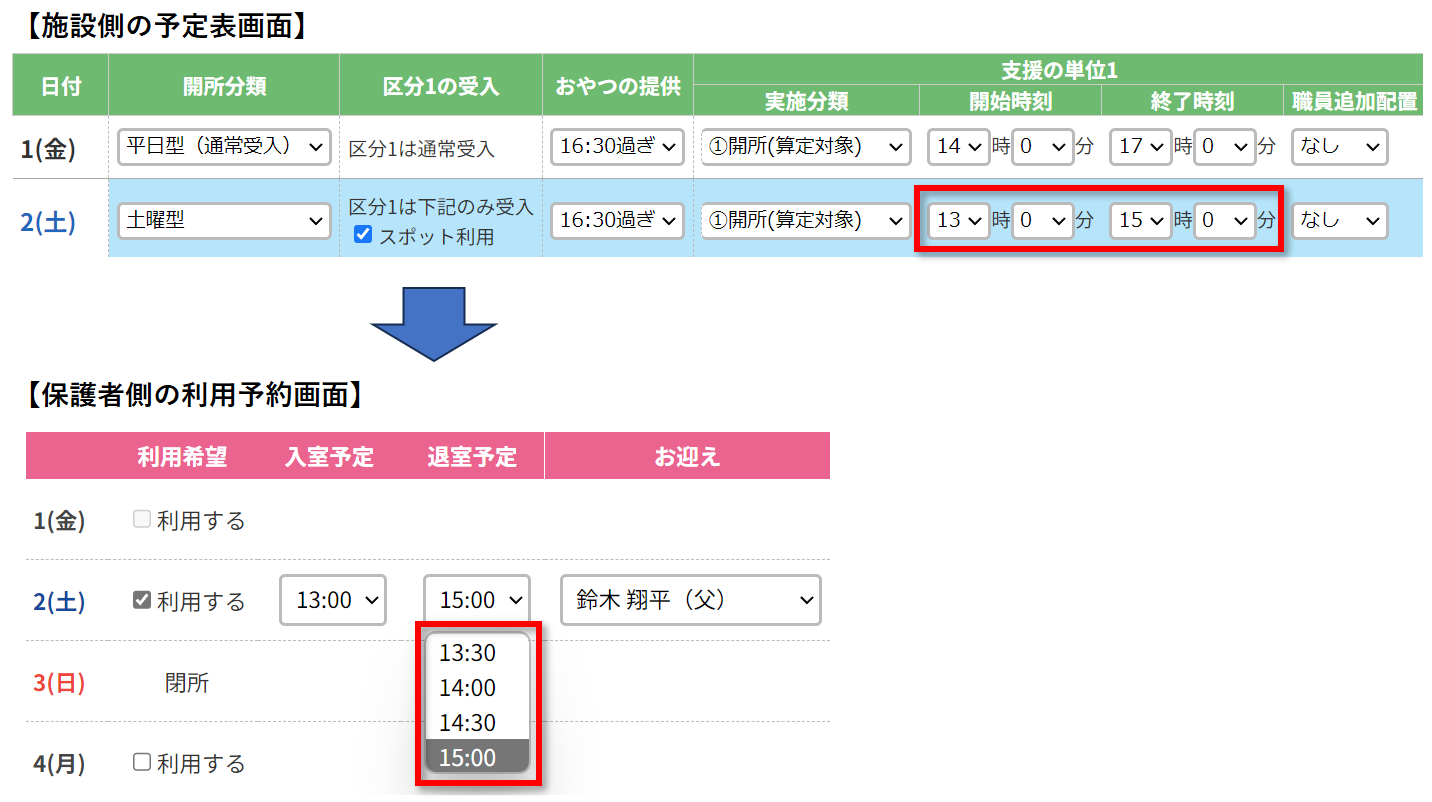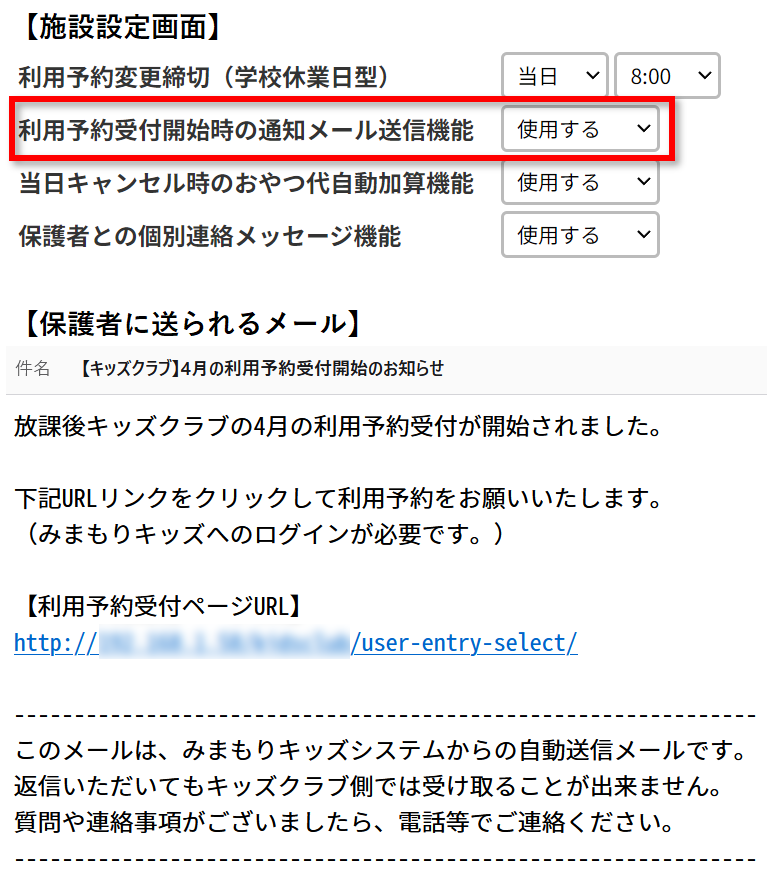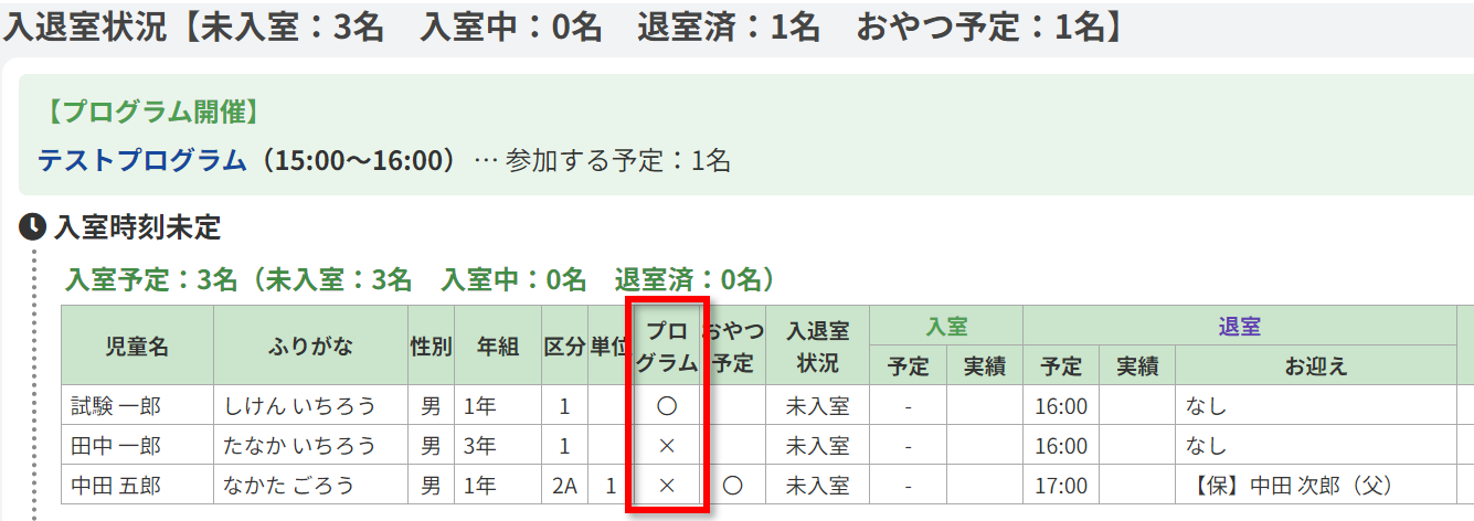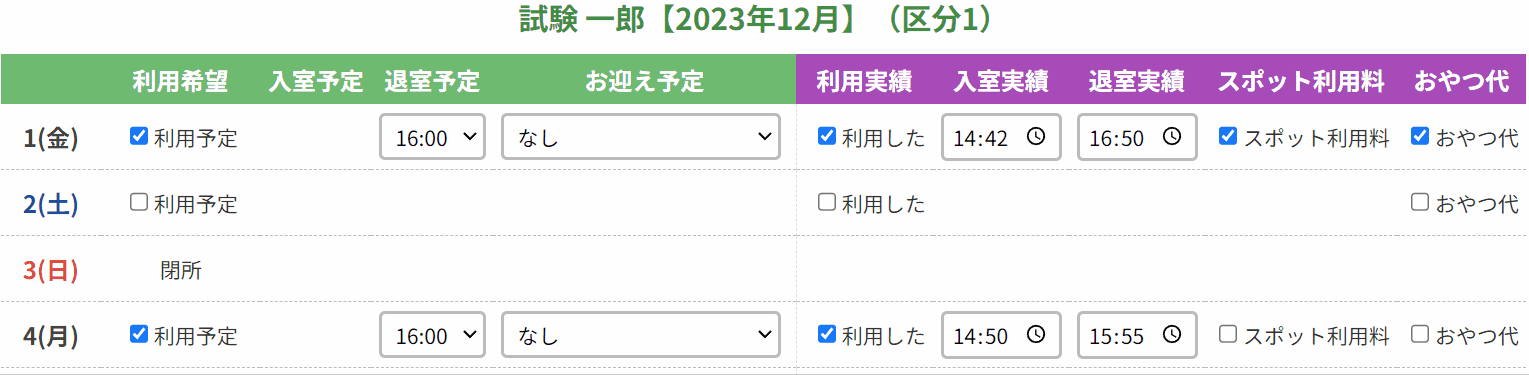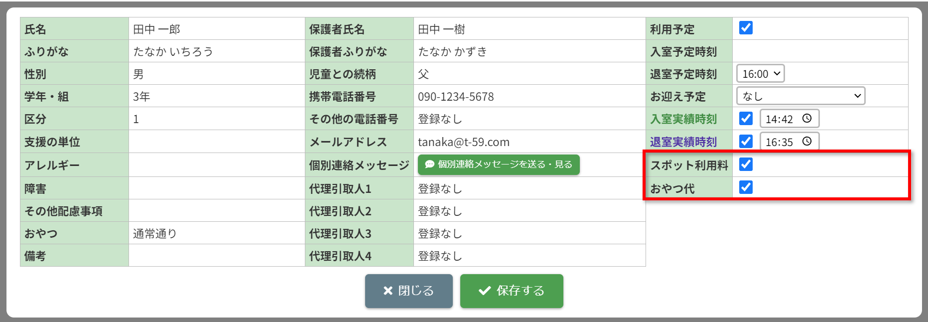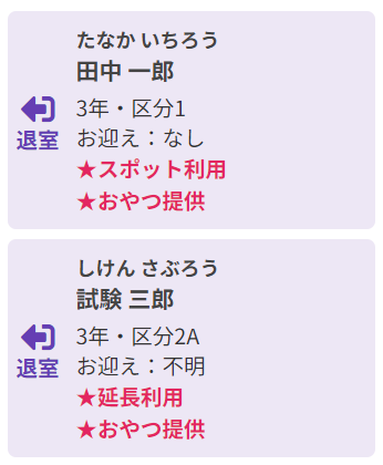 システムアップデートのお知らせ(2023/12/12) 2023年12月12日 お知らせ みまもりキッズのシステムアップデートを実施いたしましたので、下記の通りお伝えいたします。 不明点等ございましたらお気軽にお問い合わせください。 【予定表画面】開始時刻・終了時刻の設定と保護者側の利用予約画面の時刻の選択肢が連動するように修正 従来は施設側の予定表画面の開始時刻・終了時刻の設定に関わらず、保護者側の利用予約画面で選択できる入室予定時刻・退室予定時刻の選択肢は固定となっていました。そのため、何らかの理由で開所時間を短縮する日があったとしても、保護者側では閉所している時間で予約ができる状態でした。 今回のアップデートにより、施設側の予定表画面の支援の単位1の開始時刻・終了時刻と、保護者側の利用予約画面の入室予定時刻・退室予定時刻の選択肢が連動するようになり、あらかじめ予定表画面で開所時間を絞っておけば、保護者側で開所時間外の選択ができないようになりました。 なお、開所時間を絞ったことに関しては保護者に自動通知されませんので、開所時間が変更される場合はその都度お知らせ機能等を利用して事前に周知をお願いします。 【予定表画面】実施分類②を選択した際に開始時刻・終了時刻を空欄にできるように修正 「月報にて実施分類②とした場合に開始時刻・終了時刻を空欄にすることがあるが、予定表画面でそのように設定できない」というご指摘をいただいたため、予定表画面で実施分類②を選択した場合に開始時刻・終了時刻を空欄にできるように修正しました。 【児童別予約状況・利用履歴画面】児童のスポット利用料・延長利用料の実績を変更する機能を追加 従来は入室・退室実績時刻に応じてスポット利用料・延長利用料を自動計算していました。しかし、スポット利用料・延長利用料のかかる時間まで滞在していたが、何らかの理由でスポット利用料・延長利用料をかからないようにしたい場合は、無理やり入室・退室実績時刻をスポット利用料・延長利用料のかからない時刻に変更するという方法を取らざるを得ない状況でした。この場合、実際の児童の入室・退室時刻とずれる状態となるため、適切とは言えない状況でした。 今回のアップデートにより、児童別予約状況・利用履歴画面にスポット利用料・延長利用料の実績を表すチェックボックスを表示するようにしました。「スポット利用料・延長利用料がかかっているけども、かからないように変更したい」という場合は、このチェックボックスからチェックを外すことで、スポット利用料・延長利用料がかからないように変更できます。 【入退室受付画面】児童のスポット利用料・延長利用料・おやつ代の実績を変更する機能を追加 入退室受付画面で児童をクリックした際に表示されるポップアップに、スポット利用料・延長利用料・おやつ代の実績を変更できる機能を追加しました。 【入退室受付画面】QRコードで退室した際のメッセージに、スポット利用料・延長利用料・おやつ代の発生の表示を追加 QRコードで入退室した際に画面左側にメッセージが表示されますが、退室時にスポット利用料・延長利用料・おやつ代が発生した場合はその旨をメッセージに表示するようなりました。 【入退室受付画面】児童のプログラムの参加予定の表示を追加 プログラムの開催日に入退室受付画面を開いた場合、児童ごとのプログラムの参加可否が表示されるようになりました。 【施設設定画面】利用予約受付開始時に「利用予約受付開始のお知らせメール」を保護者へ自動送信する機能を追加 予定表画面で予約受付期間を設定することが出来ますが、その予約受付開始日時になったら「利用予約受付開始のお知らせメール」を保護者へ自動的に送信する機能を追加しました。 なお、この機能は初期状態では「利用しない」になっています。この機能を利用する場合は施設設定画面であらかじめ「利用する」に変更をお願いします。