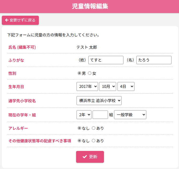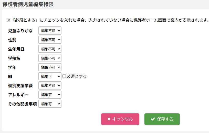 システムアップデートのお知らせ(2025/4/23) 2025年4月23日 お知らせ みまもりキッズのシステムアップデートを実施いたしましたので、下記の通りお伝えいたします。 不明点等ございましたらお気軽にお問い合わせください。 保護者側で一部の児童情報を修正する機能を追加 従来は、一度児童を登録すると保護者側では一切情報を修正できませんでしたが、今回のアップデートにより、保護者側で一部の児童情報を修正できるようになりました。 特に年度が替わると「組」が変わる場合が多いため、保護者側で組を入力していただけるようになりました。 なお、保護者側で修正できる項目はキッズクラブ側から「施設設定画面」で指定することができます。従来通り保護者側では一切修正できないようにすることも可能で、初期値はそのようになっています。保護者に児童情報の修正を許可する場合は「施設設定画面」で設定変更をお願いいたします。 ▼保護者側の児童情報編集画面 ▼施設側の施設設定画面 今年度の月別状況報告書の出力に対応 今年度の新しい月別状況報告書(月報)の出力に対応しました。 5月1日以降に4月分の出力が可能になります。