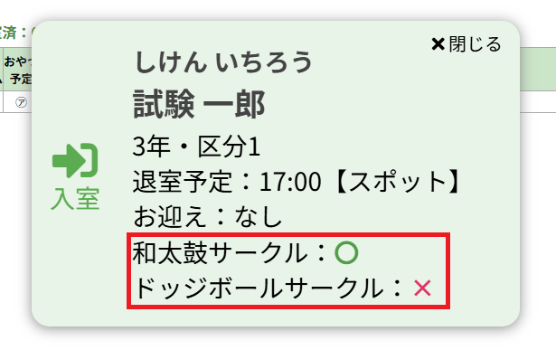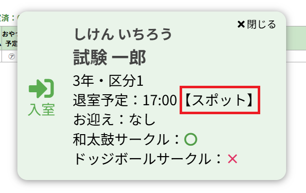 システムアップデートのお知らせ(2025/9/12) 2025年9月12日 お知らせ みまもりキッズのシステムアップデートを実施いたしましたので、下記の通りお伝えいたします。 不明点等ございましたらお気軽にお問い合わせください。 【入退室受付画面】QRコードでの入室時にスポット利用・延長利用の予定が表示されるようになりました QRコードを使用して入室した際に、その児童の退室予定時刻をもとにスポット利用・延長利用となる予定である場合は、【スポット】または【延長】と表示されるようになりました。 【入退室受付画面】QRコードでの入室時に表示されるプログラムの参加予定を見やすく改善しました 以前のアップデートで、QRコードで入室した際にプログラムの参加予定が表示されるようになりましたが、「参加」「不参加」という文言で表示していたため見づらいというお声をいただくことがありました。 今回のアップデートにて、参加の予定を色つきの「〇」「×」で表示するように変更し、ぱっと見で分かりやすいように改善しました。