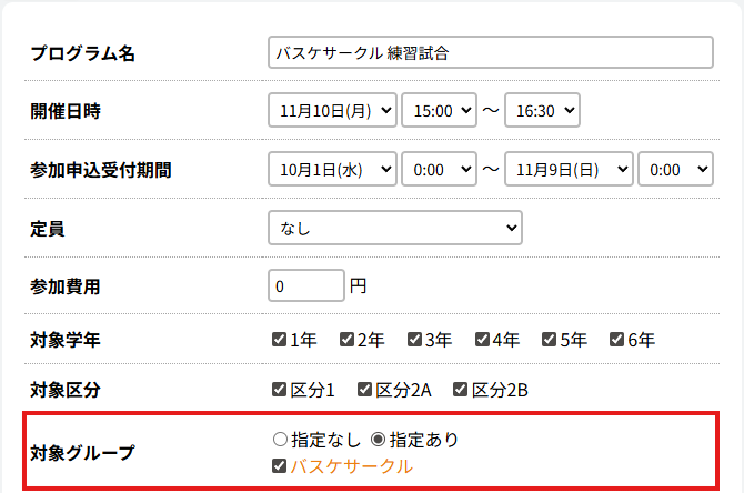 プログラムを開催する際に、特定のグループに所属する児童のみ申し込めるようになりました。