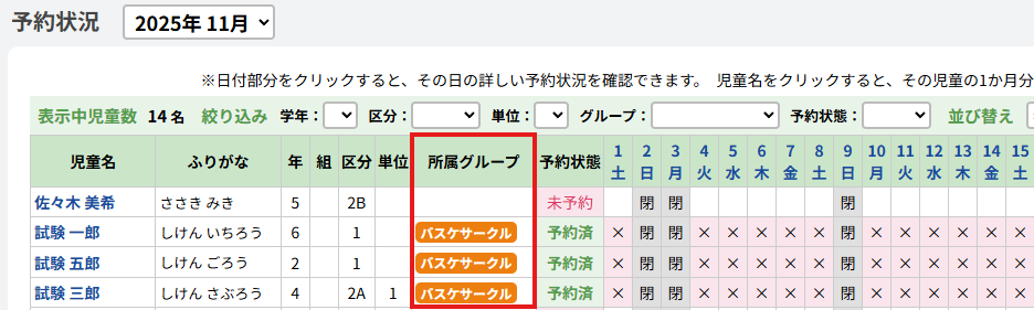 【予約状況画面】児童が所属するグループの表示と絞り込みに対応