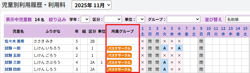 児童の一覧表に「所属グループ」の列が追加され、児童が所属するグループの表示に対応しました。