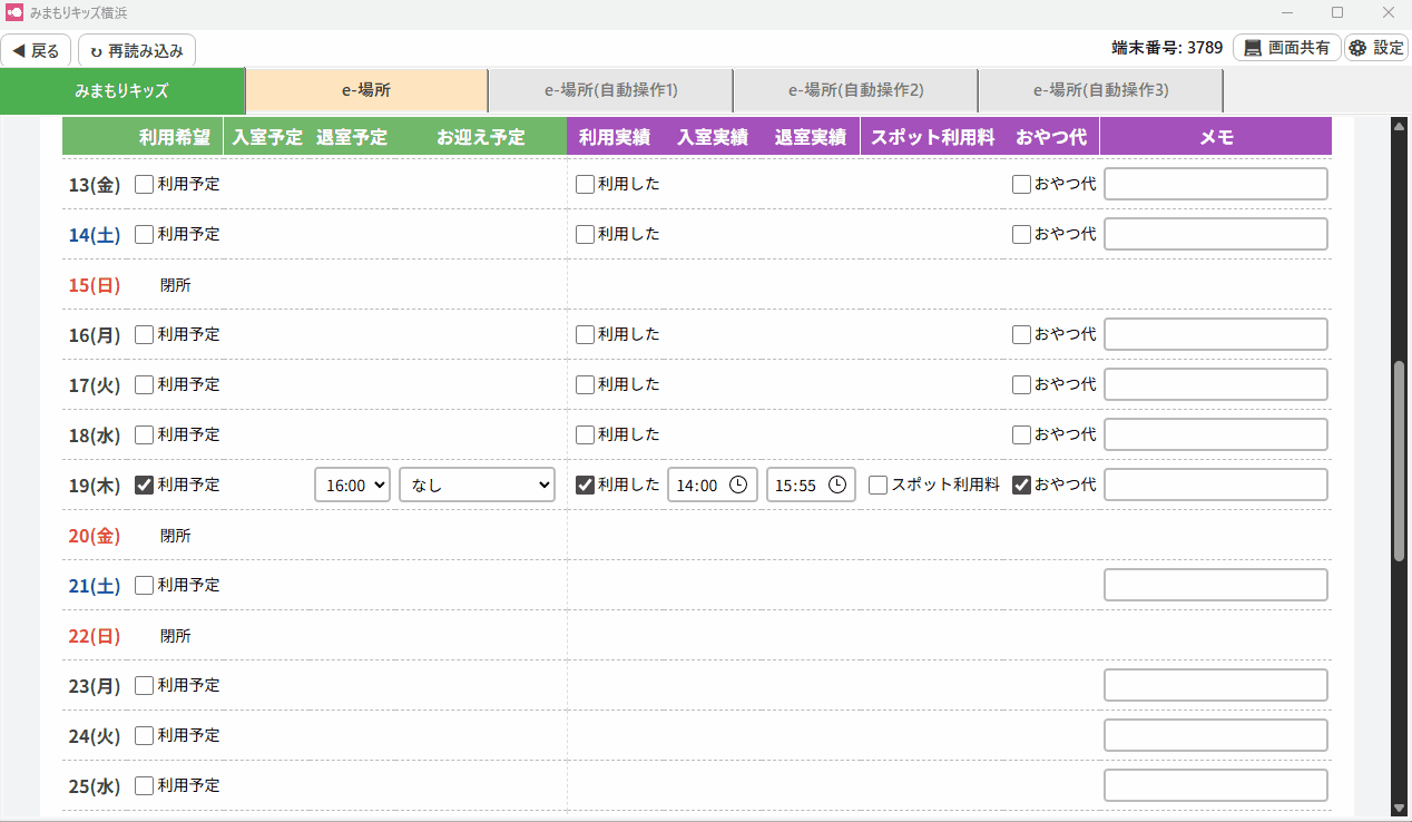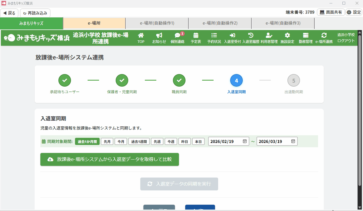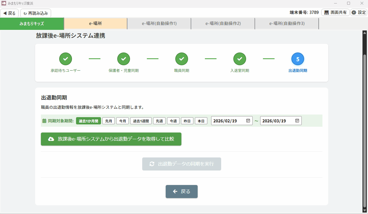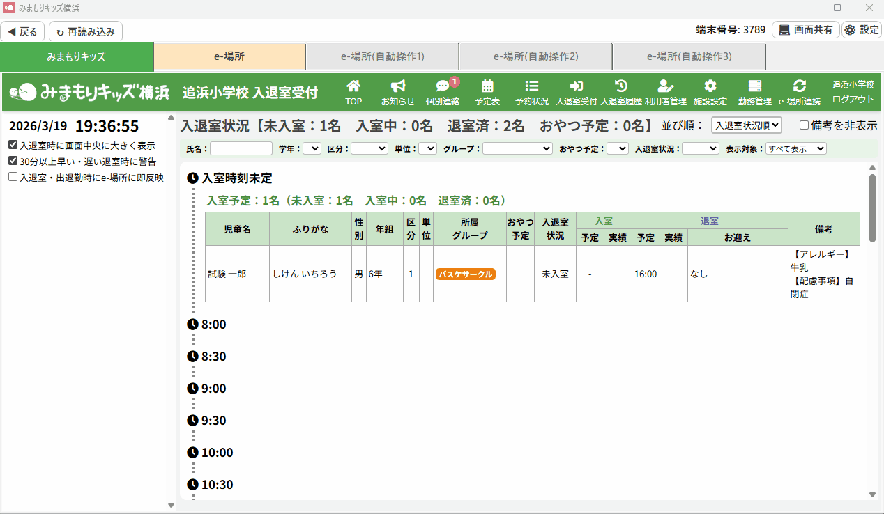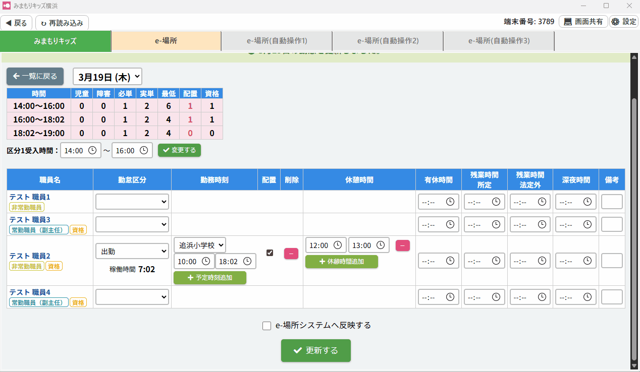 システムアップデートのお知らせ(2026/3/19) 2026年3月19日 お知らせ みまもりキッズのシステムアップデートを実施いたしましたので、下記の通りお伝えいたします。 不明点等ございましたらお気軽にお問い合わせください。 【入退室受付画面】児童の入退室・職員の出退勤時にe-場所システムへ自動連携する機能をを追加 連携ソフトの入退室受付画面で児童の入退室・職員の出退勤を行った際に、同時に放課後e-場所システムへの入退室・出退勤記録が行う機能を追加しました。 画面左の「入退室・出退勤時にe-場所に即反映」にチェックを入れると自動連携が行われます。逆に外しているときは連携は行われません。基本的に4月1日以降はチェックを入れていただければと思います。 特に追加の操作をする必要はなく、従来通りみまもりキッズのQRコード(名札カード)を読み取ることで、自動でe-場所システムへの連携が行われます。 また、児童をクリックして入退室時刻を変更した際にも、同様に自動連携が行われます。 なお、この画面で自動連携が行われなかった場合も、後述の機能により後からe-場所システムへ連携することもできます。 【児童別予約状況・利用履歴画面】児童の入退室時刻の変更時にe-場所システムへ自動連携する機能を追加 連携ソフトの児童別予約状況・利用履歴画面で児童の入退室時刻を変更した際に、変更内容をe-場所システムへ自動反映する機能を追加しました。 「e-場所システムへ反映する」にチェックを入れて「上記内容で更新する」ボタンを押すと、自動でe-場所システムへの連携が行われます。 【日付別勤怠管理画面】【職員別勤怠管理画面】職員の出退勤時刻の変更時にe-場所システムへ自動連携する機能を追加 連携ソフトの日付別勤怠管理画面で職員の出退勤時刻を変更した際に、変更内容をe-場所システムへ自動反映する機能を追加しました。 「e-場所システムへ反映する」にチェックを入れて「更新する」ボタンを押すと、自動でe-場所システムへの連携が行われます。 【放課後e-場所システム連携画面】みまもりキッズとe-場所システムの過去の児童の入退室時刻を比較して、差分を同期する機能を追加 放課後e-場所システム連携画面で、みまもりキッズとe-場所システムのそれぞれの過去の児童の入退室時刻を比較して、差分を表示する機能を追加しました。 差分があった場合は「みまもりキッズ」「e-場所」のどちらの時刻を採用するか選択でき、「入退室データの同期を実行」を押すことで、それぞれのシステムに一括で反映されます。 ※間違った方を選択しないようにご注意ください。 ※基本的には、前述のような「入退室受付画面」での自動連携を行っていれば、ここで差分が出てくることはほとんどないかと思われます。万が一自動連携がうまくできなかった時や、タブレット端末など連携ソフトではない端末から入退室を行った場合は、後からこの画面で同期を行うことができます。 【放課後e-場所システム連携画面】みまもりキッズとe-場所システムの過去の職員の出退勤時刻を比較して、差分を同期する機能を追加 放課後e-場所システム連携画面で、みまもりキッズとe-場所システムのそれぞれの過去の職員の出退勤時刻を比較して、差分を表示する機能を追加しました。 差分があった場合は「みまもりキッズ」「e-場所」のどちらの時刻を採用するか選択でき、「出退勤データの同期を実行」を押すことで、それぞれのシステムに一括で反映されます。 ※間違った方を選択しないようにご注意ください。 ※基本的には、前述のような「入退室受付画面」での自動連携を行っていれば、ここで差分が出てくることはほとんどないかと思われます。万が一自動連携がうまくできなかった時や、タブレット端末など連携ソフトではない端末から出退勤を行った場合は、後からこの画面で同期を行うことができます。