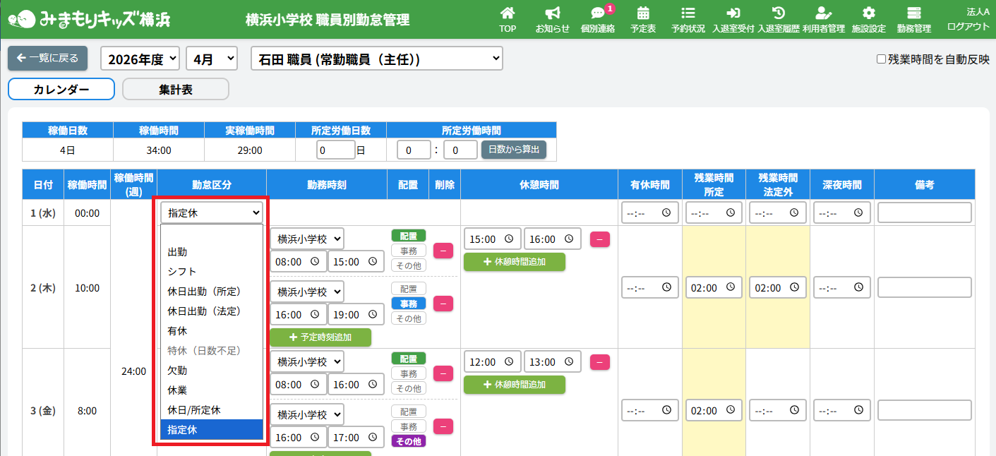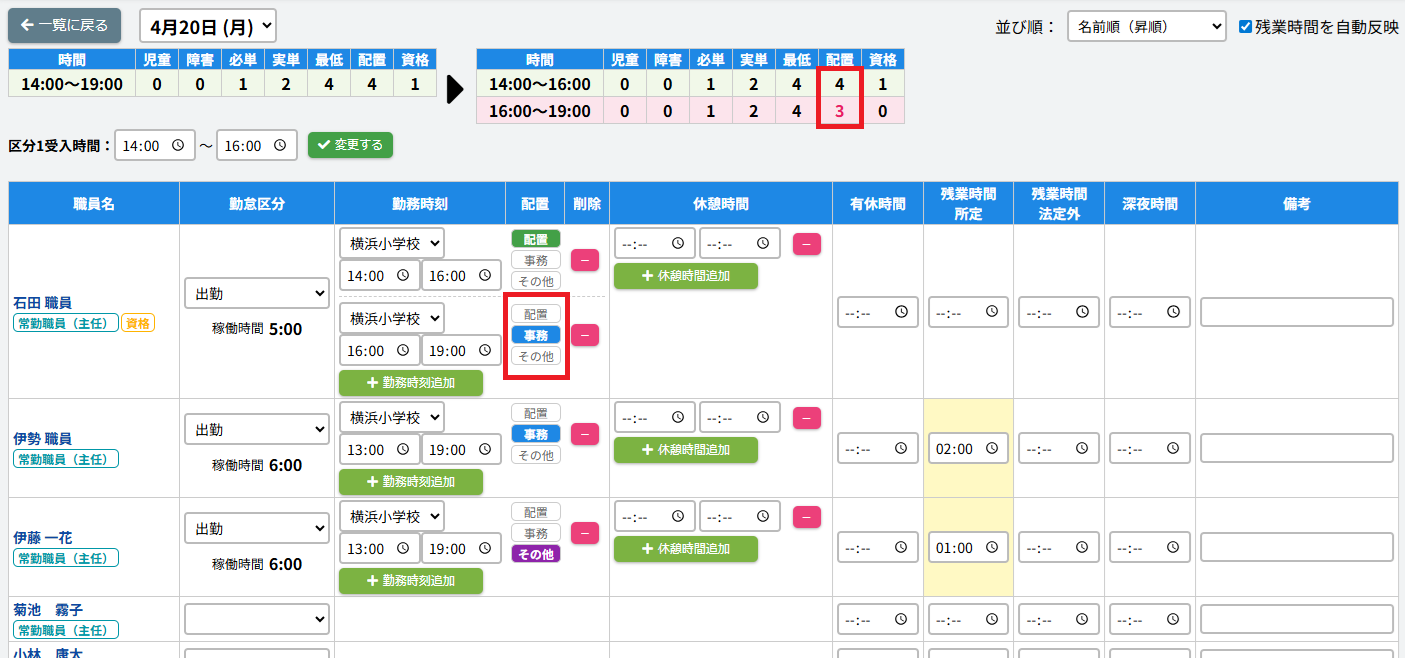 【職員勤怠管理】勤怠の配置を「配置」「事務」「その他」で記録できるように変更しました
