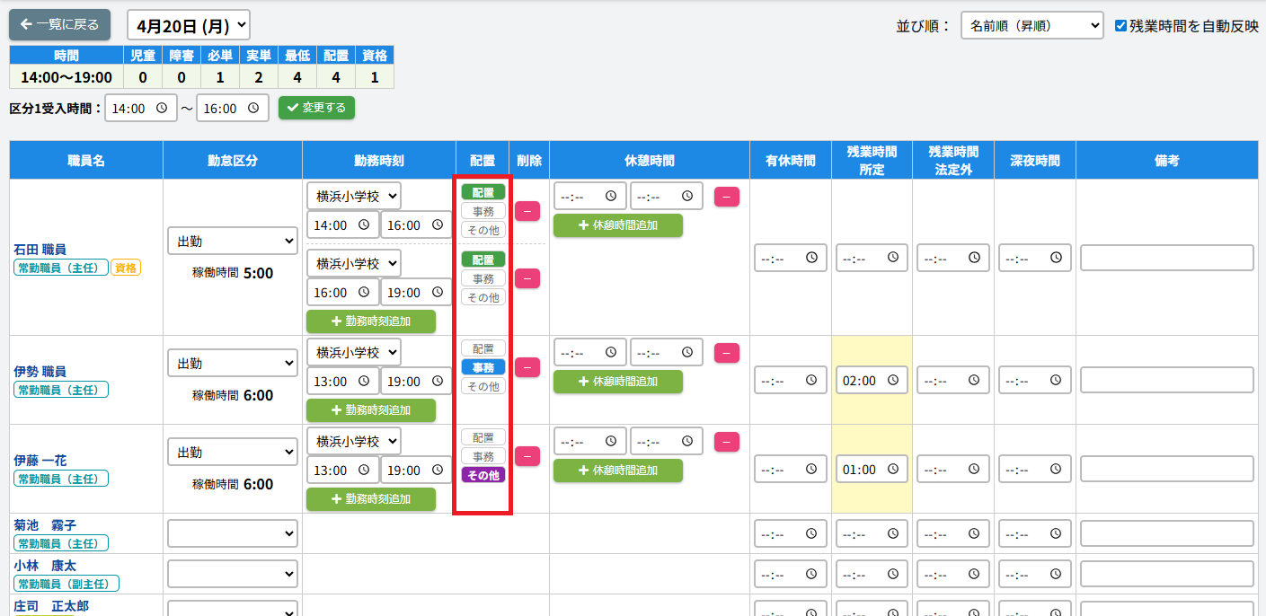 ※今まで配置ありとして登録していただいたものは「配置」、配置なしとして登録していただいたものは「その他」として設定されています。4/1~の勤怠データについて、必要に応じて「事務」に変更をお願いいたします。