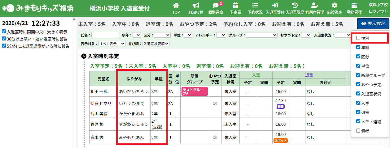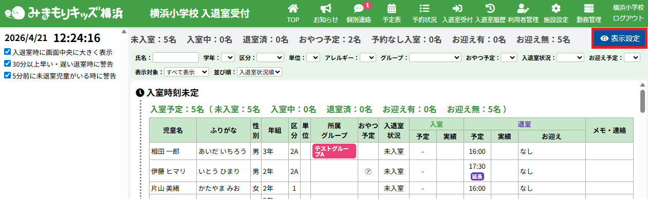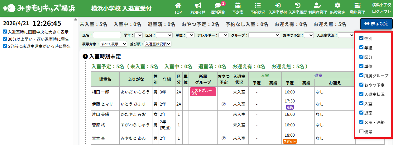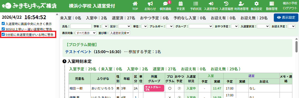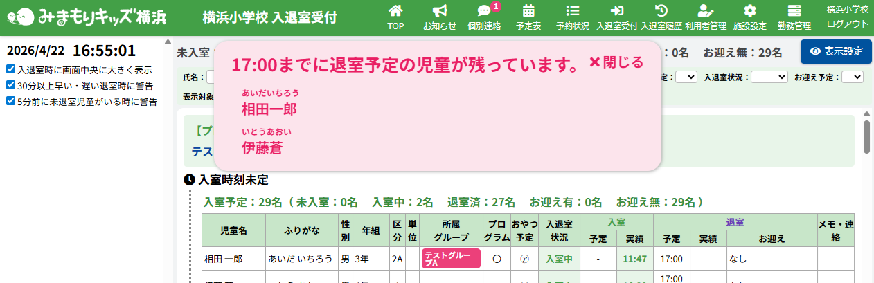 入退室受付画面にて退室予定の5分前に未退室の児童がいる場合に音と表示でお知らせする機能を追加しました。
