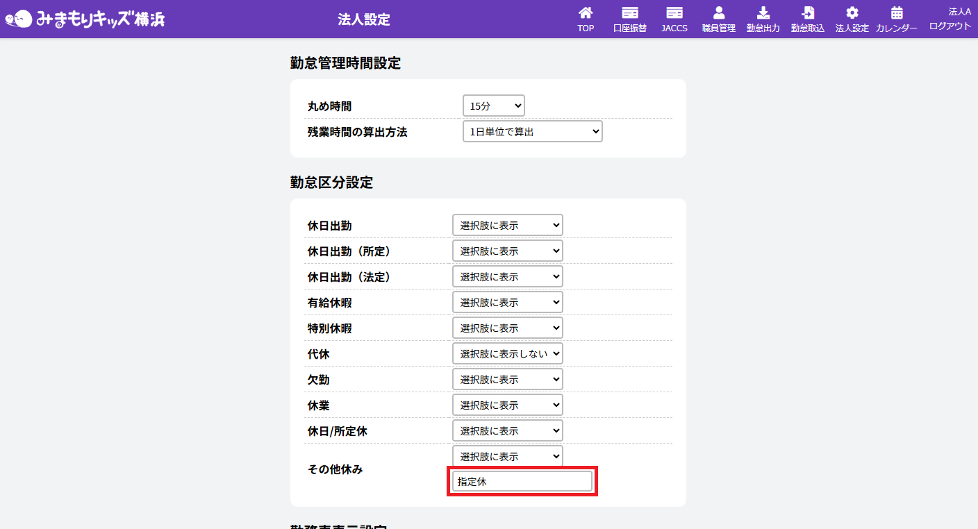 勤怠区分の選択肢の「その他休み」の名称を変更できるようになりました。