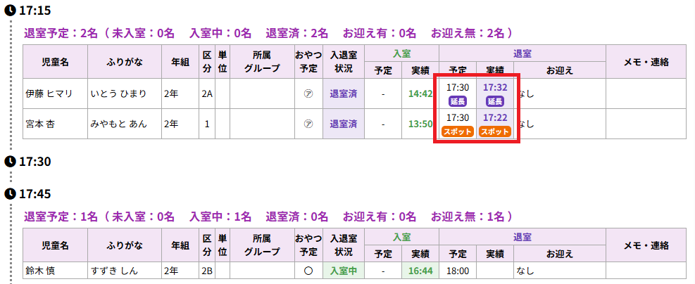 ※予定時刻の下は退室予定時刻をもとに、退室実績の下は実際の入退室時刻をもとにしているため、片方が「スポット/延長」と表示され、もう片方は表示されていない場合もあります。