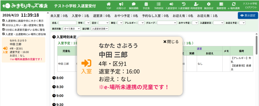 【入退室受付画面】e-場所システムと紐づいていない児童・職員が入退室した際に警告が表示されるようになりました