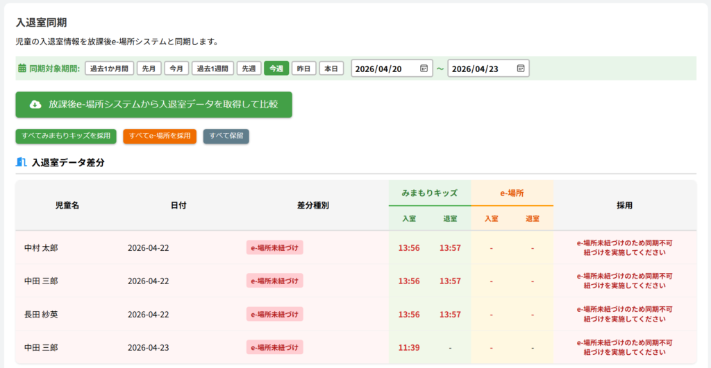 【e-場所システム連携画面】入退室同期・出退勤同期でe-場所システムと紐づいていない児童・職員が表示されるようになりました