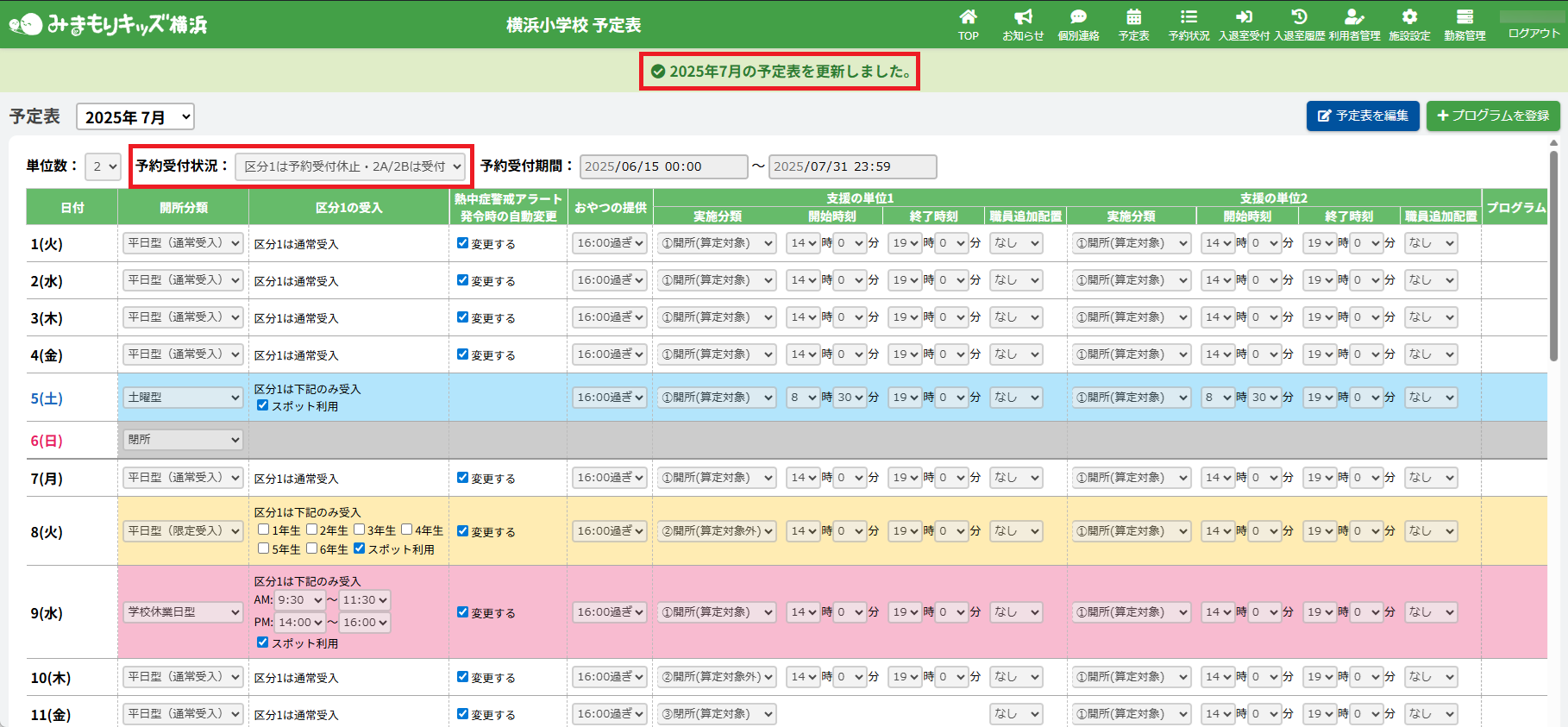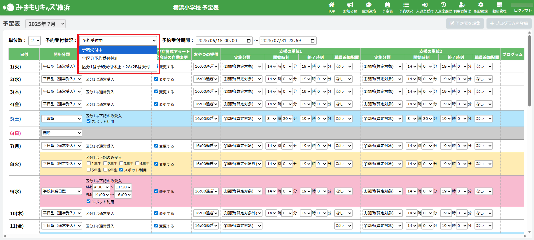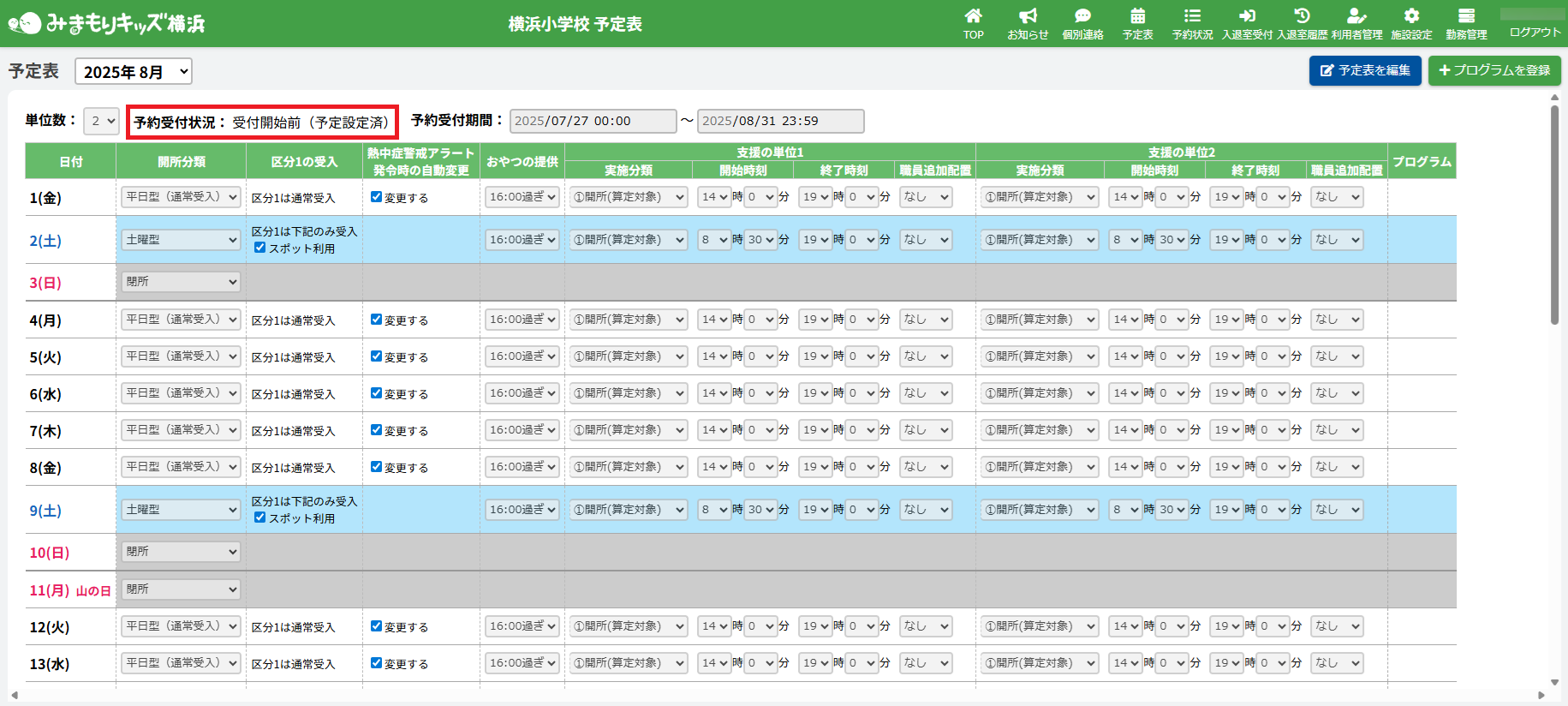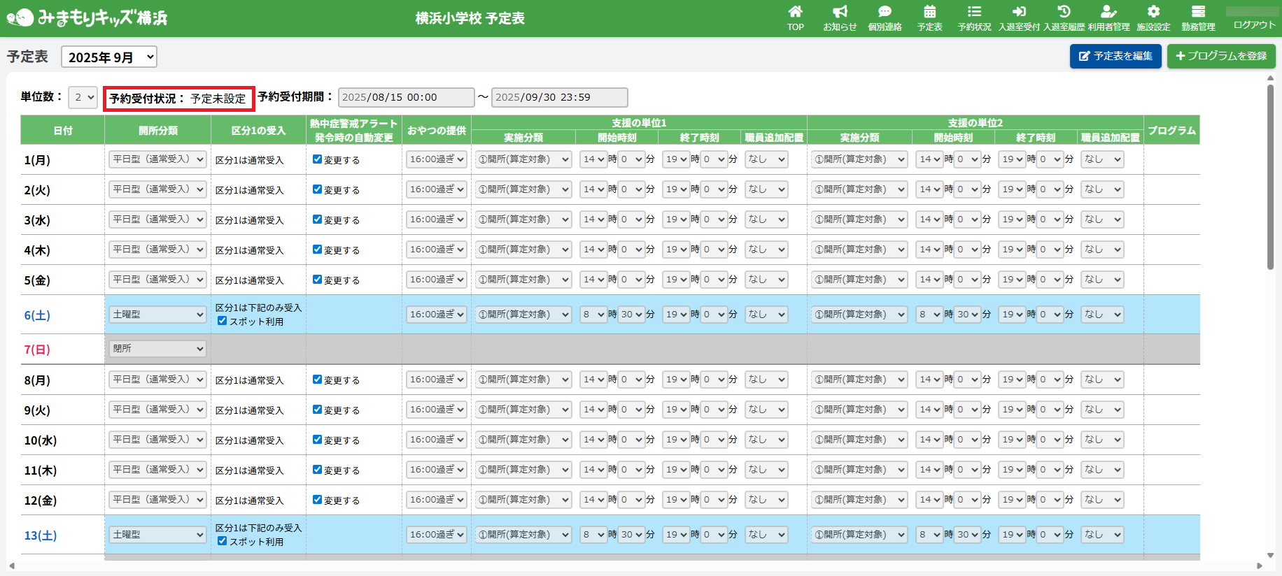 「予定未設定」の状態では保護者の利用予約を受け付けません。(保護者はその月の利用予約を行えません。)
