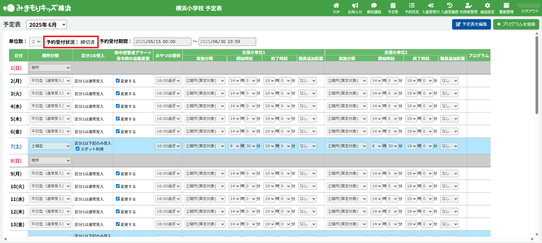 予約受付期間より後に予定表を開くと、予約受付状況は「締切済」となります。