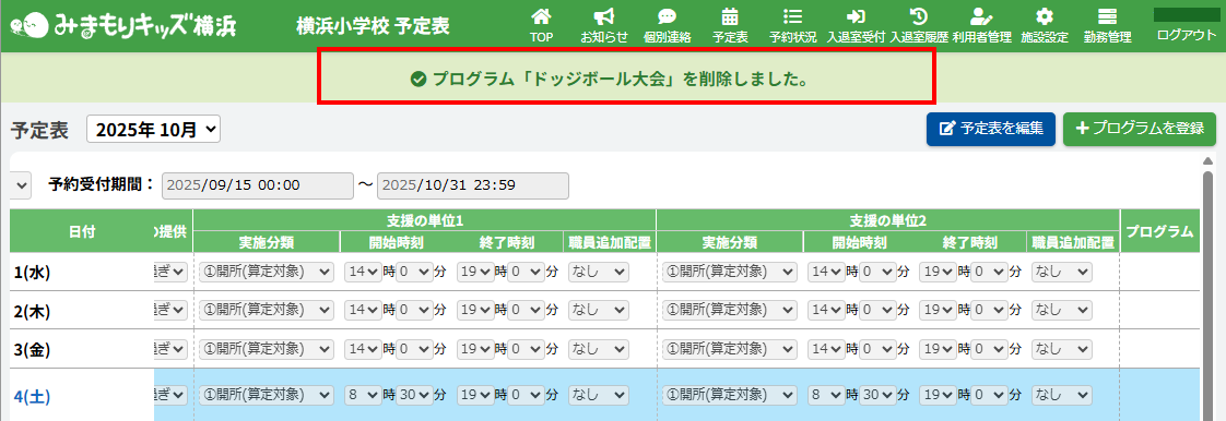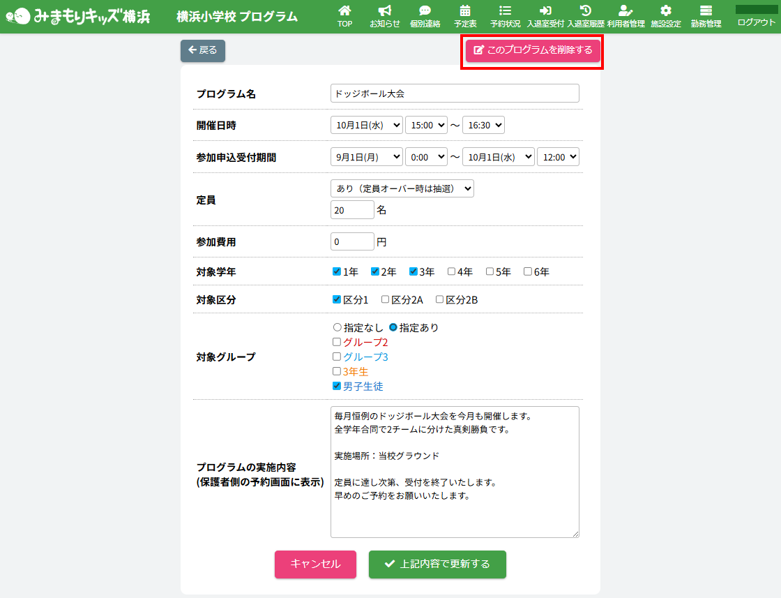 予定表から編集したい【プログラム名称】ボタンをクリックしてください。(例:ドッジボール大会)