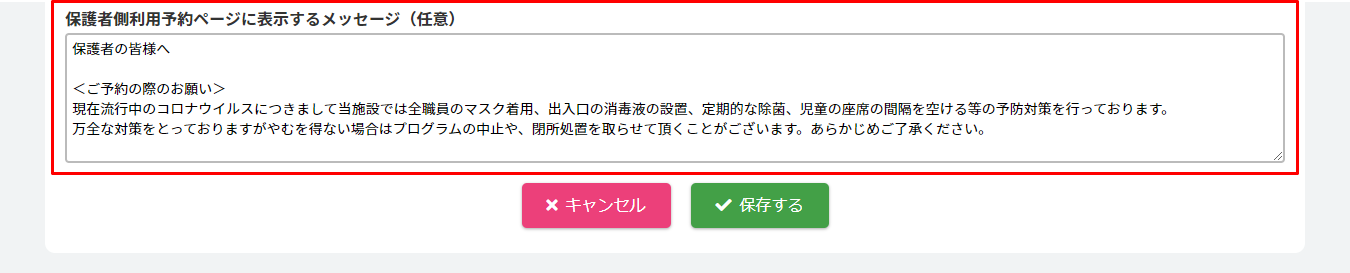 10.保護者側利用予約ページに表示するメッセージを入力する