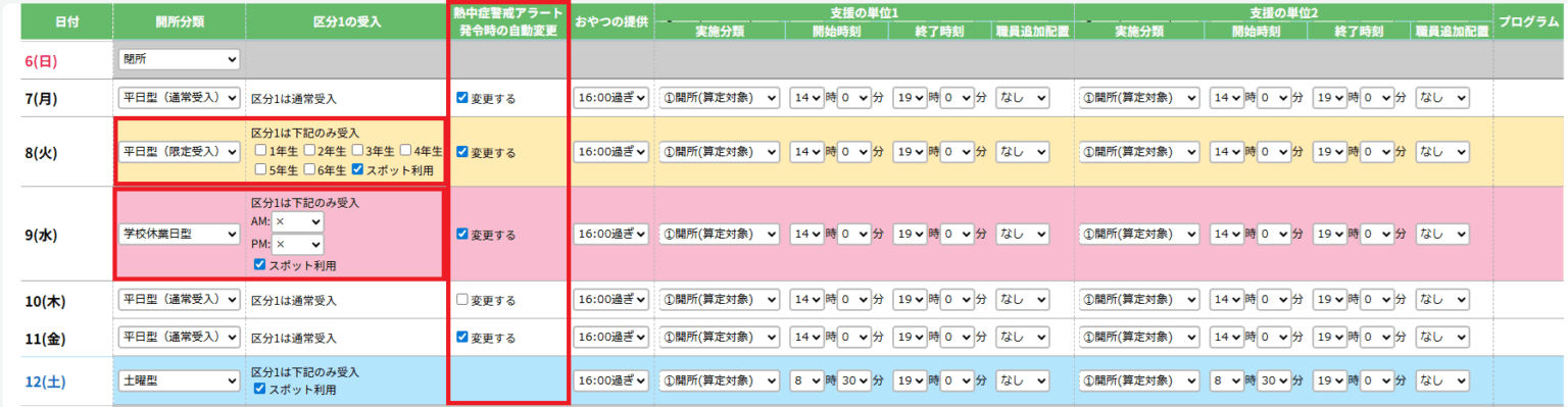 熱中症警戒アラート発令時の自動変更の欄から、開所分類と区分1の受入の自動変更の有無の設定を行うことができます。