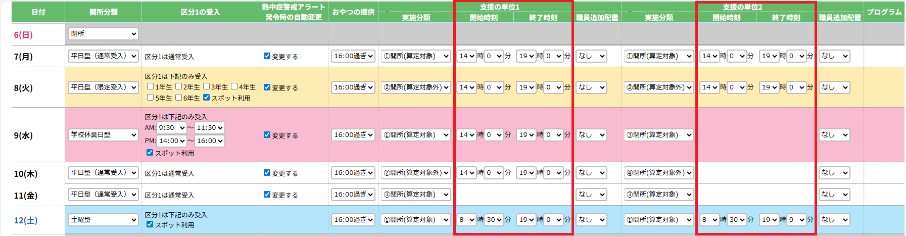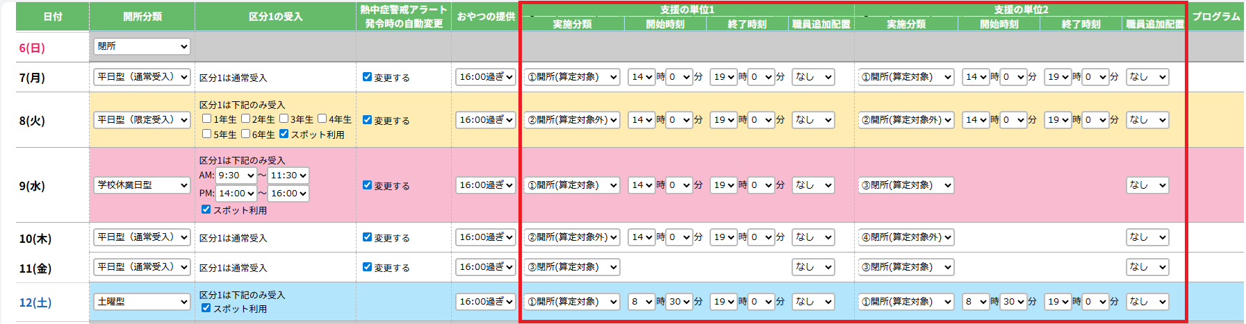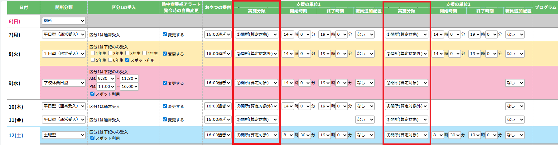 (平日・土曜日に閉所する場合は、全ての支援の単位の実施分類にて「③閉所(算定対象)」または「④閉所(算定対象外)」を選択してください。)
