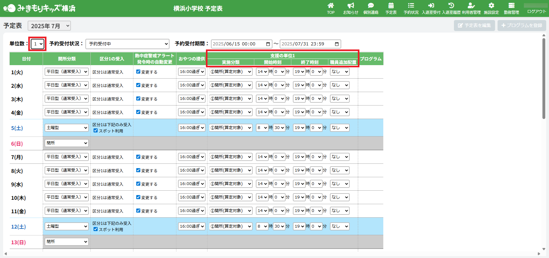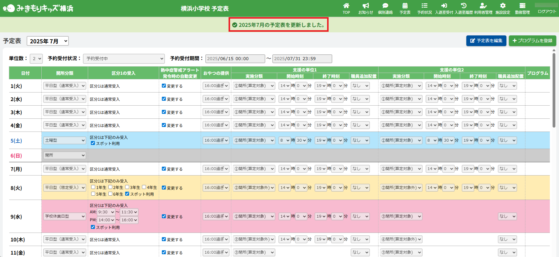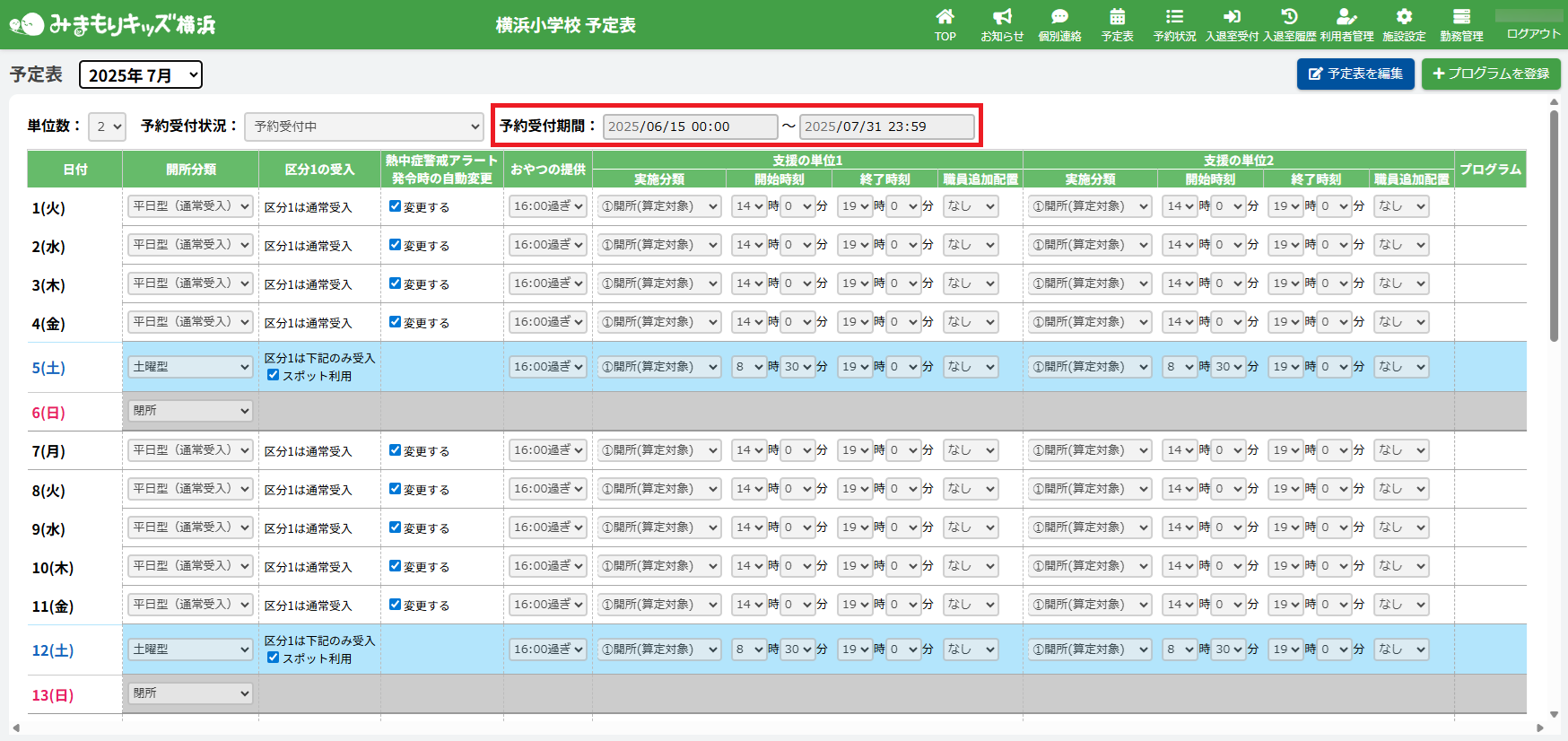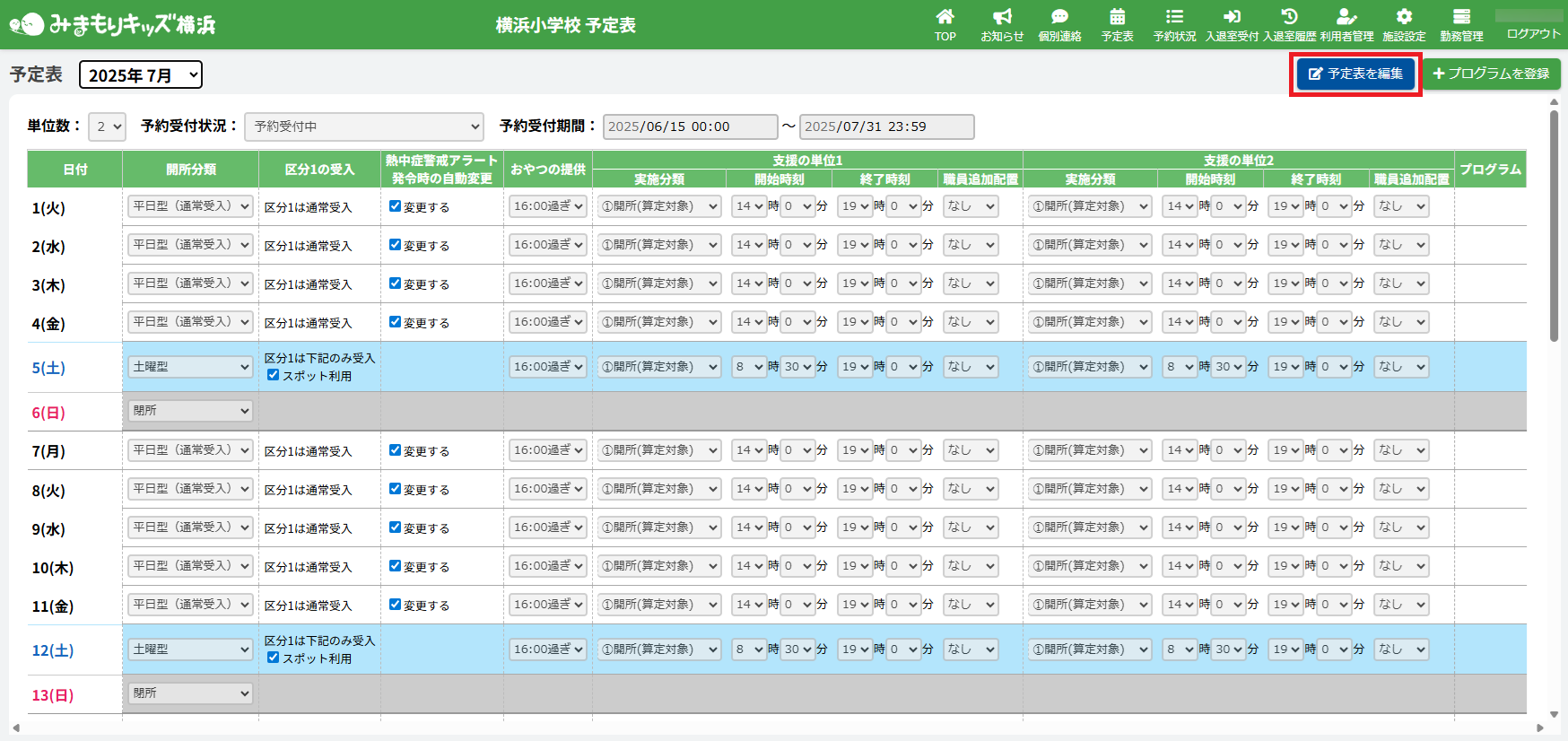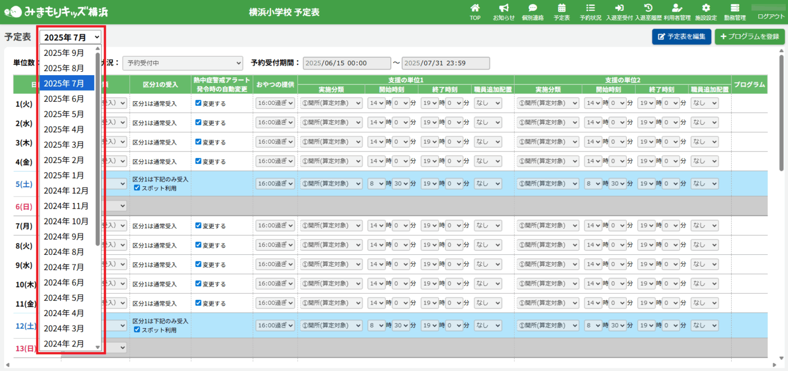 ※一度も予定表の編集を行っていないと「予定未設定」と表示され、保護者が利用予約できません。