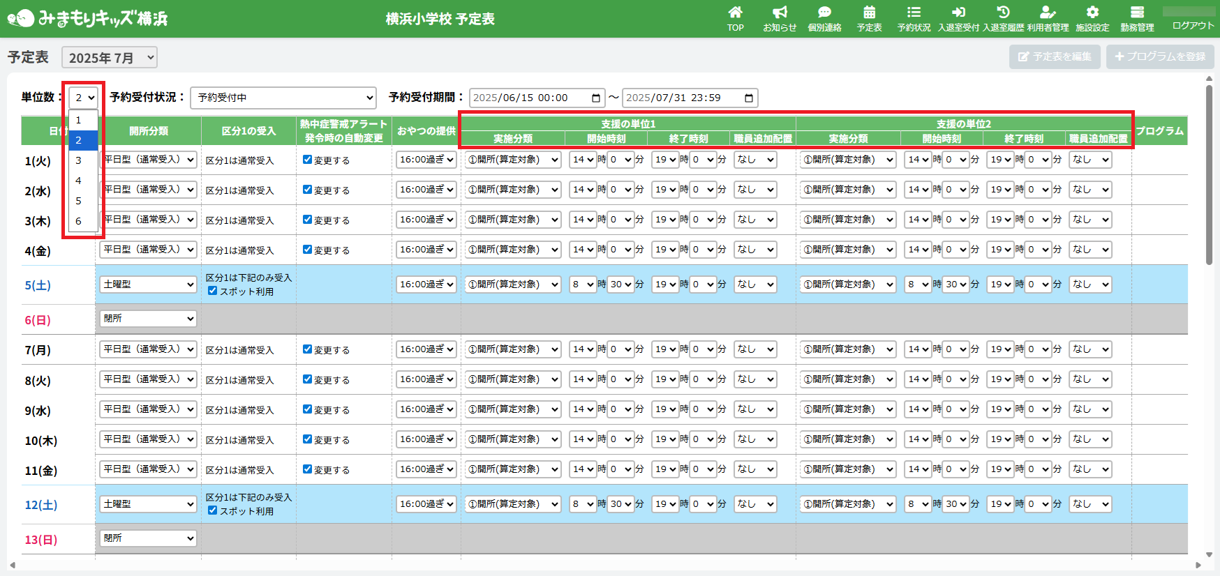 画面左上にある「単位数」からその月に開所する予定の単位数を選択してください。