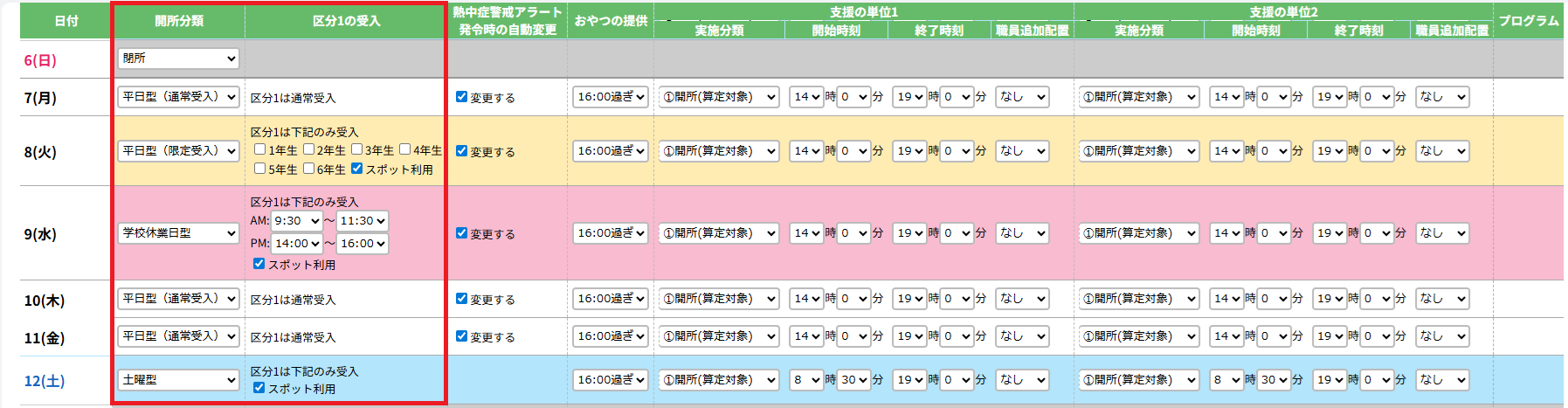 開所分類の欄から、1日ごとに開所設定・区分1の受入設定を行うことができます。詳しくは下記の表をご確認ください。