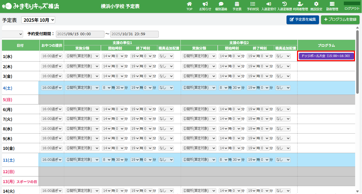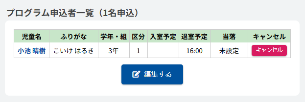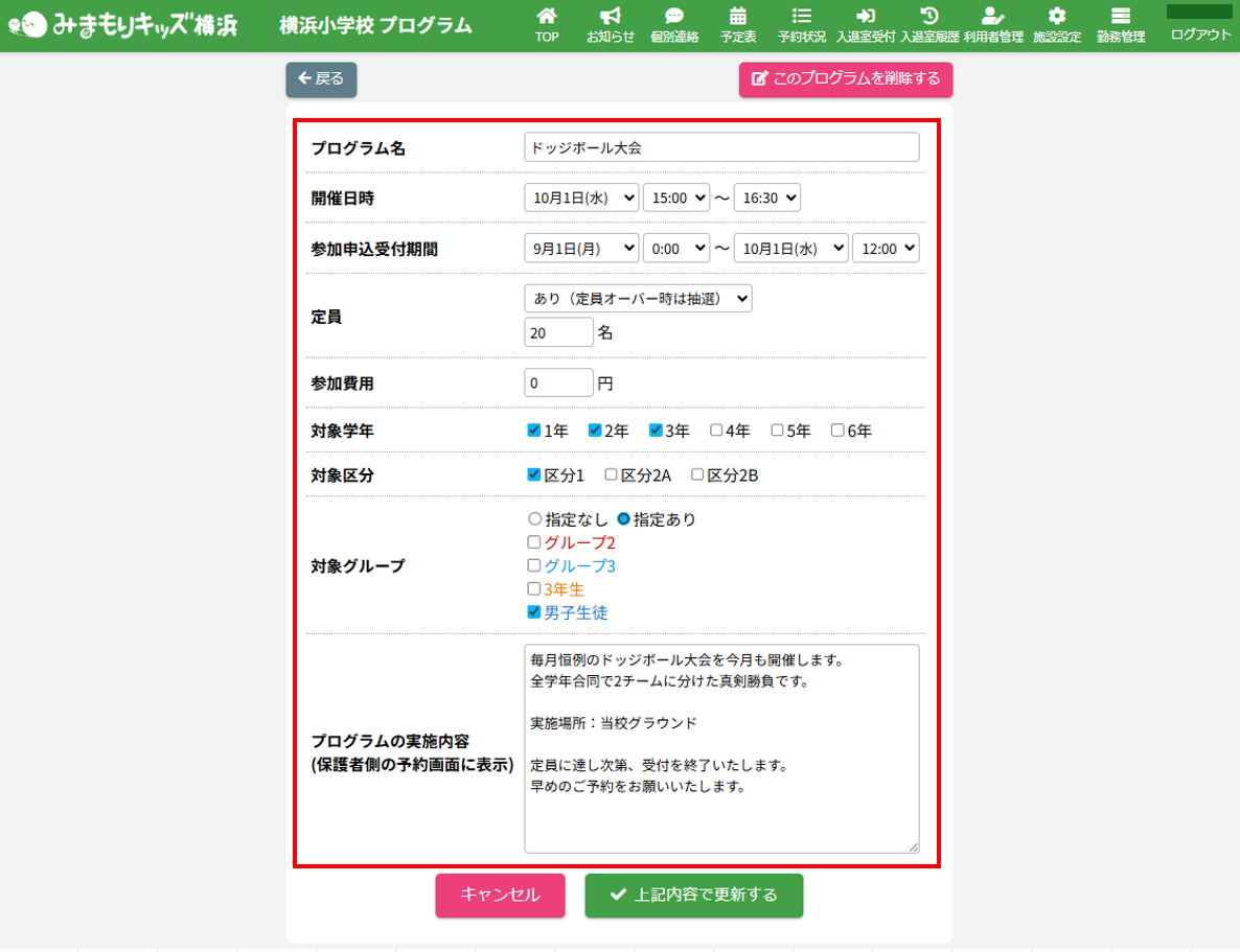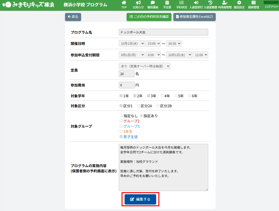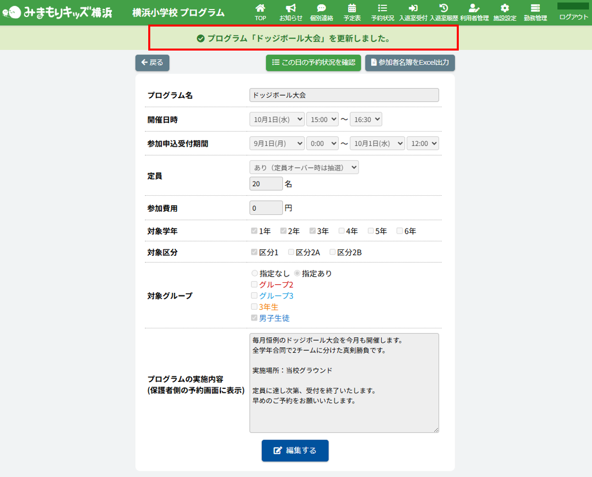 HOME > 予定表 > プログラムを編集する プログラムを編集する 1.プログラム内容の確認画面を開く 予定表から編集したい【プログラム名称】ボタンをクリックしてください。(例:ドッジボール大会) 2.プログラム編集フォームを開く 画面下部にある【編集する】ボタンをクリックしてください。 3.登録内容を変更する 各項目に沿って変更したい内容を入力、選択してください。 4.更新を実行する 【上記内容で更新する】ボタンをクリックして、入力した内容で更新します。 5.編集の完了 画面上部に表示される更新のアナウンスを確認してください。 <プログラム参加予定者一覧について> プログラムに参加予定の児童の一覧を確認することができます。 ≪ プログラムを登録する プログラムを抽選する ≫