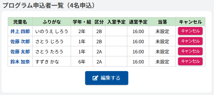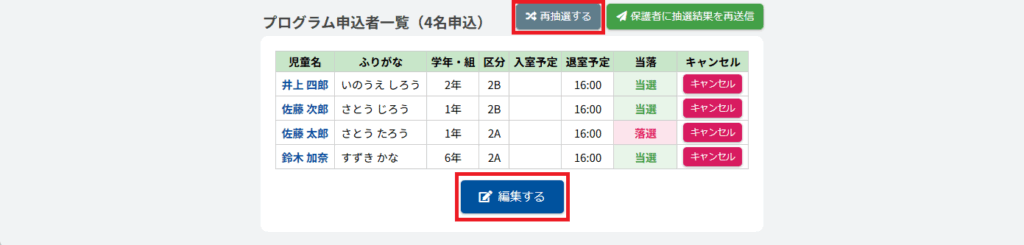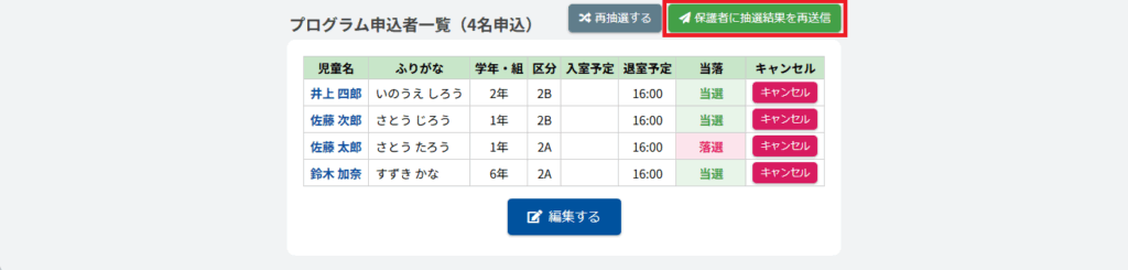 4.プログラム参加予定者一覧の右上にあるボタンが【保護者に抽選結果を再送信】ボタンに切り替わります。