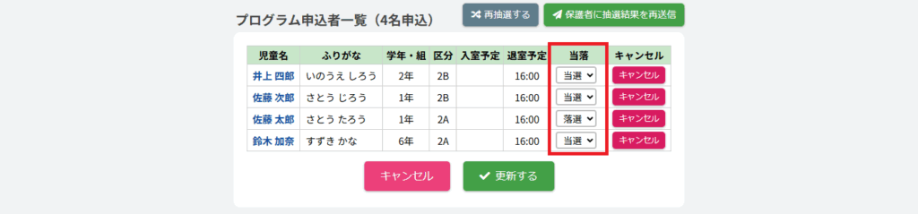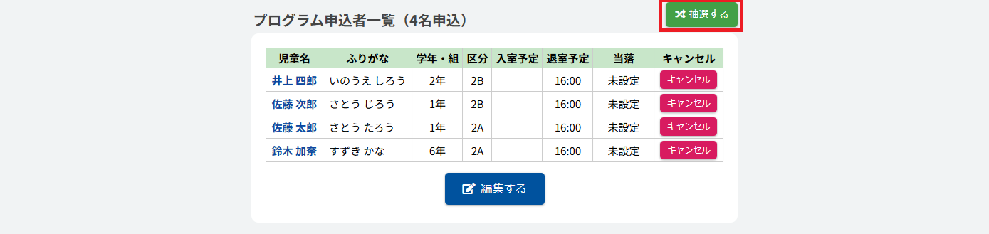 1.プログラム参加予定者一覧の右上にある【抽選する】ボタンを押すことで抽選が行われます。